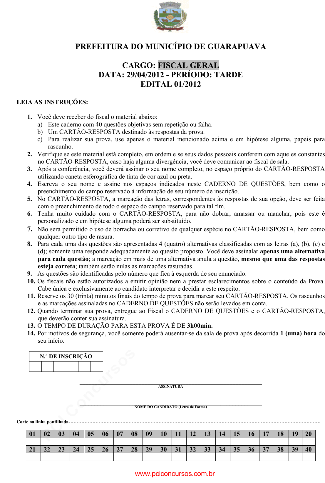 pcimarkpci MDAwMDowMDAwOjAwMDA6MDAwMDowMDAwOmZmZmY6YmFmOTpiNDVi:VGh1LCAyMyBKYW4gMjAyNSAxMTowOTo1NyAtMDMwMA== www.pciconcursos.com.br PREFEITURA DO MUNICÍPIO DE GUARAPUAVA CARGO: FISCAL GERAL DATA: 29/04/2012 - PERÍODO: TARDE EDITAL 01/2012 LEIA AS INSTRUÇÕES: 1. Você deve receber do fiscal o material abaixo: a) Este caderno com 40 questões objetivas sem repetição ou falha. b) Um CARTÃO-RESPOSTA destinado às respostas da prova. c) Para realizar sua prova, use apenas o material mencionado acima e em hipótese alguma, papéis para rascunho. 2. Verifique se este material está completo, em ordem e se seus dados pessoais conferem com aqueles constantes no CARTÃO-RESPOSTA, caso haja alguma divergência, você deve comunicar ao fiscal de sala. 3. Após a conferência, você deverá assinar o seu nome completo, no espaço próprio do CARTÃO-RESPOSTA utilizando caneta esferográfica de tinta de cor azul ou preta. 4. Escreva o seu nome e assine nos espaços indicados neste CADERNO DE QUESTÕES, bem como o preenchimento do campo reservado à informação de seu número de inscrição. 5. No CARTÃO-RESPOSTA, a marcação das letras, correspondentes às respostas de sua opção, deve ser feita com o preenchimento de todo o espaço do campo reservado para tal fim. 6. Tenha muito cuidado com o CARTÃO-RESPOSTA, para não dobrar, amassar ou manchar, pois este é personalizado e em hipótese alguma poderá ser substituído. 7. Não será permitido o uso de borracha ou corretivo de qualquer espécie no CARTÃO-RESPOSTA, bem como qualquer outro tipo de rasura. 8. Para cada uma das questões são apresentadas 4 (quatro) alternativas classificadas com as letras (a), (b), (c) e (d); somente uma responde adequadamente ao quesito proposto. Você deve assinalar apenas uma alternativa para cada questão; a marcação em mais de uma alternativa anula a questão, mesmo que uma das respostas esteja correta; também serão nulas as marcações rasuradas. 9. As questões são identificadas pelo número que fica à esquerda de seu enunciado. 10. Os fiscais não estão autorizados a emitir opinião nem a prestar esclarecimentos sobre o conteúdo da Prova. Cabe única e exclusivamente ao candidato interpretar e decidir a este respeito. 11. Reserve os 30 (trinta) minutos finais do tempo de prova para marcar seu CARTÃO-RESPOSTA. Os rascunhos e as marcações assinaladas no CADERNO DE QUESTÕES não serão levados em conta. 12. Quando terminar sua prova, entregue ao Fiscal o CADERNO DE QUESTÕES e o CARTÃO-RESPOSTA, que deverão conter sua assinatura. 13. O TEMPO DE DURAÇÃO PARA ESTA PROVA É DE 3h00min. 14. Por motivos de segurança, você somente poderá ausentar-se da sala de prova após decorrida 1 (uma) hora do seu início. N.º DE INSCRIÇÃO ______________________________________________________________ ASSINATURA ______________________________________________________________ NOME DO CANDIDATO (Letra de Forma) Corte na linha pontilhada- - - - - - - - - - - - - - - - - - - - - - - - - - - - - - - - - - - - - - - - - - - - - - - - - - - - - - - - - - - - - - - - - - - - - - - - - - - - - - - - - - - - - - - - - - - - 01 02 03 04 05 06 07 08 09 10 11 12 13 14 15 16 17 18 19 20 21 22 23 24 25 26 27 28 29 30 31 32 33 34 35 36 37 38 39 40 www.pciconcursos.com.br pcimarkpci MDAwMDowMDAwOjAwMDA6MDAwMDowMDAwOmZmZmY6YmFmOTpiNDVi:VGh1LCAyMyBKYW4gMjAyNSAxMTowOTo1NyAtMDMwMA== www.pciconcursos.com.br A Formiga e a Pomba Uma Formiga estava na margem de um rio bebendo água, e sendo arrastada pela forte correnteza, estava prestes a se afogar. Uma Pomba, que estava em uma árvore, sobre a água observando tudo, arranca uma folha e a deixa cair na correnteza perto da mesma. Subindo na folha a Formiga flutua em segurança até a margem. Eis que pouco tempo depois, um caçador de pássaros, escondido pelas folhas da árvore, se prepara para apanhar a Pomba, colocando visgo no galho onde ela descansa, sem que ela perceba o perigo. A Formiga, percebendo sua intenção, dá-lhe uma ferroada no pé. Do susto, ele deixa cair sua armadilha de visgo, e isso dá chance para que a Pomba acorde e voe para longe, a salvo. Autor: Esopo Moral da História: Quem é grato de coração, sempre encontrará uma oportunidade para demonstrar sua gratidão. As fábulas sempre trazem uma lição de moral, responda as questões abaixo: 01 - Segundo o texto assinale a alternativa que justifique a ajuda da Pomba a Formiga: a) A pomba esperava ser recompensada. b) A pomba ajudou, pois estava observando o fato, e percebeu que a Formiga correia perigo. c) A Formiga começou a gritar e a pedir socorro e então a Pomba se sensibilizou e resolveu ajudá-la. d) A Pomba devia um favor para a Formiga. 02 - Os verbos desempenham uma função de ação, assinale a alternativa correspondente a ação do verbo “apanhar”, no texto: a) ser espancado: apanhar uma surra. c) prender: apanhar um ladrão. b) contrair: apanhar uma moléstia. d) agarrar, prender. 03 - Na expressão “dá-lhe”, identifique nas alternativas abaixo o pronome “lhe”: a) pronome pessoal do caso reto. c) pronome obliquo átonos. b) pronome indefinido. d) pronome obliquo tônico. 04 - Assinale a justificativa correta na concordância nominal “a salvo”: a) Por ser “salvo” considerado um adjetivo variável. b) Por ser “salvo” considerado uma preposição. c) A colocação está incorreta, sendo que a concordância correta seria: a salva. d) Nenhuma das alternativas anteriores. 05 - Qual a diferença entre as colocações: “Uma Formiga” e “A Formiga”: a) Não há diferença nenhuma. b) Uma é um artigo indefinido e “a” é um artigo definido. c) Uma Formiga é a formiga amiga e A Formiga é a conhecida. d) Uma Formiga abrange a classe de formigas e A Formiga é desconhecida da Pomba. 06 - Assinale a alternativa em que aparecem corretamente o plural das seguintes palavras: arrasta, afogar, margem, folha, intenção: a) arrastas, afogas, margems, folhas, intenç