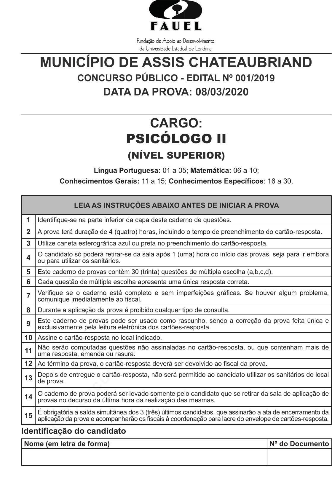 pcimarkpci MDAwMDowMDAwOjAwMDA6MDAwMDowMDAwOmZmZmY6YmFmOTpiNDVi:VGh1LCAyMyBKYW4gMjAyNSAxMTo1NTozNyAtMDMwMA== www.pciconcursos.com.br MUNICÍPIO DE ASSIS CHATEAUBRIAND CONCURSO PÚBLICO - EDITAL Nº 001/2019 DATA DA PROVA: 08/03/2020 CARGO: PSICÓLOGO II (NÍVEL SUPERIOR) Língua Portuguesa: 01 a 05; Matemática: 06 a 10; Conhecimentos Gerais: 11 a 15; Conhecimentos Específi cos: 16 a 30. LEIA AS INSTRUÇÕES ABAIXO ANTES DE INICIAR A PROVA 1 Identifi que-se na parte inferior da capa deste caderno de questões. 2 A prova terá duração de 4 (quatro) horas, incluindo o tempo de preenchimento do cartão-resposta. 3 Utilize caneta esferográfi ca azul ou preta no preenchimento do cartão-resposta. 4 O candidato só poderá retirar-se da sala após 1 (uma) hora do início das provas, seja para ir embora ou para utilizar os sanitários. 5 Este caderno de provas contém 30 (trinta) questões de múltipla escolha (a,b,c,d). 6 Cada questão de múltipla escolha apresenta uma única resposta correta. 7 Verifi que se o caderno está completo e sem imperfeições gráfi cas. Se houver algum problema, comunique imediatamente ao fi scal. 8 Durante a aplicação da prova é proibido qualquer tipo de consulta. 9 Este caderno de provas pode ser usado como rascunho, sendo a correção da prova feita única e exclusivamente pela leitura eletrônica dos cartões-resposta. 10 Assine o cartão-resposta no local indicado. 11 Não serão computadas questões não assinaladas no cartão-resposta, ou que contenham mais de uma resposta, emenda ou rasura. 12 Ao término da prova, o cartão-resposta deverá ser devolvido ao fi scal da prova. 13 Depois de entregue o cartão-resposta, não será permitido ao candidato utilizar os sanitários do local de prova. 14 O caderno de prova poderá ser levado somente pelo candidato que se retirar da sala de aplicação de provas no decurso da última hora da realização das mesmas. 15 É obrigatória a saída simultânea dos 3 (três) últimos candidatos, que assinarão a ata de encerramento da aplicação da prova e acompanharão os fi scais à coordenação para lacre do envelope de cartões-resposta. Identifi cação do candidato Nome (em letra de forma) Nº do Documento pcimarkpci MDAwMDowMDAwOjAwMDA6MDAwMDowMDAwOmZmZmY6YmFmOTpiNDVi:VGh1LCAyMyBKYW4gMjAyNSAxMTo1NTozNyAtMDMwMA== www.pciconcursos.com.br QUESTÕES DE 1 A 5 - LÍNGUA PORTUGUESA 01. O trecho a seguir foi extraído da obra ‘Memórias do Cárcere’, de Graciliano Ramos. Leia-o atentamente para responder às próximas questões. “Nunca tivemos censura prévia em obra de arte. Efe- tivamente se queimaram alguns livros, mas foram ra- ríssimos esses autos-de-fé. Em geral a reação se li- mitou a suprimir ataques diretos, palavras de ordem, tiradas demagógicas, e disto escasso prejuízo veio à produção literária. Certos escritores se desculpam de não haverem forjado coisas excelentes por fal- ta de liberdade - talvez ingênuo recurso de justificar inépcia ou preguiça. Liberdade completa ninguém desfruta: começamos oprimidos pela sintaxe e aca- bamos às voltas com a Delegacia de Ordem Política e Social, mas, nos estreitos limites a que nos coa- gem a gramática e a lei, ainda nos podemos mexer”. Em relação à interpretação do texto, pode-se afirmar que o autor: a) denuncia a prática dos governos autoritários bra- sileiros de censurarem previamente as obras de arte. b) se queixa de que, se não fossem os ataques do Es- tado, a qualidade da nossa literatura seria bem maior. c) argumenta que a ausência de liberdade total não foi um grande obstáculo à produção literária de alta qualidade. d) indica duas barreiras que impediram por completo o desenvolvimento da literatura nacional: a gramática e a lei. ___________________________________________ 02. O trecho destacado se inicia com a afirmação de que “nunca tivemos censura prévia em obra de arte”. Em relação ao sujeito dessa oração, pode-se afirmar que: a) está oculto. b) é composto. c) é inexistente. d) está invertido. ___________________________________________ 03. Analise as alternativas a seguir e assinale a que NÃO contém uma palavra que pode ser classificada foneticamente como proparoxítona. a) Gramática. b) Raríssimos. c) Efetivamente. d) Demagógicas. ___________________________________________ 04. Uma das afirmações do autor no trecho destacado é que “liberdade completa ninguém desfruta”. A respei- to da estrutura sintática dessa oração, marque a alter- nativa CORRETA. a) Tanto o sujeito como o objeto da oração são com- postos. b) O termo “completa” desempenha a função de nú- cleo do sujeito. c) A função de sujeito da oração é desempenhada pelo termo “ninguém”. d) A expressão “liberdade completa” exerce a função de sujeito composto da oração. ___________________________________________ 05. Ainda em relação à interpretação do texto, ao ale- gar que os escritores são “oprimidos pela sintaxe”, o autor pretende enfatizar que: a) a censura estatal é capaz de utilizar diferentes re- cursos para promover a perseguição aos artistas. b) a produção literária jamais é completamente livre, pois obedece a certas normas gramaticais. c) os erros gramaticais podem se tornar um pretexto para que o Estado ditatorial censure as obras literárias. d) os rigores das normas ortográficas são o principal impedimento à produção literária em qualquer país. ___________________________________________ QUESTÕES DE 6 A 10 - MATEMÁTICA 06. Algumas unidades de medidas são mais utilizadas no Brasil. Sobre unidades de quantidade de matéria (massa), assinale a alternativa CORRETA: a) Um grama equivale a mil miligramas. b) Massa é, no Brasil, preferencialmente medida em litros. c) A unidade de massa “quilograma” abrevia-se como “KG”, em letras maiúsculas. d) Não é possível representar, no sistema de medidas brasileiro, massas inferiores a um micrograma. __________