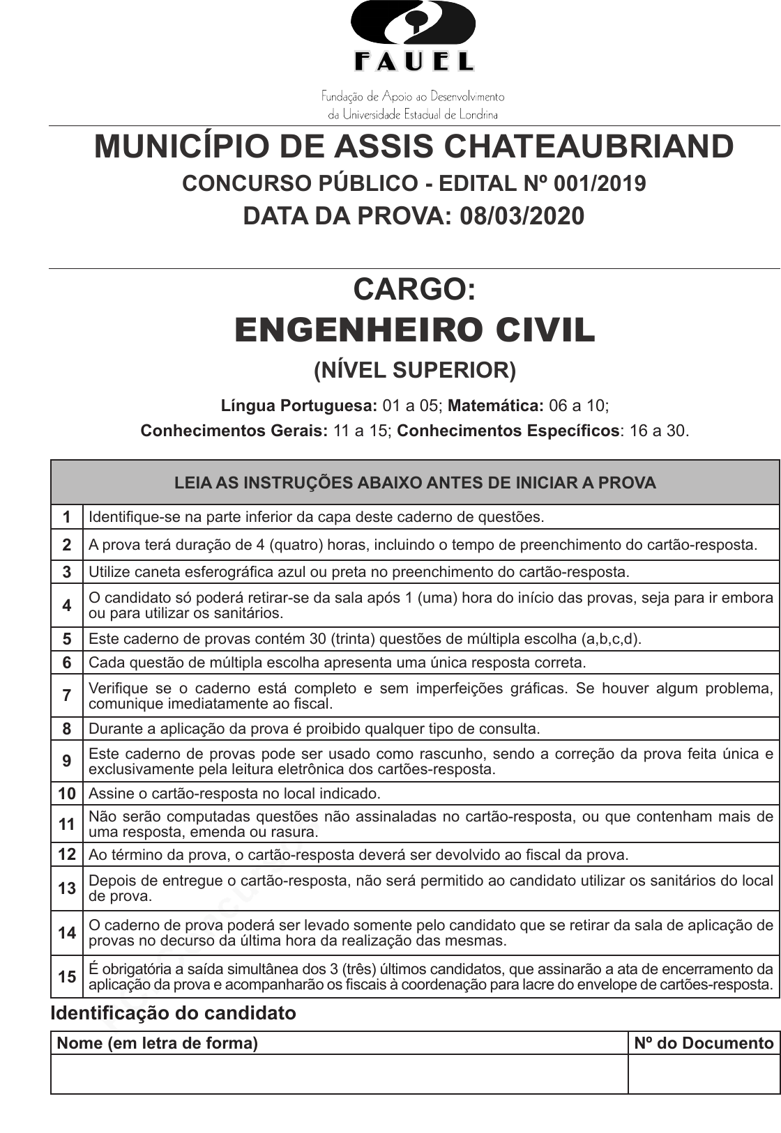 pcimarkpci MDAwMDowMDAwOjAwMDA6MDAwMDowMDAwOmZmZmY6YmFmOTpiNDVi:VGh1LCAyMyBKYW4gMjAyNSAxMTo1NDozNSAtMDMwMA== www.pciconcursos.com.br MUNICÍPIO DE ASSIS CHATEAUBRIAND CONCURSO PÚBLICO - EDITAL Nº 001/2019 DATA DA PROVA: 08/03/2020 CARGO: ENGENHEIRO CIVIL (NÍVEL SUPERIOR) Língua Portuguesa: 01 a 05; Matemática: 06 a 10; Conhecimentos Gerais: 11 a 15; Conhecimentos Específicos: 16 a 30. LEIA AS INSTRUÇÕES ABAIXO ANTES DE INICIAR A PROVA 1 Identifique-se na parte inferior da capa deste caderno de questões. 2 A prova terá duração de 4 (quatro) horas, incluindo o tempo de preenchimento do cartão-resposta. 3 Utilize caneta esferográfica azul ou preta no preenchimento do cartão-resposta. 4 O candidato só poderá retirar-se da sala após 1 (uma) hora do início das provas, seja para ir embora ou para utilizar os sanitários. 5 Este caderno de provas contém 30 (trinta) questões de múltipla escolha (a,b,c,d). 6 Cada questão de múltipla escolha apresenta uma única resposta correta. 7 Verifique se o caderno está completo e sem imperfeições gráficas. Se houver algum problema, comunique imediatamente ao fiscal. 8 Durante a aplicação da prova é proibido qualquer tipo de consulta. 9 Este caderno de provas pode ser usado como rascunho, sendo a correção da prova feita única e exclusivamente pela leitura eletrônica dos cartões-resposta. 10 Assine o cartão-resposta no local indicado. 11 Não serão computadas questões não assinaladas no cartão-resposta, ou que contenham mais de uma resposta, emenda ou rasura. 12 Ao término da prova, o cartão-resposta deverá ser devolvido ao fiscal da prova. 13 Depois de entregue o cartão-resposta, não será permitido ao candidato utilizar os sanitários do local de prova. 14 O caderno de prova poderá ser levado somente pelo candidato que se retirar da sala de aplicação de provas no decurso da última hora da realização das mesmas. 15 É obrigatória a saída simultânea dos 3 (três) últimos candidatos, que assinarão a ata de encerramento da aplicação da prova e acompanharão os fiscais à coordenação para lacre do envelope de cartões-resposta. Identificação do candidato Nome (em letra de forma) Nº do Documento pcimarkpci MDAwMDowMDAwOjAwMDA6MDAwMDowMDAwOmZmZmY6YmFmOTpiNDVi:VGh1LCAyMyBKYW4gMjAyNSAxMTo1NDozNSAtMDMwMA== www.pciconcursos.com.br QUESTÕES DE 1 A 5 - LÍNGUA PORTUGUESA 01. O trecho a seguir foi extraído da obra ‘Memórias do Cárcere’, de Graciliano Ramos. Leia-o atentamente para responder às próximas questões. “Nunca tivemos censura prévia em obra de arte. Efe- tivamente se queimaram alguns livros, mas foram ra- ríssimos esses autos-de-fé. Em geral a reação se li- mitou a suprimir ataques diretos, palavras de ordem, tiradas demagógicas, e disto escasso prejuízo veio à produção literária. Certos escritores se desculpam de não haverem forjado coisas excelentes por fal- ta de liberdade - talvez ingênuo recurso de justificar inépcia ou preguiça. Liberdade completa ninguém desfruta: começamos oprimidos pela sintaxe e aca- bamos às voltas com a Delegacia de Ordem Política e Social, mas, nos estreitos limites a que nos coa- gem a gramática e a lei, ainda nos podemos mexer”. Em relação à interpretação do texto, pode-se afirmar que o autor: a) denuncia a prática dos governos autoritários bra- sileiros de censurarem previamente as obras de arte. b) se queixa de que, se não fossem os ataques do Es- tado, a qualidade da nossa literatura seria bem maior. c) argumenta que a ausência de liberdade total não foi um grande obstáculo à produção literária de alta qualidade. d) indica duas barreiras que impediram por completo o desenvolvimento da literatura nacional: a gramática e a lei. ___________________________________________ 02. O trecho destacado se inicia com a afirmação de que “nunca tivemos censura prévia em obra de arte”. Em relação ao sujeito dessa oração, pode-se afirmar que: a) está oculto. b) é composto. c) é inexistente. d) está invertido. ___________________________________________ 03. Analise as alternativas a seguir e assinale a que NÃO contém uma palavra que pode ser classificada foneticamente como proparoxítona. a) Gramática. b) Raríssimos. c) Efetivamente. d) Demagógicas. ___________________________________________ 04. Uma das afirmações do autor no trecho destacado é que “liberdade completa ninguém desfruta”. A respei- to da estrutura sintática dessa oração, marque a alter- nativa CORRETA. a) Tanto o sujeito como o objeto da oração são com- postos. b) O termo “completa” desempenha a função de nú- cleo do sujeito. c) A função de sujeito da oração é desempenhada pelo termo “ninguém”. d) A expressão “liberdade completa” exerce a função de sujeito composto da oração. ___________________________________________ 05. Ainda em relação à interpretação do texto, ao ale- gar que os escritores são “oprimidos pela sintaxe”, o autor pretende enfatizar que: a) a censura estatal é capaz de utilizar diferentes re- cursos para promover a perseguição aos artistas. b) a produção literária jamais é completamente livre, pois obedece a certas normas gramaticais. c) os erros gramaticais podem se tornar um pretexto para que o Estado ditatorial censure as obras literárias. d) os rigores das normas ortográficas são o principal impedimento à produção literária em qualquer país. ___________________________________________ QUESTÕES DE 6 A 10 - MATEMÁTICA 06. Algumas unidades de medidas são mais utilizadas no Brasil. Sobre unidades de quantidade de matéria (massa), assinale a alternativa CORRETA: a) Um grama equivale a mil miligramas. b) Massa é, no Brasil, preferencialmente medida em litros. c) A unidade de massa “quilograma” abrevia-se como “KG”, em letras maiúsculas. d) Não é possível representar, no sistema de medidas brasileiro, massas inferiores a um micrograma. ________________