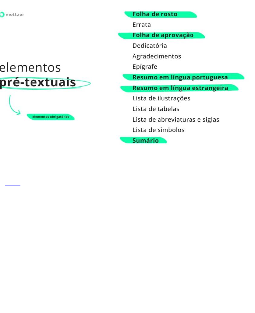 Normas ABNT: como fazer a formatação de trabalhos acadêmicos da maneira correta Capa A capa é o primeiro elemento obrigatório da estrutura de um trabalho acadêmico e serve para apresentar e identificar a pesquisa. Para te auxiliar, preparamos um modelo de capa, com toda formatação nas normas da ABNT. A ABNT NBR 14724 estabelece que é necessário que a capa compreenda nessa ordem: Nome da instituição de ensino Formatação: Alinhamento centralizado Fonte Times New Roman ou Arial Tamanho da letra 12 Letras maiúsculas e sem destaque As margens devem ser de 3 cm superior e esquerda e 2 cm inferior e direita. https://blog.mettzer.com/capa-abnt/ https://www.mettzer.com/modelo/capa https://blog.mettzer.com/nbr-14724/ https://blog.mettzer.com/margens-espacamento-normas-abnt/ Nome do curso Formatação: Alinhamento centralizado Fonte Times New Roman ou Arial Tamanho da letra 12 Letras maiúsculas e sem destaque As margens devem ser de 3 cm superior e esquerda e 2 cm inferior e direita. Nome do autor ou autora do trabalho Formatação: Alinhamento centralizado Fonte Times New Roman ou Arial Tamanho da letra 12 Letras maiúsculas e sem destaque As margens devem ser de 3 cm superior e esquerda e 2 cm inferior e direita. Título do trabalho O título do trabalho é fundamental para apresentar o tema do seu trabalho. Formatação: Alinhamento centralizado Fonte Times New Roman ou Arial Tamanho da letra 12 Letras maiúsculas e em negrito As margens devem ser de 3 cm superior e esquerda e 2 cm inferior e direita. Subtítulo Formatação: Alinhamento centralizado Fonte Times New Roman ou Arial Tamanho da letra 12 Letras maiúsculas e sem destaque As margens devem ser de 3 cm superior e esquerda e 2 cm inferior e direita. Número de volumes Formatação: Alinhamento centralizado Fonte Times New Roman ou Arial Tamanho da letra 12 Letras maiúsculas e sem destaque As margens devem ser de 3 cm superior e esquerda e 2 cm inferior e direita. Local da instituição de ensino Formatação: Alinhamento centralizado Fonte Times New Roman ou Arial Tamanho da letra 12 Letras maiúsculas e sem destaque As margens devem ser de 3 cm superior e esquerda e 2 cm inferior e direita. Data da entrega do trabalho Formatação: Alinhamento centralizado Fonte Times New Roman ou Arial Tamanho da letra 12 Letras maiúsculas e sem destaque As margens devem ser de 3 cm superior e esquerda e 2 cm inferior e direita. Folha de rosto A folha de rosto – ou contracapa, é um elemento pré-textual obrigatório. Ela deve vir logo em seguida à capa. Nome do autor ou da autora do trabalho Formatação: Alinhamento centralizado Fonte Times New Roman ou Arial Tamanho da letra 12 Letras maiúsculas e sem destaque Título do trabalho Formatação: Alinhamento centralizado https://blog.mettzer.com/folha-de-rosto/ Fonte Times New Roman ou Arial Tamanho da letra 12 Apenas as iniciais devem ser em letras maiúsculas Em negrito Caso tenha subtítulo, ele deve ser separado do título por dois pontos, em letras minúsculas e sem destaque. Natureza e objetivo do trabalho Formatação: De forma geral, exige-se alinhamento justificado Recuo da margem esquerda do parágrafo para a marca de 7,5 centímetros. Fonte Times New Roman ou Arial Tamanho da letra 12 Sem destaque Nome do orientador ou orientadora Formatação: Alinhamento justificado Fonte Times New Roman ou Arial Letras minúsculas, exceto nomes próprios Sem destaque Tamanho da letra 12 Cidade e data de entrega do trabalho Formatação: Alinhamento centralizado Fonte Times New Roman ou Arial Sem destaque Letras maiúsculas Tamanho da letra 12 Dedicatória A dedicatória é um item opcional na estrutura de um trabalho acadêmico. Formatação: O texto precisa estar recuado em 8 centímetros em relação à margem esquerda. O alinhamento deve ser justificado. Deve localizar-se próxima ao rodapé. A última linha da dedicatória deve ser a última linha possível da página. A dedicatória precisa ser curta. O recomendado é que não ultrapasse 5 linhas. Agradecimentos Os agradecimentos também são opcionais no trabalho acadêmico. https://blog.mettzer.com/dedicatoria-tcc/ https://blog.mettzer.com/agradecimentos-tcc-monografia-abnt/ Formatação: Os agradecimentos devem vir em seguida à dedicatória, em uma folha específica para isso. O título agradecimentos deve ser centralizado, em letras maiúsculas, com ou sem destaque. O texto seguinte deve ser em fonte Times ou Arial, tamanho 12, espaçamento entre linhas 1,5 e alinhamento justificado. Epígrafe A epígrafe é um pequeno texto, escrito em prosa ou em verso, em que são colocadas citações ou pensamentos que fazem sentido para o trabalho. Formatação: Fonte em tamanho 10 (Arial) ou 12 (Times New Roman). Espaçamento entre linhas 1,5 cm. Alinhamento justificado com 7,5 cm de recuo da margem esquerda. Citação em itálico. Nome do autor entre parênteses e alinhado à direita. A epígrafe fica no final da página e não deve ser indicado um título “epígrafe”. Resumo e abstract O resumo e o abstract são os cartões de visita da pesquisa do trabalho. Junto ao título, são responsáveis por despertar ou não o interesse do leitor em ler sua pesquisa. Formatação: O titulo do resumo deve respeitar ser em fonte Arial ou Times New Roman. O tamanho da fonte deve ser 12, todo em maiúsculo com negrito e o alinhamento do texto deve ser centralizado. https://blog.mettzer.com/epigrafe/ https://blog.mettzer.com/resumo-abstract-tcc/ Ao longo do texto, a fonte deve ser tamanho 12 e sem recuo na primeira linha do parágrafo. O espaçamento entre linhas deve ser simples. As palavras-chave devem ser separadas do texto por um espaço de 1,5 entre linhas e as palavras precisam ser separadas por um espaço e ponto e vírgula. O resumo e o abstract devem variar entre 100 e 500 palavras (dependendo do tipo de trabalho e de suas exigências específicas, 100 para artigos e 150 para TCC), todas em um único parágrafo, sem quebra do texto 