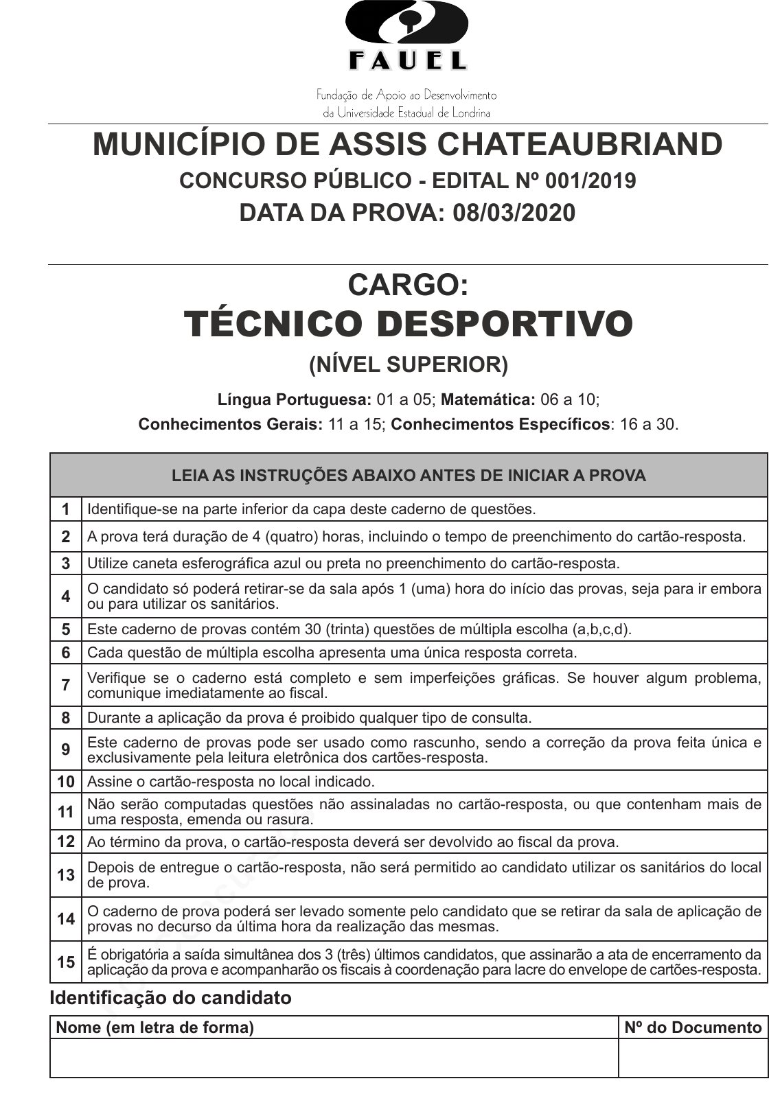 pcimarkpci MDAwMDowMDAwOjAwMDA6MDAwMDowMDAwOmZmZmY6YmFmOTpiNDVi:VGh1LCAyMyBKYW4gMjAyNSAxMjowOToxMiAtMDMwMA== www.pciconcursos.com.br MUNICÍPIO DE ASSIS CHATEAUBRIAND CONCURSO PÚBLICO - EDITAL Nº 001/2019 DATA DA PROVA: 08/03/2020 CARGO: TÉCNICO DESPORTIVO (NÍVEL SUPERIOR) Língua Portuguesa: 01 a 05; Matemática: 06 a 10; Conhecimentos Gerais: 11 a 15; Conhecimentos Específicos: 16 a 30. LEIA AS INSTRUÇÕES ABAIXO ANTES DE INICIAR A PROVA 1 Identifique-se na parte inferior da capa deste caderno de questões. 2 A prova terá duração de 4 (quatro) horas, incluindo o tempo de preenchimento do cartão-resposta. 3 Utilize caneta esferográfica azul ou preta no preenchimento do cartão-resposta. 4 O candidato só poderá retirar-se da sala após 1 (uma) hora do início das provas, seja para ir embora ou para utilizar os sanitários. 5 Este caderno de provas contém 30 (trinta) questões de múltipla escolha (a,b,c,d). 6 Cada questão de múltipla escolha apresenta uma única resposta correta. 7 Verifique se o caderno está completo e sem imperfeições gráficas. Se houver algum problema, comunique imediatamente ao fiscal. 8 Durante a aplicação da prova é proibido qualquer tipo de consulta. 9 Este caderno de provas pode ser usado como rascunho, sendo a correção da prova feita única e exclusivamente pela leitura eletrônica dos cartões-resposta. 10 Assine o cartão-resposta no local indicado. 11 Não serão computadas questões não assinaladas no cartão-resposta, ou que contenham mais de uma resposta, emenda ou rasura. 12 Ao término da prova, o cartão-resposta deverá ser devolvido ao fiscal da prova. 13 Depois de entregue o cartão-resposta, não será permitido ao candidato utilizar os sanitários do local de prova. 14 O caderno de prova poderá ser levado somente pelo candidato que se retirar da sala de aplicação de provas no decurso da última hora da realização das mesmas. 15 É obrigatória a saída simultânea dos 3 (três) últimos candidatos, que assinarão a ata de encerramento da aplicação da prova e acompanharão os fiscais à coordenação para lacre do envelope de cartões-resposta. Identificação do candidato Nome (em letra de forma) Nº do Documento pcimarkpci MDAwMDowMDAwOjAwMDA6MDAwMDowMDAwOmZmZmY6YmFmOTpiNDVi:VGh1LCAyMyBKYW4gMjAyNSAxMjowOToxMiAtMDMwMA== www.pciconcursos.com.br QUESTÕES DE 1 A 5 - LÍNGUA PORTUGUESA 01. O trecho a seguir foi extraído da obra ‘Memórias do Cárcere’, de Graciliano Ramos. Leia-o atentamente para responder às próximas questões. “Nunca tivemos censura prévia em obra de arte. Efe- tivamente se queimaram alguns livros, mas foram ra- ríssimos esses autos-de-fé. Em geral a reação se li- mitou a suprimir ataques diretos, palavras de ordem, tiradas demagógicas, e disto escasso prejuízo veio à produção literária. Certos escritores se desculpam de não haverem forjado coisas excelentes por fal- ta de liberdade - talvez ingênuo recurso de justificar inépcia ou preguiça. Liberdade completa ninguém desfruta: começamos oprimidos pela sintaxe e aca- bamos às voltas com a Delegacia de Ordem Política e Social, mas, nos estreitos limites a que nos coa- gem a gramática e a lei, ainda nos podemos mexer”. Em relação à interpretação do texto, pode-se afirmar que o autor: a) denuncia a prática dos governos autoritários bra- sileiros de censurarem previamente as obras de arte. b) se queixa de que, se não fossem os ataques do Es- tado, a qualidade da nossa literatura seria bem maior. c) argumenta que a ausência de liberdade total não foi um grande obstáculo à produção literária de alta qualidade. d) indica duas barreiras que impediram por completo o desenvolvimento da literatura nacional: a gramática e a lei. ___________________________________________ 02. O trecho destacado se inicia com a afirmação de que “nunca tivemos censura prévia em obra de arte”. Em relação ao sujeito dessa oração, pode-se afirmar que: a) está oculto. b) é composto. c) é inexistente. d) está invertido. ___________________________________________ 03. Analise as alternativas a seguir e assinale a que NÃO contém uma palavra que pode ser classificada foneticamente como proparoxítona. a) Gramática. b) Raríssimos. c) Efetivamente. d) Demagógicas. ___________________________________________ 04. Uma das afirmações do autor no trecho destacado é que “liberdade completa ninguém desfruta”. A respei- to da estrutura sintática dessa oração, marque a alter- nativa CORRETA. a) Tanto o sujeito como o objeto da oração são com- postos. b) O termo “completa” desempenha a função de nú- cleo do sujeito. c) A função de sujeito da oração é desempenhada pelo termo “ninguém”. d) A expressão “liberdade completa” exerce a função de sujeito composto da oração. ___________________________________________ 05. Ainda em relação à interpretação do texto, ao ale- gar que os escritores são “oprimidos pela sintaxe”, o autor pretende enfatizar que: a) a censura estatal é capaz de utilizar diferentes re- cursos para promover a perseguição aos artistas. b) a produção literária jamais é completamente livre, pois obedece a certas normas gramaticais. c) os erros gramaticais podem se tornar um pretexto para que o Estado ditatorial censure as obras literárias. d) os rigores das normas ortográficas são o principal impedimento à produção literária em qualquer país. ___________________________________________ QUESTÕES DE 6 A 10 - MATEMÁTICA 06. Algumas unidades de medidas são mais utilizadas no Brasil. Sobre unidades de quantidade de matéria (massa), assinale a alternativa CORRETA: a) Um grama equivale a mil miligramas. b) Massa é, no Brasil, preferencialmente medida em litros. c) A unidade de massa “quilograma” abrevia-se como “KG”, em letras maiúsculas. d) Não é possível representar, no sistema de medidas brasileiro, massas inferiores a um micrograma. _____________
