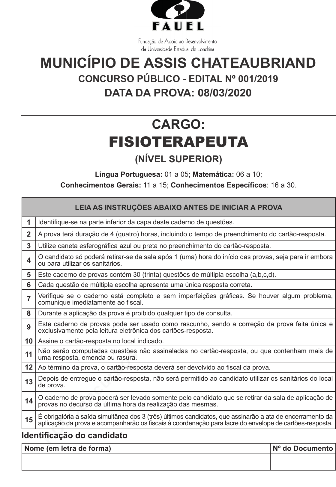 pcimarkpci MDAwMDowMDAwOjAwMDA6MDAwMDowMDAwOmZmZmY6YmFmOTpiNDVi:VGh1LCAyMyBKYW4gMjAyNSAxMjowODowOCAtMDMwMA== www.pciconcursos.com.br MUNICÍPIO DE ASSIS CHATEAUBRIAND CONCURSO PÚBLICO - EDITAL Nº 001/2019 DATA DA PROVA: 08/03/2020 CARGO: FISIOTERAPEUTA (NÍVEL SUPERIOR) Língua Portuguesa: 01 a 05; Matemática: 06 a 10; Conhecimentos Gerais: 11 a 15; Conhecimentos Específi cos: 16 a 30. LEIA AS INSTRUÇÕES ABAIXO ANTES DE INICIAR A PROVA 1 Identifi que-se na parte inferior da capa deste caderno de questões. 2 A prova terá duração de 4 (quatro) horas, incluindo o tempo de preenchimento do cartão-resposta. 3 Utilize caneta esferográfi ca azul ou preta no preenchimento do cartão-resposta. 4 O candidato só poderá retirar-se da sala após 1 (uma) hora do início das provas, seja para ir embora ou para utilizar os sanitários. 5 Este caderno de provas contém 30 (trinta) questões de múltipla escolha (a,b,c,d). 6 Cada questão de múltipla escolha apresenta uma única resposta correta. 7 Verifi que se o caderno está completo e sem imperfeições gráfi cas. Se houver algum problema, comunique imediatamente ao fi scal. 8 Durante a aplicação da prova é proibido qualquer tipo de consulta. 9 Este caderno de provas pode ser usado como rascunho, sendo a correção da prova feita única e exclusivamente pela leitura eletrônica dos cartões-resposta. 10 Assine o cartão-resposta no local indicado. 11 Não serão computadas questões não assinaladas no cartão-resposta, ou que contenham mais de uma resposta, emenda ou rasura. 12 Ao término da prova, o cartão-resposta deverá ser devolvido ao fi scal da prova. 13 Depois de entregue o cartão-resposta, não será permitido ao candidato utilizar os sanitários do local de prova. 14 O caderno de prova poderá ser levado somente pelo candidato que se retirar da sala de aplicação de provas no decurso da última hora da realização das mesmas. 15 É obrigatória a saída simultânea dos 3 (três) últimos candidatos, que assinarão a ata de encerramento da aplicação da prova e acompanharão os fi scais à coordenação para lacre do envelope de cartões-resposta. Identifi cação do candidato Nome (em letra de forma) Nº do Documento pcimarkpci MDAwMDowMDAwOjAwMDA6MDAwMDowMDAwOmZmZmY6YmFmOTpiNDVi:VGh1LCAyMyBKYW4gMjAyNSAxMjowODowOCAtMDMwMA== www.pciconcursos.com.br QUESTÕES DE 1 A 5 - LÍNGUA PORTUGUESA 01. O trecho a seguir foi extraído da obra ‘Memórias do Cárcere’, de Graciliano Ramos. Leia-o atentamente para responder às próximas questões. “Nunca tivemos censura prévia em obra de arte. Efe- tivamente se queimaram alguns livros, mas foram ra- ríssimos esses autos-de-fé. Em geral a reação se li- mitou a suprimir ataques diretos, palavras de ordem, tiradas demagógicas, e disto escasso prejuízo veio à produção literária. Certos escritores se desculpam de não haverem forjado coisas excelentes por fal- ta de liberdade - talvez ingênuo recurso de justificar inépcia ou preguiça. Liberdade completa ninguém desfruta: começamos oprimidos pela sintaxe e aca- bamos às voltas com a Delegacia de Ordem Política e Social, mas, nos estreitos limites a que nos coa- gem a gramática e a lei, ainda nos podemos mexer”. Em relação à interpretação do texto, pode-se afirmar que o autor: a) denuncia a prática dos governos autoritários bra- sileiros de censurarem previamente as obras de arte. b) se queixa de que, se não fossem os ataques do Es- tado, a qualidade da nossa literatura seria bem maior. c) argumenta que a ausência de liberdade total não foi um grande obstáculo à produção literária de alta qualidade. d) indica duas barreiras que impediram por completo o desenvolvimento da literatura nacional: a gramática e a lei. ___________________________________________ 02. O trecho destacado se inicia com a afirmação de que “nunca tivemos censura prévia em obra de arte”. Em relação ao sujeito dessa oração, pode-se afirmar que: a) está oculto. b) é composto. c) é inexistente. d) está invertido. ___________________________________________ 03. Analise as alternativas a seguir e assinale a que NÃO contém uma palavra que pode ser classificada foneticamente como proparoxítona. a) Gramática. b) Raríssimos. c) Efetivamente. d) Demagógicas. ___________________________________________ 04. Uma das afirmações do autor no trecho destacado é que “liberdade completa ninguém desfruta”. A respei- to da estrutura sintática dessa oração, marque a alter- nativa CORRETA. a) Tanto o sujeito como o objeto da oração são com- postos. b) O termo “completa” desempenha a função de nú- cleo do sujeito. c) A função de sujeito da oração é desempenhada pelo termo “ninguém”. d) A expressão “liberdade completa” exerce a função de sujeito composto da oração. ___________________________________________ 05. Ainda em relação à interpretação do texto, ao ale- gar que os escritores são “oprimidos pela sintaxe”, o autor pretende enfatizar que: a) a censura estatal é capaz de utilizar diferentes re- cursos para promover a perseguição aos artistas. b) a produção literária jamais é completamente livre, pois obedece a certas normas gramaticais. c) os erros gramaticais podem se tornar um pretexto para que o Estado ditatorial censure as obras literárias. d) os rigores das normas ortográficas são o principal impedimento à produção literária em qualquer país. ___________________________________________ QUESTÕES DE 6 A 10 - MATEMÁTICA 06. Algumas unidades de medidas são mais utilizadas no Brasil. Sobre unidades de quantidade de matéria (massa), assinale a alternativa CORRETA: a) Um grama equivale a mil miligramas. b) Massa é, no Brasil, preferencialmente medida em litros. c) A unidade de massa “quilograma” abrevia-se como “KG”, em letras maiúsculas. d) Não é possível representar, no sistema de medidas brasileiro, massas inferiores a um micrograma. _________
