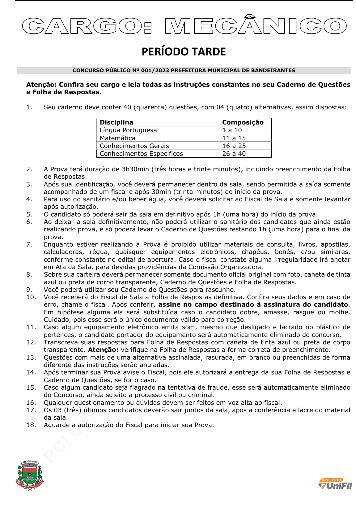 pcimarkpci MDAwMDowMDAwOjAwMDA6MDAwMDowMDAwOmZmZmY6YmFmOTpiNDVi:VGh1LCAyMyBKYW4gMjAyNSAxMjoyOToxMCAtMDMwMA== www.pciconcursos.com.br PERÍODO TARDE CONCURSO PÚBLICO Nº 001/2023 PREFEITURA MUNICIPAL DE BANDEIRANTES Atenção: Confira seu cargo e leia todas as instruções constantes no seu Caderno de Questões e Folha de Respostas. 1. Seu caderno deve conter 40 (quarenta) questões, com 04 (quatro) alternativas, assim dispostas: Disciplina Composição Língua Portuguesa 1 a 10 Matemática 11 a 15 Conhecimentos Gerais 16 a 25 Conhecimentos Específicos 26 a 40 2. A Prova terá duração de 3h30min (três horas e trinte minutos), incluindo preenchimento da Folha de Respostas. 3. Após sua identificação, você deverá permanecer dentro da sala, sendo permitida a saída somente acompanhado de um fiscal e após 30min (trinta minutos) do início da prova. 4. Para uso do sanitário e/ou beber água, você deverá solicitar ao Fiscal de Sala e somente levantar após autorização. 5. O candidato só poderá sair da sala em definitivo após 1h (uma hora) do início da prova. 6. Ao deixar a sala definitivamente, não poderá utilizar o sanitário dos candidatos que ainda estão realizando prova, e só poderá levar o Caderno de Questões restando 1h (uma hora) para o final da prova. 7. Enquanto estiver realizando a Prova é proibido utilizar materiais de consulta, livros, apostilas, calculadoras, régua, quaisquer equipamentos eletrônicos, chapéus, bonés, e/ou similares, conforme constante no edital de abertura. Caso o fiscal constate alguma irregularidade irá anotar em Ata da Sala, para devidas providências da Comissão Organizadora. 8. Sobre sua carteira deverá permanecer somente documento oficial original com foto, caneta de tinta azul ou preta de corpo transparente, Caderno de Questões e Folha de Respostas. 9. Você poderá utilizar seu Caderno de Questões para rascunho. 10. Você receberá do Fiscal de Sala a Folha de Respostas definitiva. Confira seus dados e em caso de erro, chame o fiscal. Após conferir, assine no campo destinado à assinatura do candidato. Em hipótese alguma ela será substituída caso o candidato dobre, amasse, rasgue ou molhe. Cuidado, pois esse será o único documento válido para correção. 11. Caso algum equipamento eletrônico emita som, mesmo que desligado e lacrado no plástico de pertences, o candidato portador do equipamento será automaticamente eliminado do concurso. 12. Transcreva suas respostas para Folha de Respostas com caneta de tinta azul ou preta de corpo transparente. Atenção: verifique na Folha de Respostas a forma correta de preenchimento. 13. Questões com mais de uma alternativa assinalada, rasurada, em branco ou preenchidas de forma diferente das instruções serão anuladas. 14. Após terminar sua Prova avise o Fiscal, pois ele autorizará a entrega da sua Folha de Respostas e Caderno de Questões, se for o caso. 15. Caso algum candidato seja flagrado na tentativa de fraude, esse será automaticamente eliminado do Concurso, ainda sujeito a processo civil ou criminal. 16. Qualquer questionamento ou dúvidas devem ser feitos em voz alta ao fiscal. 17. Os 03 (três) últimos candidatos deverão sair juntos da sala, após a conferência e lacre do material da sala. 18. Aguarde a autorização do Fiscal para iniciar sua Prova. pcimarkpci MDAwMDowMDAwOjAwMDA6MDAwMDowMDAwOmZmZmY6YmFmOTpiNDVi:VGh1LCAyMyBKYW4gMjAyNSAxMjoyOToxMCAtMDMwMA== www.pciconcursos.com.br 2 ---------------------------------------------------------------DESTAQUE AQUI--------------------------------------------------------------------- 01 02 03 04 05 06 07 08 09 10 11 12 13 14 15 16 17 18 19 20 21 22 23 24 25 26 27 28 29 30 31 32 33 34 35 36 37 38 39 40 pcimarkpci MDAwMDowMDAwOjAwMDA6MDAwMDowMDAwOmZmZmY6YmFmOTpiNDVi:VGh1LCAyMyBKYW4gMjAyNSAxMjoyOToxMCAtMDMwMA== www.pciconcursos.com.br 3 Língua Portuguesa Leia o texto para responder as questões. Quatro mineiros morrem dentro de BMW em Balneário Camboriú Os jovens pretendiam descansar no veículo, antes de seguir viagem; quatro morreram e uma mulher sobreviveu Quatro pessoas foram encontradas mortas dentro de uma BMW que estava estacionada na rodoviária de Balneário Camboriú, no Litoral Norte de Santa Catarina, na madrugada desta segunda-feira (1º), logo após a queima de fogos. As vítimas tinham 16, 19, 21 e 24 anos e são de Paracatu, na região Noroeste de Minas Gerais. Segundo a Polícia Civil, a suspeita é de que eles tenham sofrido intoxicação e asfixia por monóxido de carbono. “Informações preliminares indicam que houve vazamento entre o motor e o painel do veículo”, declarou o delegado Bruno Effori, responsável pelo caso. O grupo foi para a rodoviária buscar uma mulher — namorada de uma das vítimas — que viajou de MG para SC. Quando chegou na rodoviária, ela encontrou os amigos, que moravam em Florianópolis há um mês, passando mal, com ânsia de vômito e tontura. A mulher conta que os amigos permaneceram dentro do carro, enquanto ela saiu para dar uma volta, esperando que eles melhorassem. Quando retornou, encontrou os quatro mortos. As vítimas teriam ficado cerca de quatro horas no carro, com o ar-condicionado ligado. O Samu e o Corpo de Bombeiros foram acionados para o caso e foram feitas manobras de reanimação nos jovens por muitos minutos, mas as vítimas não responderam. Posteriormente, o Samu confirmou as mortes por parada cardiorrespiratória. A reportagem entrou em contato com a Polícia Civil de Minas Gerais, que afirmou que as informações devem ser buscadas com a Polícia Civil de Santa Catarina. Cano de descarga customizado O carro da marca BMW em que estavam os quatro mineiros sofreu customização do cano de descarga dias antes do ocorrido, informou o delegado Bruno Effori, responsável pela investigação. Essa personalização é uma das linhas de investigação sobre o que teria levado à suposta intoxicação por monóxido de carbono das quatro vítimas. “