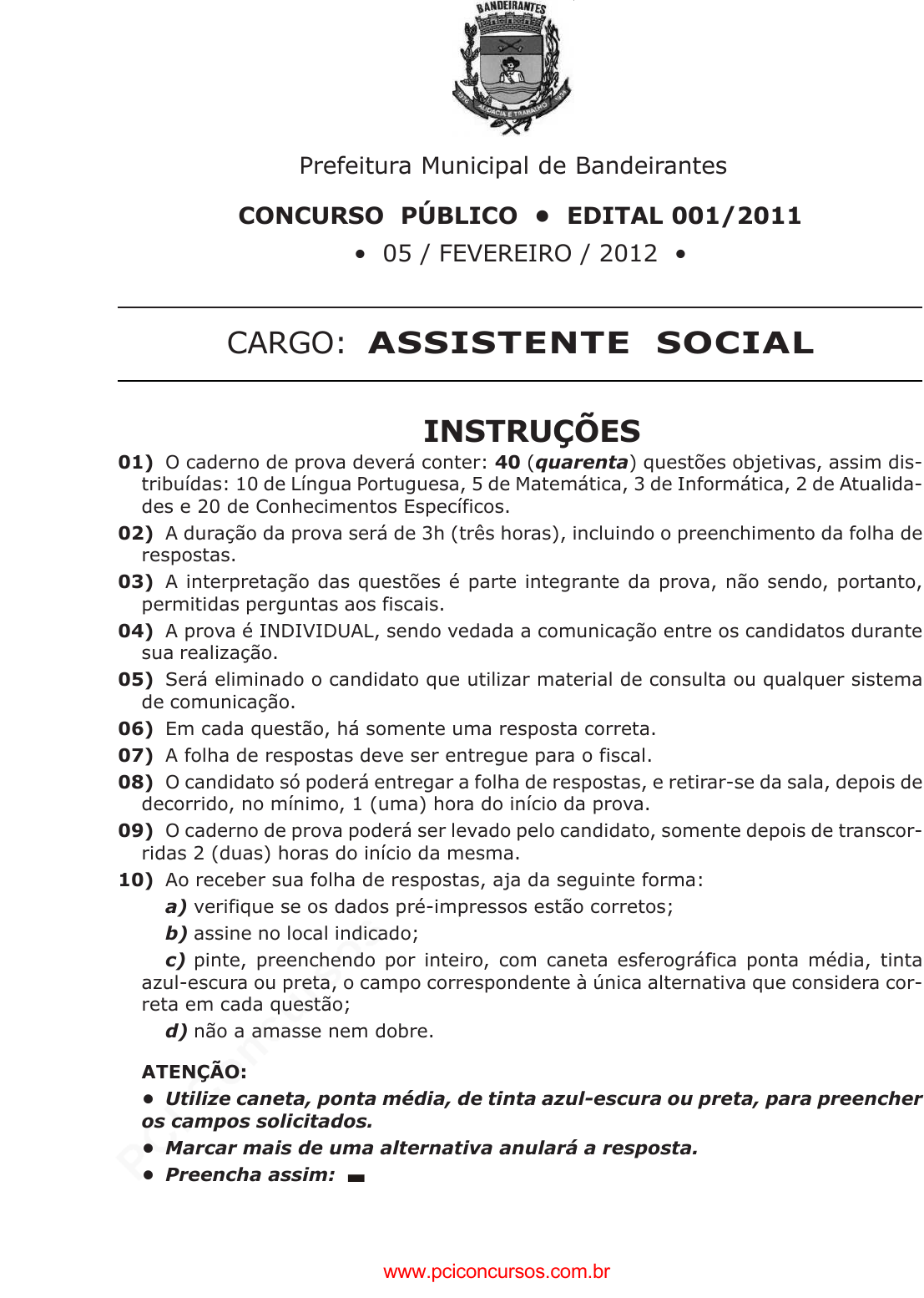 pcimarkpci MDAwMDowMDAwOjAwMDA6MDAwMDowMDAwOmZmZmY6YmFmOTpiNDVi:VGh1LCAyMyBKYW4gMjAyNSAxMjoyNjoxOCAtMDMwMA== www.pciconcursos.com.br Prefeitura Municipal de Bandeirantes CONCURSO PÚBLICO • EDITAL 001/2011 • 05 / FEVEREIRO / 2012 • CARGO: ASSISTENTE SOCIAL INSTRUÇÕES 01) O caderno de prova deverá conter: 40 (quarenta) questões objetivas, assim dis- tribuídas: 10 de Língua Portuguesa, 5 de Matemática, 3 de Informática, 2 de Atualida- des e 20 de Conhecimentos Específicos. 02) A duração da prova será de 3h (três horas), incluindo o preenchimento da folha de respostas. 03) A interpretação das questões é parte integrante da prova, não sendo, portanto, permitidas perguntas aos fiscais. 04) A prova é INDIVIDUAL, sendo vedada a comunicação entre os candidatos durante sua realização. 05) Será eliminado o candidato que utilizar material de consulta ou qualquer sistema de comunicação. 06) Em cada questão, há somente uma resposta correta. 07) A folha de respostas deve ser entregue para o fiscal. 08) O candidato só poderá entregar a folha de respostas, e retirar-se da sala, depois de decorrido, no mínimo, 1 (uma) hora do início da prova. 09) O caderno de prova poderá ser levado pelo candidato, somente depois de transcor- ridas 2 (duas) horas do início da mesma. 10) Ao receber sua folha de respostas, aja da seguinte forma: a) verifique se os dados pré-impressos estão corretos; b) assine no local indicado; c) pinte, preenchendo por inteiro, com caneta esferográfica ponta média, tinta azul-escura ou preta, o campo correspondente à única alternativa que considera cor- reta em cada questão; d) não a amasse nem dobre. ATENÇÃO: • Utilize caneta, ponta média, de tinta azul-escura ou preta, para preencher os campos solicitados. • Marcar mais de uma alternativa anulará a resposta. • Preencha assim: www.pciconcursos.com.br pcimarkpci MDAwMDowMDAwOjAwMDA6MDAwMDowMDAwOmZmZmY6YmFmOTpiNDVi:VGh1LCAyMyBKYW4gMjAyNSAxMjoyNjoxOCAtMDMwMA== www.pciconcursos.com.br 2 - Prefeitura Municipal de Bandeirantes - Concurso Público 001/2011 LÍNGUA PORTUGUESA TEXTO 1 – REFERÊNCIA PARA AS QUESTÕES 01, 02 E 03. 5 razões que fizeram a TAM tropeçar no terceiro trimestre São Paulo – A TAM acumulou prejuízo líquido de 619,7 milhões de reais no terceiro trimestre de 2011, revertendo o lucro de 733 milhões de reais somado um ano antes. Várias razões levaram a companhia a registrar resultado negativo no período. Segundo a TAM, o efeito câmbio, que totalizou despesas de 1,3 bilhão de reais no terceiro trimestre, no entanto, foi uma das principais. Veja, a seguir, 5 motivos que jus- tificam o prejuízo da TAM no terceiro trimestre: 1) A apreciação do dólar foi determinante nos resultados financeiros da TAM. No terceiro trimestre do ano, as perdas cambiais gera- ram despesas extras à companhia de 1,3 bilhão de reais, pois impactaram diretamen- te a dívida que a TAM possui em moeda ame- ricana. No mesmo período de 2010, a em- presa havia somado receita de 345,2 milhões de reais devido à valorização do real. 2) No terceiro trimestre também, a Infraero re- cebeu da TAM o equivalente a 37 milhões de reais. O montante refere-se à cobrança das diferenças do peso máximo de decola- gem de anos anteriores. Segundo a compa- nhia, o pagamento é não-recorrente, ou seja, não deve se repetir nos próximos trimes- tres. 3) Além do gasto não-recorrente, as despesas operacionais da TAM também cresceram no terceiro trimestre. No período, os gastos atingiram a cifra de 2,7 bilhões de reais, alta de 22,5% na comparação com o mesmo pe- ríodo de 2010. A alta está relacionada ao au- mento das despesas com pessoal, manuten- ção, serviço de terceiros, tarifas de pouso e depreciação. 4) Além do prejuízo líquido, o lucro antes de juros, impostos, depreciação e amortização da TAM foi menor no terceiro trimestre, ten- do impacto direto na margem. No período, o ebitda totalizou 739,1 milhões de reais, queda de 13,1% na comparação com o mes- mo trimestre do ano anterior. A margem ebitda caiu 6,9 pontos percentuais, para 22,3%. 5) Os gastos com combustíveis cresceram 34% no terceiro trimestre, somando mais de 1,1 bilhão de reais. Além do aumento de 21% do preço médio por litro, a companhia tam- bém aumentou em quase 10% o volume de combustível consumido no período, devido a mais horas voadas. Adaptado de: 5 razões que fizeram a TAM tropeçar no terceiro trimestre. Disponível em: E- EXAME.COM. - 10/11/2011- Daniela Barbosa. . Acesso em: 10 nov. 2011. Questão 01) No texto sobre a TAM, afirma-se que seus prejuízos no terceiro trimestre de 2011 tive- ram inúmeros motivos. Assinale a alternativa em que todas as opções estão corretas. 1) Questões cambiais (perdas). 2) Aumento do preço do combustível. 3) Pagamento efetuado à Embraer (dívida). 4) Expansão das despesas operacionais. 5) Tarifas mais baixas das concorrentes. A) 1 e 5 B) 2 e 3 C) 3 e 4 D) 1 e 2 E) 2 e 5 Questão 02) Marque a alternativa que correspon- de às lacunas. Não gosto de andar ____ pé, portanto irei ____ Curitiba de TAM. Como sempre há turbulência, estarei cara ____ cara com o perigo. Depois regressarei ____ terra natal. A) à, a, a, a. B) a, à, à, a. C) a, a, à, à. D) a, a, a, à. E) à, à, à, à. www.pciconcursos.com.br pcimarkpci MDAwMDowMDAwOjAwMDA6MDAwMDowMDAwOmZmZmY6YmFmOTpiNDVi:VGh1LCAyMyBKYW4gMjAyNSAxMjoyNjoxOCAtMDMwMA== www.pciconcursos.com.br ASSISTENTE SOCIAL - 3 Questão 03) A partir da leitura do Texto 1, publi- cado pela Revista Exame, é correto inferir que: A) a TAM saiu prejudicada devido a paralisações dos seus funcionários devido aos baixos salários. B) os funcionários da TAM reclamaram, na justiça trabalhista, pelo excesso de trabalho e horas mal dormidas. C) a Infraero indenizou a TAM, que efetuou o repas- se da indenização a quem de direito. D) a TAM é a companhia aérea que mais teve preju- ízo no Brasil em 2011. E) a TAM sof