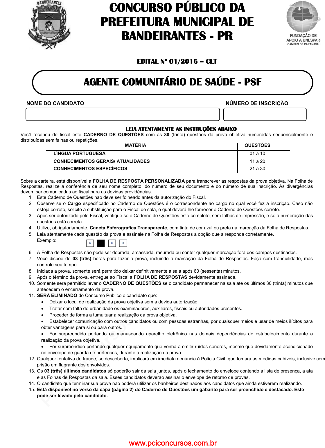 pcimarkpci MDAwMDowMDAwOjAwMDA6MDAwMDowMDAwOmZmZmY6YmFmOTpiNDVi:VGh1LCAyMyBKYW4gMjAyNSAxMjoyNTozMiAtMDMwMA== www.pciconcursos.com.br CONCURSO PÚBLICO DA PREFEITURA MUNICIPAL DE BANDEIRANTES - PR EDITAL Nº 01/2016 – CLT NOME DO CANDIDATO NÚMERO DE INSCRIÇÃO LEIA ATENTAMENTE AS INSTRUÇÕES ABAIXO Você recebeu do fiscal este CADERNO DE QUESTÕES com as 30 (trinta) questões da prova objetiva numeradas sequencialmente e distribuídas sem falhas ou repetições. MATÉRIA QUESTÕES LÍNGUA PORTUGUESA 01 a 10 CONHECIMENTOS GERAIS/ ATUALIDADES 11 a 20 CONHECIMENTOS ESPECÍFICOS 21 a 30 Sobre a carteira, está disponível a FOLHA DE RESPOSTA PERSONALIZADA para transcrever as respostas da prova objetiva. Na Folha de Respostas, realize a conferência de seu nome completo, do número de seu documento e do número de sua inscrição. As divergências devem ser comunicadas ao fiscal para as devidas providências. 1. Este Caderno de Questões não deve ser folheado antes da autorização do Fiscal. 2. Observe se o Cargo especificado no Caderno de Questões é o correspondente ao cargo no qual você fez a inscrição. Caso não esteja correto, solicite a substituição para o Fiscal de sala, o qual deverá lhe fornecer o Caderno de Questões correto. 3. Após ser autorizado pelo Fiscal, verifique se o Caderno de Questões está completo, sem falhas de impressão, e se a numeração das questões está correta. 4. Utilize, obrigatoriamente, Caneta Esferográfica Transparente, com tinta de cor azul ou preta na marcação da Folha de Respostas. 5. Leia atentamente cada questão da prova e assinale na Folha de Respostas a opção que a responda corretamente. Exemplo: 6. A Folha de Respostas não pode ser dobrada, amassada, rasurada ou conter qualquer marcação fora dos campos destinados. 7. Você dispõe de 03 (três) horas para fazer a prova, incluindo a marcação da Folha de Respostas. Faça com tranquilidade, mas controle seu tempo. 8. Iniciada a prova, somente será permitido deixar definitivamente a sala após 60 (sessenta) minutos. 9. Após o término da prova, entregue ao Fiscal a FOLHA DE RESPOSTAS devidamente assinada. 10. Somente será permitido levar o CADERNO DE QUESTÕES se o candidato permanecer na sala até os últimos 30 (trinta) minutos que antecedem o encerramento da prova. 11. SERÁ ELIMINADO do Concurso Público o candidato que: Deixar o local de realização da prova objetiva sem a devida autorização. Tratar com falta de urbanidade os examinadores, auxiliares, fiscais ou autoridades presentes. Proceder de forma a tumultuar a realização da prova objetiva. Estabelecer comunicação com outros candidatos ou com pessoas estranhas, por quaisquer meios e usar de meios ilícitos para obter vantagens para si ou para outros. For surpreendido portando ou manuseando aparelho eletrônico nas demais dependências do estabelecimento durante a realização da prova objetiva. For surpreendido portando qualquer equipamento que venha a emitir ruídos sonoros, mesmo que devidamente acondicionado no envelope de guarda de pertences, durante a realização da prova. 12. Qualquer tentativa de fraude, se descoberta, implicará em imediata denúncia à Polícia Civil, que tomará as medidas cabíveis, inclusive com prisão em flagrante dos envolvidos. 13. Os 03 (três) últimos candidatos só poderão sair da sala juntos, após o fechamento do envelope contendo a lista de presença, a ata e as Folhas de Respostas da sala. Esses candidatos deverão assinar o envelope de retorno de provas. 14. O candidato que terminar sua prova não poderá utilizar os banheiros destinados aos candidatos que ainda estiverem realizando. 15. Está disponível no verso da capa (página 2) do Caderno de Questões um gabarito para ser preenchido e destacado. Este pode ser levado pelo candidato. AGENTE COMUNITÁRIO DE SAÚDE - PSF www.pciconcursos.com.br pcimarkpci MDAwMDowMDAwOjAwMDA6MDAwMDowMDAwOmZmZmY6YmFmOTpiNDVi:VGh1LCAyMyBKYW4gMjAyNSAxMjoyNTozMiAtMDMwMA== www.pciconcursos.com.br RASCUNHO DESTAQUE AQUI ……………………………………………………………………………………………………………………………………………………. GABARITO Concurso Público da Prefeitura Municipal de Bandeirantes - PR http://www.fundacaofafipa.org.br/concurso 1 2 3 4 5 6 7 8 9 10 11 12 13 14 15 16 17 18 19 20 21 22 23 24 25 26 27 28 29 30 www.pciconcursos.com.br pcimarkpci MDAwMDowMDAwOjAwMDA6MDAwMDowMDAwOmZmZmY6YmFmOTpiNDVi:VGh1LCAyMyBKYW4gMjAyNSAxMjoyNTozMiAtMDMwMA== www.pciconcursos.com.br Cargo: AGENTE COMUNITÁRIO DE SAÚDE - PSF Página - 3 - LÍNGUA PORTUGUESA Texto para as questões 1 a 6. REI DOS SONS De estalar de dedos a berimbau, tudo virava música nas mãos do percussionista Naná Vasconcelos NO PALCO, Naná Vasconcelos só não fazia chover. Pensando bem, fazia sim: utilizando o coro e as palmas do público, ele reproduzia o som da chuva caindo nas folhas da selva amazônica.E Juvenal de Holanda, nome com que foi batizado há 71 anos, tinha muitos outros atributos. Transformou o berimbau em protagonista de suas performances, mas não se limitou a ele. Nas mãos de Naná, tudo virava música: de baterias eletrônicas a um simples estalar de dedos. Nascido no Recife, Naná Vasconcelos ganhou seu primeiro instrumento aos 11 anos – um bongô, presente do pai, que também era músico. Aos 12, passou a tirar seu sustento tocando em bailes na capital pernambucana. Em 1967, mudou-se para o Rio de Janeiro e na década de 70 começou a carreira internacional, primeiro na banda do saxofonista argentino Gato Barbieri, depois em projetos ao lado de Egberto Gismonti, do trompetista Don Cherry (no grupo Codona) e do guitarrista Pat Metheny. De volta ao Brasil, empenhou-se no PercPan, festival que trazia grandes percussionistas ao país. Por oito vezes, foi eleito o melhor percussionista em votação da revista de jazz DownBeat. Em 2015, diagnosticado com câncer no pulmão, submeteu-se a quim