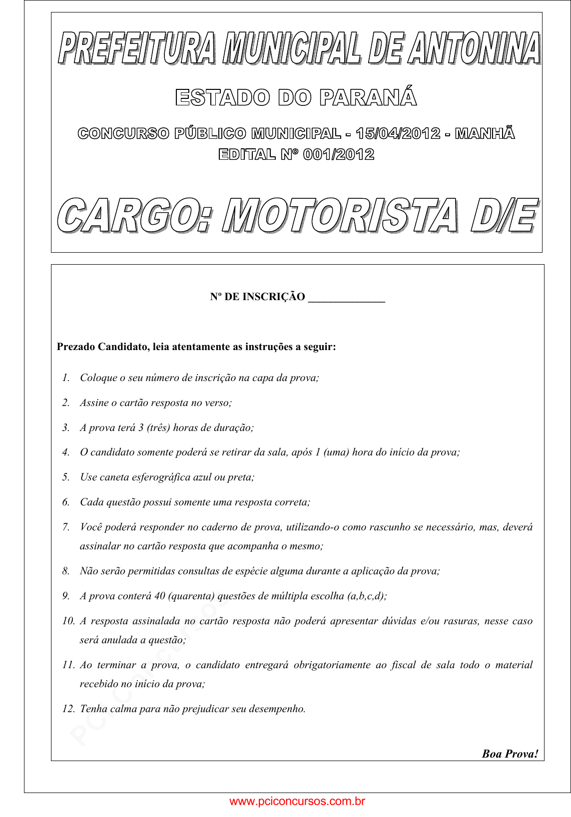 pcimarkpci MDAwMDowMDAwOjAwMDA6MDAwMDowMDAwOmZmZmY6YmFmOTpiNDVi:VGh1LCAyMyBKYW4gMjAyNSAxMjoyNDoyNSAtMDMwMA== www.pciconcursos.com.br Nº DE INSCRIÇÃO ______________ Prezado Candidato, leia atentamente as instruções a seguir: 1. Coloque o seu número de inscrição na capa da prova; 2. Assine o cartão resposta no verso; 3. A prova terá 3 (três) horas de duração; 4. O candidato somente poderá se retirar da sala, após 1 (uma) hora do início da prova; 5. Use caneta esferográfica azul ou preta; 6. Cada questão possui somente uma resposta correta; 7. Você poderá responder no caderno de prova, utilizando-o como rascunho se necessário, mas, deverá assinalar no cartão resposta que acompanha o mesmo; 8. Não serão permitidas consultas de espécie alguma durante a aplicação da prova; 9. A prova conterá 40 (quarenta) questões de múltipla escolha (a,b,c,d); 10. A resposta assinalada no cartão resposta não poderá apresentar dúvidas e/ou rasuras, nesse caso será anulada a questão; 11. Ao terminar a prova, o candidato entregará obrigatoriamente ao fiscal de sala todo o material recebido no início da prova; 12. Tenha calma para não prejudicar seu desempenho. Boa Prova! www.pciconcursos.com.br pcimarkpci MDAwMDowMDAwOjAwMDA6MDAwMDowMDAwOmZmZmY6YmFmOTpiNDVi:VGh1LCAyMyBKYW4gMjAyNSAxMjoyNDoyNSAtMDMwMA== www.pciconcursos.com.br 2 Uma Fábula Certa vez os animais resolveram preparar seus filhos para enfrentarem as dificuldades do mundo atual e, para isso, organizaram uma escola. Adotaram um currículo prático que constava de corrida, escalagem, natação e voo. Para facilitar o ensino, todos os alunos deveriam aprender todas as matérias. O pato, __________ em natação (melhor mesmo que o professor), conseguiu notas regulares em voo, mas era aluno fraco em corridas e escalagem. Para compensar esta fraqueza, ficava retido na escola todo o dia, fazendo exercícios extras. De tanto treinar corrida ficou com os pés terrivelmente esfolados e, por isso, não conseguia mais nadar como antes. Entretanto, como o sistema de promoção era a média aritmética das notas nos vários cursos, ele conseguiu ser um aluno sofrível, e ninguém se preocupou com o caso do pobre pato. O coelho era o melhor aluno do curso em corrida, mas sofreu tremendamente e acabou com um esgotamento nervoso, de tanto tentar a natação. O esquilo subira tremendamente, conseguindo belas notas no curso de escalagem, mas ficou frustrado no voo pois o professor o obrigava a voar de baixo para cima e ele insistia em usar os seus métodos, isto é, em subir nas árvores e voar de lá para o chão. Ele teve que se __________ tanto em natação que acabou por passar com nota mínima em escalagem, saindo-se mediocremente em corrida. A águia foi uma criança problema, severamente castigada desde o princípio do curso, porque usava métodos _____________ dela, para atravessar o rio ou subir nas árvores. No fim do ano, uma águia anormal que tinha nadadeiras conseguiu a melhor média em todos os cursos e foi a oradora da turma. Os ratos e os cães de caça não entraram na escola porque a administração se recusou a incluir duas matérias que eles julgavam importantes, como escavar tocas e escolher esconderijos. Acabaram por abrir uma escola particular junto com as marmotas e, desde o princípio, conseguiram grande sucesso. (Autoria não identificada) 01 - Assinale a alternativa que preenche corretamente as lacunas do texto: a) eximio – exforssar – esclusivos. b) exímio – esforçar – exclusivos. c) ezímio – exforçar – exclusivos. d) ezímio – esforssar – esclusivos. 02 - “Rio” é uma palavra dissílaba, assinale a alternativa em que as palavras retiradas do texto, também são dissílabas: a) média – cães. b) ano – pois. c) treinar – dia. d) coelho – atual. 03 - Assinale a alternativa em que a divisão silábica de aritmética está correta: a) a-rit-mé-ti-ca. b) arit-mé-ti-ca. c) a-ri-tmé-ti-ca. d) a-ri-t-mé-ti-ca. 04 - Assinale a alternativa em que os substantivos retirados do texto são epicenos: a) pato e coelho. b) marmotas e cães. c) pato e esquilo. d) águia e esquilo. 05 - Assinale a alternativa em que o plural está incorreto: a) chões. b) natações. c) promoções. d) administrações. 06 - Assinale a alternativa em que as palavras são acentuadas por serem proparoxítonas: a) matérias – árvore – aritmética. b) sofrível – princípio – currículo. c) currículo – prático – métodos. d) árvore – águia – vários. 07 - No segundo parágrafo, os parênteses são empregados para isolar: a) um pensamento. c) uma ironia. b) um comentário. d) uma ideia. www.pciconcursos.com.br pcimarkpci MDAwMDowMDAwOjAwMDA6MDAwMDowMDAwOmZmZmY6YmFmOTpiNDVi:VGh1LCAyMyBKYW4gMjAyNSAxMjoyNDoyNSAtMDMwMA== www.pciconcursos.com.br 3 08 - “Nervoso” se escreve com “s”. Assinale a alternativa em que as palavras também são escritas com “s”: a) surpre___a. /// afetuo___o. b) bele___a /// brave___a. c) pobre___a /// valoro___o. d) esperte___a /// delicade___a. 09 - A afirmativa incorreta, de acordo com o texto, é: a) O currículo escolar elaborado pelos animais constava de matérias abrangentes a todas as espécies. b) Para os animais a existência da escola era importante, porque seus filhos seriam preparados para enfrentar as dificuldades do mundo atual. c) A média aritmética é o melhor sistema de avaliação do aproveitamento dos alunos. d) A escola respeitava as aptidões e habilidades naturais de cada aluno. 10 - O texto deixa claro que o professor era: a) autoritário, mas preocupado com o bem estar de seus alunos. b) autoritário e indiferente ao que acontecia com seus alunos. c) um ótimo profissional, dominava com eficiência todas as disciplinas previstas no currículo. d) compreensível com os alunos que tinham dificuldades na aprendizagem. 11 - Mirtes saiu de casa com duas notas de R$ 50,00. Sabe-se que ela gastou R$ 34,00 na boutique e R$ 27,00 no sal