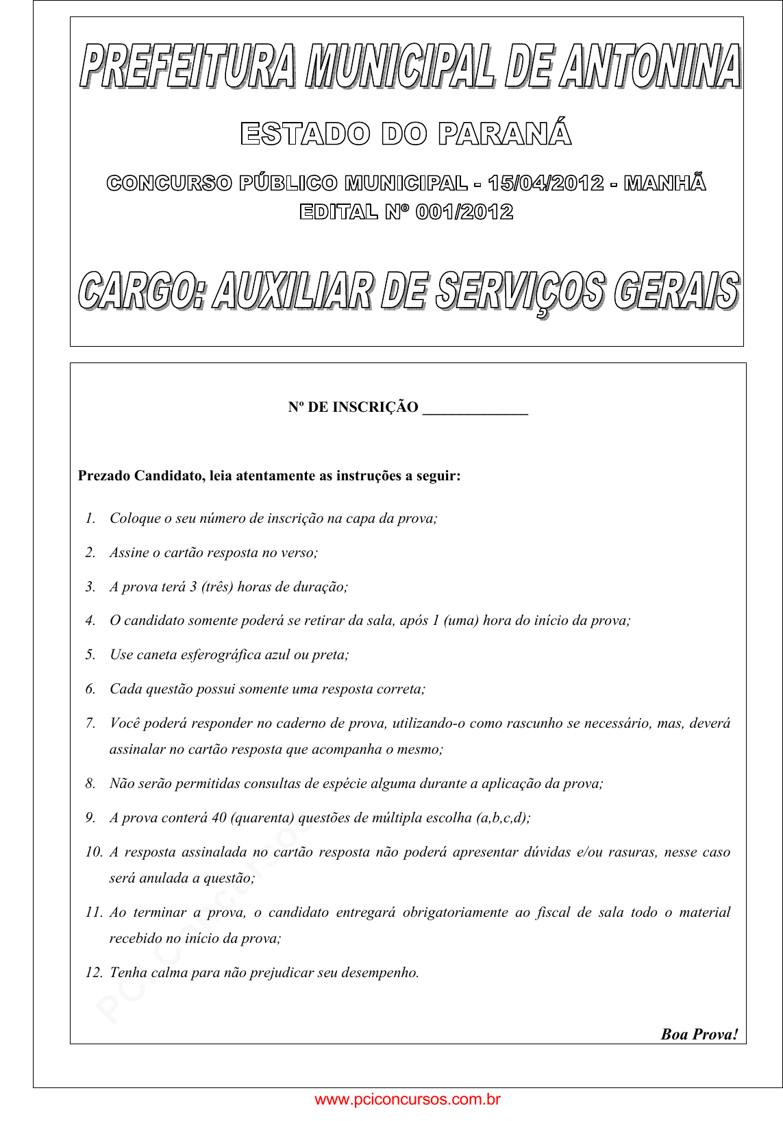 pcimarkpci MDAwMDowMDAwOjAwMDA6MDAwMDowMDAwOmZmZmY6YmFmOTpiNDVi:VGh1LCAyMyBKYW4gMjAyNSAxMjoyNDoyMSAtMDMwMA== www.pciconcursos.com.br Nº DE INSCRIÇÃO ______________ Prezado Candidato, leia atentamente as instruções a seguir: 1. Coloque o seu número de inscrição na capa da prova; 2. Assine o cartão resposta no verso; 3. A prova terá 3 (três) horas de duração; 4. O candidato somente poderá se retirar da sala, após 1 (uma) hora do início da prova; 5. Use caneta esferográfica azul ou preta; 6. Cada questão possui somente uma resposta correta; 7. Você poderá responder no caderno de prova, utilizando-o como rascunho se necessário, mas, deverá assinalar no cartão resposta que acompanha o mesmo; 8. Não serão permitidas consultas de espécie alguma durante a aplicação da prova; 9. A prova conterá 40 (quarenta) questões de múltipla escolha (a,b,c,d); 10. A resposta assinalada no cartão resposta não poderá apresentar dúvidas e/ou rasuras, nesse caso será anulada a questão; 11. Ao terminar a prova, o candidato entregará obrigatoriamente ao fiscal de sala todo o material recebido no início da prova; 12. Tenha calma para não prejudicar seu desempenho. Boa Prova! www.pciconcursos.com.br pcimarkpci MDAwMDowMDAwOjAwMDA6MDAwMDowMDAwOmZmZmY6YmFmOTpiNDVi:VGh1LCAyMyBKYW4gMjAyNSAxMjoyNDoyMSAtMDMwMA== www.pciconcursos.com.br 2 Uma Fábula Certa vez os animais resolveram preparar seus filhos para enfrentarem as dificuldades do mundo atual e, para isso, organizaram uma escola. Adotaram um currículo prático que constava de corrida, escalagem, natação e voo. Para facilitar o ensino, todos os alunos deveriam aprender todas as matérias. O pato, __________ em natação (melhor mesmo que o professor), conseguiu notas regulares em voo, mas era aluno fraco em corridas e escalagem. Para compensar esta fraqueza, ficava retido na escola todo o dia, fazendo exercícios extras. De tanto treinar corrida ficou com os pés terrivelmente esfolados e, por isso, não conseguia mais nadar como antes. Entretanto, como o sistema de promoção era a média aritmética das notas nos vários cursos, ele conseguiu ser um aluno sofrível, e ninguém se preocupou com o caso do pobre pato. O coelho era o melhor aluno do curso em corrida, mas sofreu tremendamente e acabou com um esgotamento nervoso, de tanto tentar a natação. O esquilo subira tremendamente, conseguindo belas notas no curso de escalagem, mas ficou frustrado no voo pois o professor o obrigava a voar de baixo para cima e ele insistia em usar os seus métodos, isto é, em subir nas árvores e voar de lá para o chão. Ele teve que se __________ tanto em natação que acabou por passar com nota mínima em escalagem, saindo-se mediocremente em corrida. A águia foi uma criança problema, severamente castigada desde o princípio do curso, porque usava métodos _____________ dela, para atravessar o rio ou subir nas árvores. No fim do ano, uma águia anormal que tinha nadadeiras conseguiu a melhor média em todos os cursos e foi a oradora da turma. Os ratos e os cães de caça não entraram na escola porque a administração se recusou a incluir duas matérias que eles julgavam importantes, como escavar tocas e escolher esconderijos. Acabaram por abrir uma escola particular junto com as marmotas e, desde o princípio, conseguiram grande sucesso. (Autoria não identificada) 01 - Assinale a alternativa que preenche corretamente as lacunas do texto: a) eximio – exforssar – esclusivos. b) exímio – esforçar – exclusivos. c) ezímio – exforçar – exclusivos. d) ezímio – esforssar – esclusivos. 02 - “Rio” é uma palavra dissílaba, assinale a alternativa em que as palavras retiradas do texto, também são dissílabas: a) média – cães. b) ano – pois. c) treinar – dia. d) coelho – atual. 03 - Assinale a alternativa em que a divisão silábica de aritmética está correta: a) a-rit-mé-ti-ca. b) arit-mé-ti-ca. c) a-ri-tmé-ti-ca. d) a-ri-t-mé-ti-ca. 04 - Assinale a alternativa em que os substantivos retirados do texto são epicenos: a) pato e coelho. b) marmotas e cães. c) pato e esquilo. d) águia e esquilo. 05 - Assinale a alternativa em que o plural está incorreto: a) chões. b) natações. c) promoções. d) administrações. 06 - Assinale a alternativa em que as palavras são acentuadas por serem proparoxítonas: a) matérias – árvore – aritmética. b) sofrível – princípio – currículo. c) currículo – prático – métodos. d) árvore – águia – vários. 07 - No segundo parágrafo, os parênteses são empregados para isolar: a) um pensamento. c) uma ironia. b) um comentário. d) uma ideia. www.pciconcursos.com.br pcimarkpci MDAwMDowMDAwOjAwMDA6MDAwMDowMDAwOmZmZmY6YmFmOTpiNDVi:VGh1LCAyMyBKYW4gMjAyNSAxMjoyNDoyMSAtMDMwMA== www.pciconcursos.com.br 3 08 - “Nervoso” se escreve com “s”. Assinale a alternativa em que as palavras também são escritas com “s”: a) surpre___a. /// afetuo___o. b) bele___a /// brave___a. c) pobre___a /// valoro___o. d) esperte___a /// delicade___a. 09 - A afirmativa incorreta, de acordo com o texto, é: a) O currículo escolar elaborado pelos animais constava de matérias abrangentes a todas as espécies. b) Para os animais a existência da escola era importante, porque seus filhos seriam preparados para enfrentar as dificuldades do mundo atual. c) A média aritmética é o melhor sistema de avaliação do aproveitamento dos alunos. d) A escola respeitava as aptidões e habilidades naturais de cada aluno. 10 - O texto deixa claro que o professor era: a) autoritário, mas preocupado com o bem estar de seus alunos. b) autoritário e indiferente ao que acontecia com seus alunos. c) um ótimo profissional, dominava com eficiência todas as disciplinas previstas no currículo. d) compreensível com os alunos que tinham dificuldades na aprendizagem. 11 - Mirtes saiu de casa com duas notas de R$ 50,00. Sabe-se que ela gastou R$ 34,00 na boutique e R$ 27,00 no sal