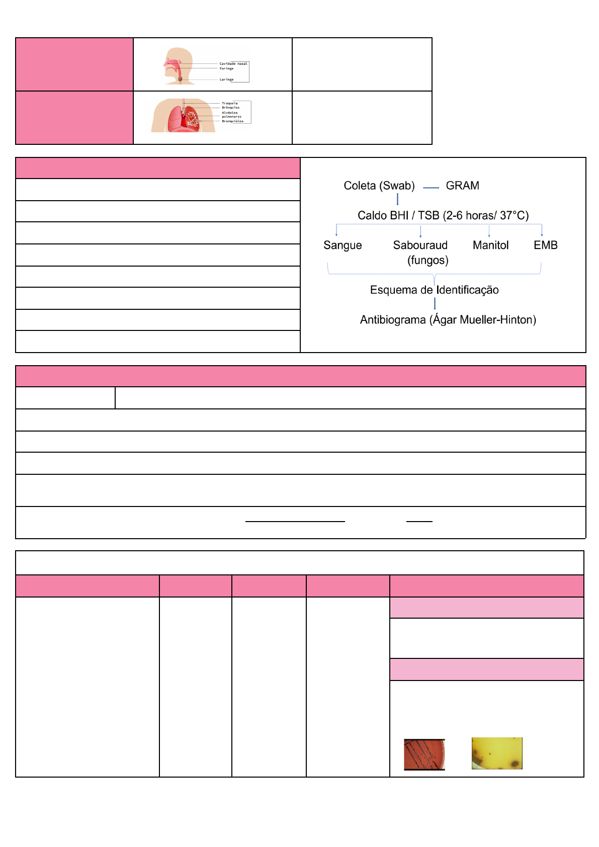 CULTURA DE OROFARINGE Trato respiratório superior Streptococcus pyogenes Staphylococcus aureus Grupo CFG Corynebacterium diphtheriae Trato respiratório inferior Mycobacterium tuberculosis Streptococcus pneumoniae Klebsiella pneumoniae Haemophilus influenzae População transitória da orofaringe Streptococcus α hemolíticos Neisseria saprófitas Staphylococcus coagulase negativa Staphylococcus aureus (ás vezes) Haemophilus haemolyticus Difteróides Algumas enterobactérias (transitório decorrente da dieta) Anaeróbios (Bacteroides, Actinomyces) Coleta de secreção de orofaringe Preparo do paciente Colher antes do desjejum e da higiene oral (caso não seja possível jejum mínimo de duas horas) 1- Inclinar a cabeça do paciente para trás e abrir bem a boca, usando foco de luz. 2- A língua é pressionada com uma espátula para que se possa visualizar as fossas tonsilares e a faringe posterior; 3- Pedir ao paciente que faça um “ah” (levanta a úvula e evita ânsias de vômitos); 4- Evitar tocar na língua e na mucosa bucal. Procurar o material nas áreas com hiperemia próximas aos pontos de supuração ou remover o pus ou a placa, coletando o material abaixo da placa. 5- Coletar dois swabs, um para confecção imediata da lâmina de bacterioscopia e outro para o cultivo, transportado em meio de transporte adequado (Stuart). Corynebacterium diphtheriae Características Reservatório Incubação Transmissão Identificação - Bacilos gram + (letras chinesas) - Resistentes → podendo suportar calor, frio e ressecamento - Aeróbios e pleomórficos - Imóveis - Não capsulados e não esporulados - Produtor da toxina diftérica (toxicidade é atribuída à exotoxina) - Receptor para a toxina nas células nervosas e cardíacas - Bactéria não tem poder invasivo - É o próprio doente ou portador; - Portador = é importante na disseminação do bacilo, pela maior frequência na comunidade e por ser assintomático. - 1 a 6 dias, podendo ser mais longo (10 dias). - Contágio direto com doentes ou portadores (secreções de rinofaringe) - Transmissão direta (objetos contaminados pelas secreções de orofaringe ou de lesões em outras localidades) Meios não seletivos Ágar sangue (pequena zona de hemólise) Meio de Loeffler (aumenta a formação de grânulos metacromáticos) Meios seletivos Ágar sangue com telurito de potássio e cistina (CT) - (colônias negras) Meio de Tinsdale (forma um halo acastanhado marrom) → 24-48 horas a 37°C HEMOCULTURA Sangue Isento de qualquer tipo de microrganismo Corrente circulatória Bactérias penetram Bacteremia Bactérias viáveis no sangue circulante Origem da bacteremia Intravascular (primária) Extravascular (secundária) - Entrada direta na corrente sanguínea > via agulhas, infusões contaminadas, cateteres ou outros dispositivos vasculares; - Tendo origem no próprio sistema > endocardite bacteriana, fístulas arteriovenosas e flebites supurativas; - Drenagem de pequenos vasos sanguíneos ou linfáticos → seguindo para a corrente circulatória como consequência de um foco de infecção definido em outro sítio do organismo; Porta de entrada mais comuns (origem comunitária e hospitalar) Dispositivos intravasculares 19% Trato biliar 4% Trato geniturinário 17% Abscessos intra-abdominal 3% Trato respiratório 12% Mistura de sítios 8% Infecções cirúrgicas da pele 5% Sítios incertos 27% Trato gastrointestinal 5% Bacteremia representa bactérias ou suas toxinas causando danos ao hospedeiro Falha nas defesas do hospedeiro em localizar e neutralizar uma determinada infecção em seu foco primário Falha médica em remover ou drenar um foco primário Manifestações clínicas BACTEREMIA (presença de bactérias na corrente sanguínea) SEPSE (bactérias ou suas toxinas causando danos ao hospedeiro) - Consequente a uma infecção intravascular, pneumonia, abscesso hepático; - Liberação transitória de bactérias no sangue. - Inflamação generalizada do próprio organismo contra uma infecção que pode estar localizada em qualquer órgão; - A inflamação que surge em locais infectados não é provocada pela bactéria, mas sim pela resposta imunológica do corpo; - Condição onde a resposta do organismo ao agente infeccioso se manifesta, por meio de sinais e sintomas da doença (exemplo a síndrome da resposta inflamatória sistêmica - SRIS) → Sintomas: produzidos tanto por toxinas microbianas como por citocinas produzidas por células inflamatórias. - Está tradicionalmente ligada a bactérias gram negativas, embora algumas positivas também causem síndrome séptica - Infecções ou lesões graves > respostas exacerbadas de Th1 > lesões em órgãos alvo > insuficiência de múltiplos órgãos e à morte SUSPEITA de sepse grave ou choque séptico MANIFESTAÇÕES MAIS SÉRIAS - Independente do foco infeccioso - Antes da administração da terapia antimicrobiana empírica → Coletar para hemocultura – Choque séptico – Coagulação intravascular disseminada – Falência dos órgãos SUSPEITA de bacteremia clinicamente significativa > FAZER HEMOCULTURA Sepse clássica Endocardite bacteriana Diagnóstico de certas infecções Calafrio, febre, prostração, arrepios, hiperventilação > alcalose respiratória, lesão de pele, mudança no "status" mental e diarreia. Febres entéricas (salmoneloses), leptospirose, brucelose, e febre de origem desconhecida. Classificação de SEPSE (padrão clínico) Transitória Intermitente Contínuas ou persistentes Bacteremia de escape (“breakthrough”) - Duração rápida a) após manipulação de algum tecido infectado (abscessos, furúnculos e celulite). b) procedimentos cirúrgicos que envolvem tecidos contaminados ou colonizados (cavidade oral, cistoscopia, endoscopia, histerectomia vaginal e desbridamento de queimaduras); c) infecções agudas como pneumonias, meningite, osteomielite, artrites sépticas - Ocorre em intervalos variáveis de tempo com o mesmo microrganismo; → Processos 