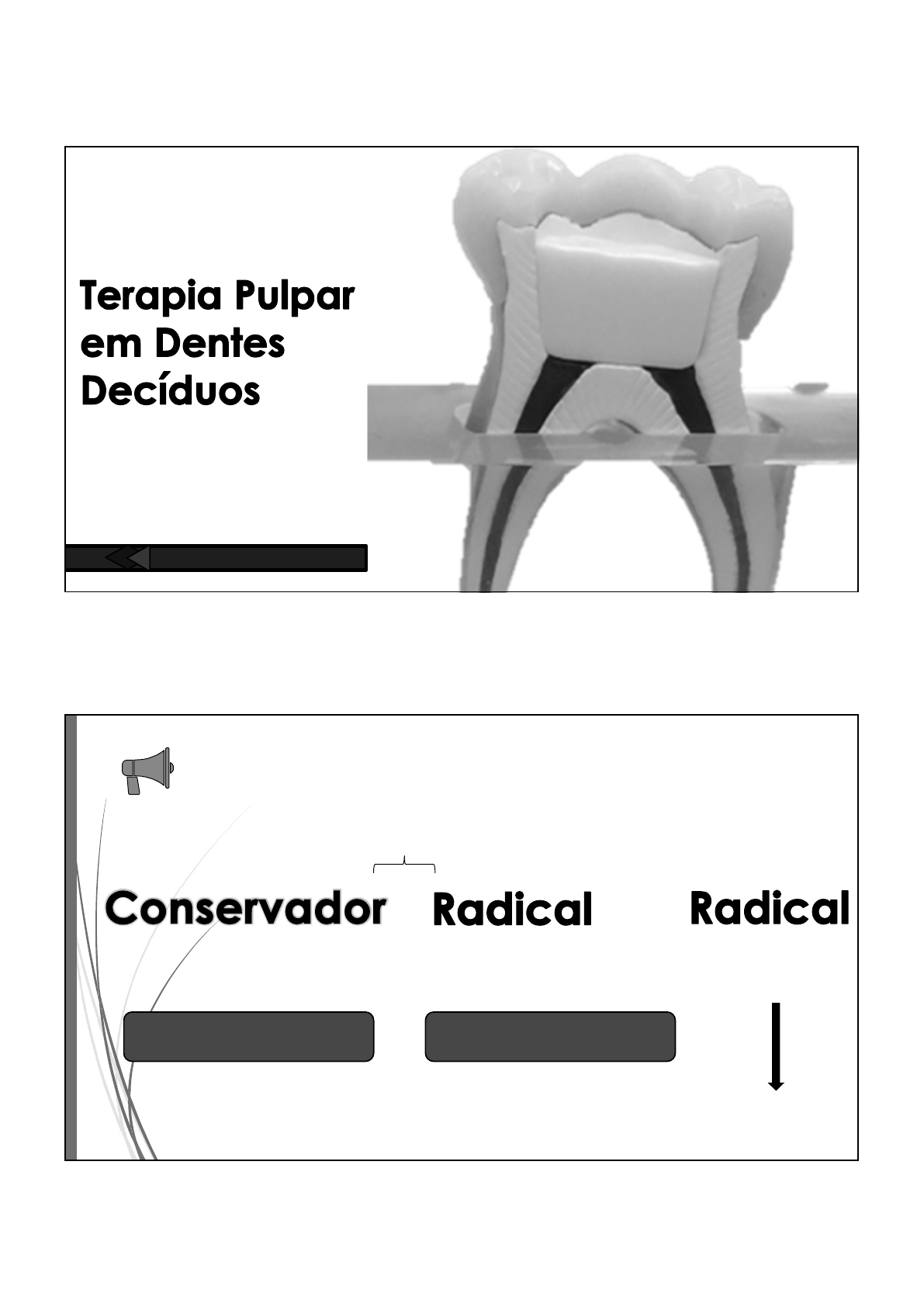 12/10/2023 Professoras Maria Cláudia Débora Souto U N I T R I -2023 Tipos de tratamento Pulpotomia Pulpectomia Para o Dente Exodontia Po lpa 1 2 12/10/2023 DIAGNÓSTICO Anamnese Exame Clínico Radiográfico *Transoperatório Difícil de obter relatos precisos Anamnese Presença de dor. Dor persistente ou ocasional? Dor é provocada ou espontânea? (frio, calor, mastigação, durante a noite) Localização da dor. 3 4 12/10/2023 Exame clínico extra-bucal Assimetria facial Aumento de volume Alteração de cor Exame clínico bucal Tecidos moles Dentes Alteração de cor Aumento de volume Abscessos Fístulas 5 6 12/10/2023 Exame radiográfico Reabsorção interna Fraturas radiculares Grau de reabsorção fisiológico Reabsorção óssea Testes pulpares (elétrico e térmico) não são recomendados em crianças 7 8 12/10/2023 Aspectos radiográficosSinais clínicosDorDiagnóstico Periápice e espaço interradicular normais. Lesão de cárie profunda. Exposição e hiperplasia pulpares (pólipo). Provocada à mastigação. Pulpite crônica hiperplásica Espessamento do espaço do ligamento e/ou reabsorção interna. Lesão cariosa ativa profunda, com ou sem exposição pulpar. Restauração insatisfatória. Espontânea, contínua, pulsátil, reflexa, comum durante a noite. Pulpite aguda (inflamação grave) Tratamento Endodôntico Dentes Decíduos P o s s í v e i s D i a g n ó s t i c o s Tratamento Endodôntico Dentes Decíduos Possíveis Diagnósticos Aspectos radiográficosSinais clínicosDorDiagnóstico Reabsorção internaLesão de cárie profunda, com ou sem exposição pulpar. Provocada por estímulo térmico (calor) Alteração pulpar Degenerativa Reabsorção interna patológica. Rarefação óssea periapical e interradicular. Lesão de cárie profunda com ou sem exposição clínica pulpar. Os tecidos moles podem apresentar edema, fístula ou abscesso. -Necrose pulpar 9 10 12/10/2023 Terapias pulpares Capeamento pulpar direto Capeamento pulpar indireto Pulpotomia Fuks, 2008 Polpa Vital Pulpite reversível Aula de Hoje P u l p ot o mi a (Reis e Morais, 2017). A pulpotomia é uma técnica endodôntica de conservação do dente e da vitalidade pulpar, onde o tecido pulpar coronal é removido para eliminar a polpa infectada ou contaminada e preservar a polpa saudável dos canais radiculares. 11 12 12/10/2023 P u l p ot o mi a (Reis e Morais, 2017). • Indicação • Exposição acidental (cárie ou trauma nas primeiras 24h); Pequena exposição acidental maior que 1mm e hemostasia em 5 minutos; Sangramento vermelho vivo e deve parar em até 5 minutos; Polpa apresenta resistência ao corte; Ter 2/3 de raiz. P u l p ot o mi a (Reis e Morais, 2017). • Contra indicação Paciente que possui dor espontânea e prolongada, mobilidade e descoloração do dente; Sinais patológicos radiográficos; Sangramento que não sessa e de cor vermelho escuro. 13 14 12/10/2023 P u l p ot o mi a • Agentes de pulpotomia: Cimento hidróxido de cálcio; MTA; Formocresol; Pasta Guedes-Pinto; (Chen et al., 2019).(Guedes et al., 2006); P u l p ot o mi a (Reis e Morais, 2017). Protocolo: 1. Remoção do restante do tecido cariado com broca esférica (alta rotação no esmalte e baixa rotação dentina); 2. Remoção do teto da câmara pulpar com a broca Endo Z (abertura coronária seguindo localização dos canais radiculares, assim como na pulpectomia); 3. Remoção da polpa coronária com cureta afiada (exclusiva para amputação da polpa coronária); 4. Irrigação da cavidade com soro fisiológico; 5. Secagem da cavidade e obtenção de hemostasia com algodão estéril seco, pressionado durante 5 minutos sobre a exposição; 15 16 12/10/2023 P u l p ot o mi a (Reis e Morais, 2017). Protocolo: 6. Aplicação da pasta constituída por hidróxido de cálcio pró-análise + soro fisiológico sobre o assoalho da câmara pulpar e a entrada dos canais radiculares; 7. Aplicação de cimento de hidróxido de cálcio sobre a pasta de hidróxido de cálcio; 8. Base com ionômero de vidro; 9. Posteriormente, avaliação da necessidade de rebaixar a restauração e de realizar uma restauração em resina composta ou de confeccionar coroa; 10. Controle clínico e radiográfico. Tratamento Radical: Pulpectomia 17 18 12/10/2023 Pulpite Irreversível Fuks, 2008 Sinais de alterações pulpares irreversíveis Sinais de necrose pulpar Pulpite Irreversível Fuks, 2008 Técnica de tratamento radical para a polpa; Remoção de toda a polpa (coroa e raízes); Manter o dente na cavidade bucal; Elimina o foco de infecção bacteriana do dente. 19 20 12/10/2023 Pulpectomia Odontometria Preparo do paciente Abertura coronária Curativo de demora Preparo biomecânico e irrigação Obturação e restauração 1º 4º 5º 3º2º 6º Preparo do paciente 21 22 12/10/2023 Biossegurança Anestesia local first 23 24 12/10/2023 Isolamento absoluto Molares Incisivos Isolamento absoluto 25 26 12/10/2023 Desinfecção Profilaxia dentária Desinfecção com Clorexidina 2% Mario Leonardo, 2008 Odontometria 27 28 12/10/2023 ODONTOMETRIA Distância da cúspide até o ápice é o comprimento total. Mas devido a alguns detalhes, o comprimento de trabalho requer recuar. Dentes anteriores Situação 1 Situação 2 Toledo, 2012 29 30 12/10/2023 Dentes posteriores 3 Toledo, 2012 Abertura coronária 31 32 12/10/2023 Abertura coronária Acesso inicial Broca esférica Remoção do teto Desgaste compensatório Broca Endo Z Tratamento Endodôntico Dentes Decíduos Desgaste Compensatório Broca Endo Z • Dentes anteriores: Remoção do ombro palatino • Molares: Remoção da convexidade das paredes da câmara pulpar (principalmente das mesiais). 33 34 12/10/2023 Tratamento Endodôntico Dentes Decíduos Abertura e Acesso/ Anteriores Ponto de eleição: região de cíngulos e região central Direção de trepanação: perpendicular a parede lingual/palatina Forma de conveniência: triangular Tratamento Endodôntico Dentes Decíduos Abertura e Acesso/ Poste