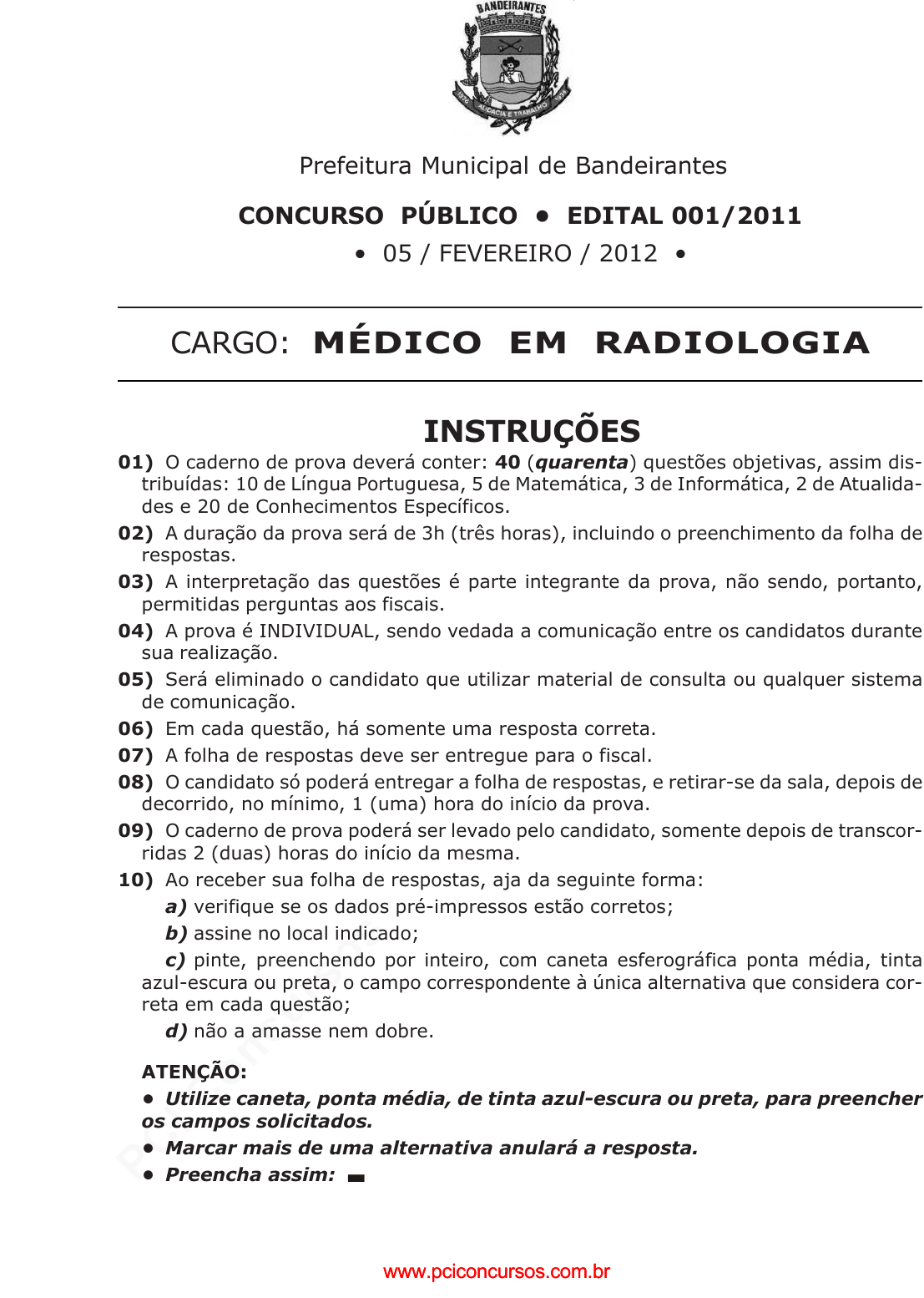 pcimarkpci MDAwMDowMDAwOjAwMDA6MDAwMDowMDAwOmZmZmY6YjEzMzo0YjIw:VGh1LCAyMyBKYW4gMjAyNSAxMzowNjowOCAtMDMwMA== www.pciconcursos.com.br Prefeitura Municipal de Bandeirantes CONCURSO PÚBLICO • EDITAL 001/2011 • 05 / FEVEREIRO / 2012 • CARGO: MÉDICO EM RADIOLOGIA INSTRUÇÕES 01) O caderno de prova deverá conter: 40 (quarenta) questões objetivas, assim dis- tribuídas: 10 de Língua Portuguesa, 5 de Matemática, 3 de Informática, 2 de Atualida- des e 20 de Conhecimentos Específicos. 02) A duração da prova será de 3h (três horas), incluindo o preenchimento da folha de respostas. 03) A interpretação das questões é parte integrante da prova, não sendo, portanto, permitidas perguntas aos fiscais. 04) A prova é INDIVIDUAL, sendo vedada a comunicação entre os candidatos durante sua realização. 05) Será eliminado o candidato que utilizar material de consulta ou qualquer sistema de comunicação. 06) Em cada questão, há somente uma resposta correta. 07) A folha de respostas deve ser entregue para o fiscal. 08) O candidato só poderá entregar a folha de respostas, e retirar-se da sala, depois de decorrido, no mínimo, 1 (uma) hora do início da prova. 09) O caderno de prova poderá ser levado pelo candidato, somente depois de transcor- ridas 2 (duas) horas do início da mesma. 10) Ao receber sua folha de respostas, aja da seguinte forma: a) verifique se os dados pré-impressos estão corretos; b) assine no local indicado; c) pinte, preenchendo por inteiro, com caneta esferográfica ponta média, tinta azul-escura ou preta, o campo correspondente à única alternativa que considera cor- reta em cada questão; d) não a amasse nem dobre. ATENÇÃO: • Utilize caneta, ponta média, de tinta azul-escura ou preta, para preencher os campos solicitados. • Marcar mais de uma alternativa anulará a resposta. • Preencha assim: www.pciconcursos.com.brwww.pciconcursos.com.br pcimarkpci MDAwMDowMDAwOjAwMDA6MDAwMDowMDAwOmZmZmY6YjEzMzo0YjIw:VGh1LCAyMyBKYW4gMjAyNSAxMzowNjowOCAtMDMwMA== www.pciconcursos.com.br 2 - Prefeitura Municipal de Bandeirantes - Concurso Público 001/2011 LÍNGUA PORTUGUESA TEXTO 1 – REFERÊNCIA PARA AS QUESTÕES 01, 02 E 03. 5 razões que fizeram a TAM tropeçar no terceiro trimestre São Paulo – A TAM acumulou prejuízo líquido de 619,7 milhões de reais no terceiro trimestre de 2011, revertendo o lucro de 733 milhões de reais somado um ano antes. Várias razões levaram a companhia a registrar resultado negativo no período. Segundo a TAM, o efeito câmbio, que totalizou despesas de 1,3 bilhão de reais no terceiro trimestre, no entanto, foi uma das principais. Veja, a seguir, 5 motivos que jus- tificam o prejuízo da TAM no terceiro trimestre: 1) A apreciação do dólar foi determinante nos resultados financeiros da TAM. No terceiro trimestre do ano, as perdas cambiais gera- ram despesas extras à companhia de 1,3 bilhão de reais, pois impactaram diretamen- te a dívida que a TAM possui em moeda ame- ricana. No mesmo período de 2010, a em- presa havia somado receita de 345,2 milhões de reais devido à valorização do real. 2) No terceiro trimestre também, a Infraero re- cebeu da TAM o equivalente a 37 milhões de reais. O montante refere-se à cobrança das diferenças do peso máximo de decola- gem de anos anteriores. Segundo a compa- nhia, o pagamento é não-recorrente, ou seja, não deve se repetir nos próximos trimes- tres. 3) Além do gasto não-recorrente, as despesas operacionais da TAM também cresceram no terceiro trimestre. No período, os gastos atingiram a cifra de 2,7 bilhões de reais, alta de 22,5% na comparação com o mesmo pe- ríodo de 2010. A alta está relacionada ao au- mento das despesas com pessoal, manuten- ção, serviço de terceiros, tarifas de pouso e depreciação. 4) Além do prejuízo líquido, o lucro antes de juros, impostos, depreciação e amortização da TAM foi menor no terceiro trimestre, ten- do impacto direto na margem. No período, o ebitda totalizou 739,1 milhões de reais, queda de 13,1% na comparação com o mes- mo trimestre do ano anterior. A margem ebitda caiu 6,9 pontos percentuais, para 22,3%. 5) Os gastos com combustíveis cresceram 34% no terceiro trimestre, somando mais de 1,1 bilhão de reais. Além do aumento de 21% do preço médio por litro, a companhia tam- bém aumentou em quase 10% o volume de combustível consumido no período, devido a mais horas voadas. Adaptado de: 5 razões que fizeram a TAM tropeçar no terceiro trimestre. Disponível em: E- EXAME.COM. - 10/11/2011- Daniela Barbosa. . Acesso em: 10 nov. 2011. Questão 01) No texto sobre a TAM, afirma-se que seus prejuízos no terceiro trimestre de 2011 tive- ram inúmeros motivos. Assinale a alternativa em que todas as opções estão corretas. 1) Questões cambiais (perdas). 2) Aumento do preço do combustível. 3) Pagamento efetuado à Embraer (dívida). 4) Expansão das despesas operacionais. 5) Tarifas mais baixas das concorrentes. A) 1 e 5 B) 2 e 3 C) 3 e 4 D) 1 e 2 E) 2 e 5 Questão 02) Marque a alternativa que correspon- de às lacunas. Não gosto de andar ____ pé, portanto irei ____ Curitiba de TAM. Como sempre há turbulência, estarei cara ____ cara com o perigo. Depois regressarei ____ terra natal. A) à, a, a, a. B) a, à, à, a. C) a, a, à, à. D) a, a, a, à. E) à, à, à, à. www.pciconcursos.com.brwww.pciconcursos.com.br pcimarkpci MDAwMDowMDAwOjAwMDA6MDAwMDowMDAwOmZmZmY6YjEzMzo0YjIw:VGh1LCAyMyBKYW4gMjAyNSAxMzowNjowOCAtMDMwMA== www.pciconcursos.com.br MÉDICO EM RADIOLOGIA - 3 Questão 03) A partir da leitura do Texto 1, publi- cado pela Revista Exame, é correto inferir que: A) a TAM saiu prejudicada devido a paralisações dos seus funcionários devido aos baixos salários. B) os funcionários da TAM reclamaram, na justiça trabalhista, pelo excesso de trabalho e horas mal dormidas. C) a Infraero indenizou a TAM, que efetuou o repas- se da indenização a quem de direito. D) a TAM é a companhia aérea que
