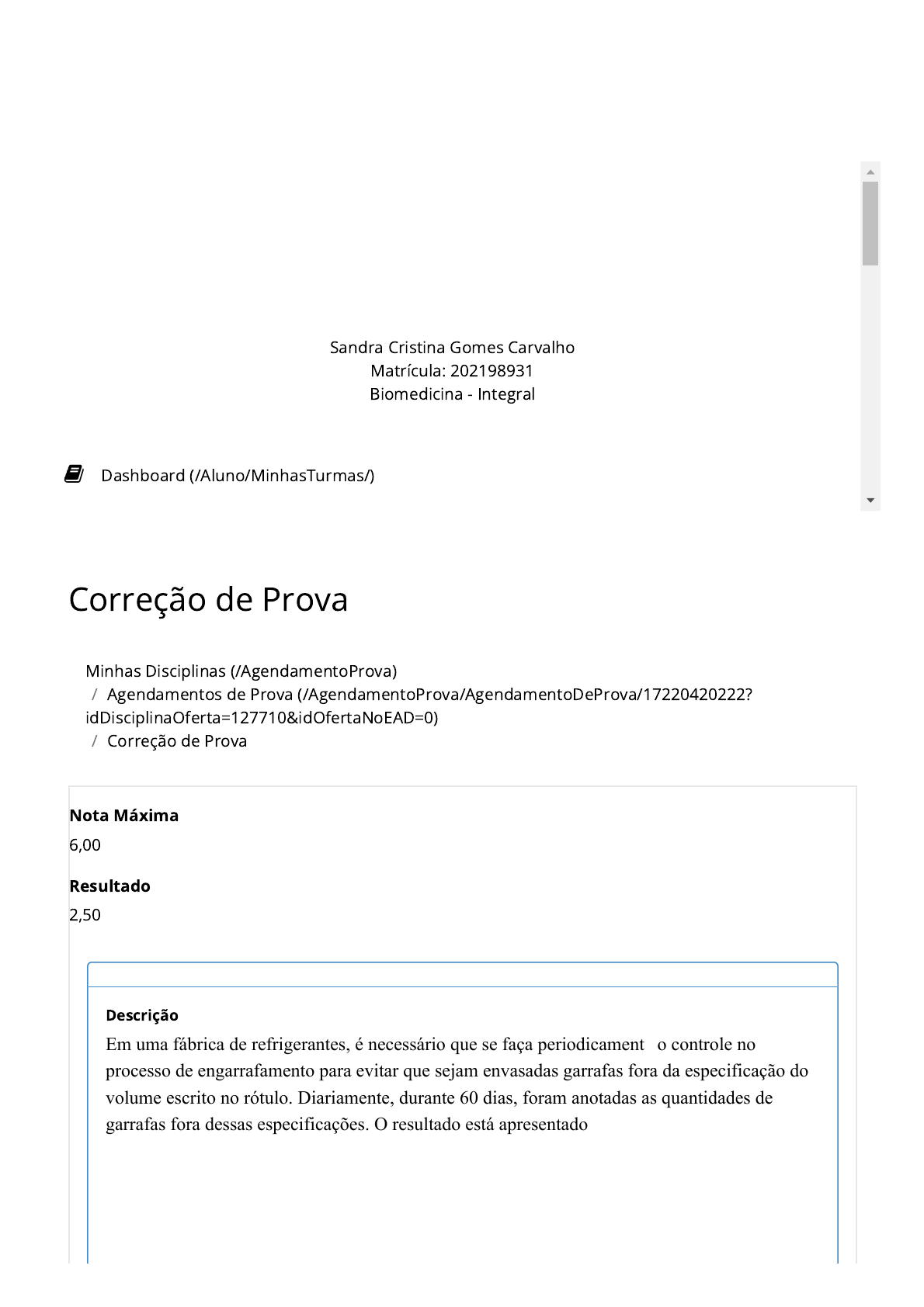 04/10/2022 18:14 Portal do Aluno https://aluno.uvv.br/AgendamentoProva/VisualizarCorrecaoAluno/17220420222?idDisciplinaOferta=127710&token=uRNxWWryXJ8%3D 1/14 Sandra Cristina Gomes Carvalho Matrícula: 202198931 Biomedicina - Integral Dashboard (/Aluno/MinhasTurmas/) Minhas Disciplinas (/AgendamentoProva) / Agendamentos de Prova (/AgendamentoProva/AgendamentoDeProva/17220420222? idDisciplinaOferta=127710&idOfertaNoEAD=0) / Correção de Prova Correção de Prova Nota Máxima 6,00 Resultado 2,50 Descrição Em uma fábrica de refrigerantes, é necessário que se faça periodicamente o controle no processo de engarrafamento para evitar que sejam envasadas garrafas fora da especificação do volume escrito no rótulo. Diariamente, durante 60 dias, foram anotadas as quantidades de garrafas fora dessas especificações. O resultado está apresentado no quadro. https://aluno.uvv.br/Aluno/MinhasTurmas/ https://aluno.uvv.br/Aluno/InformacoesPessoais/ https://aluno.uvv.br/AgendamentoProva https://aluno.uvv.br/AgendamentoProva/AgendamentoDeProva/17220420222?idDisciplinaOferta=127710&idOfertaNoEAD=0 04/10/2022 18:14 Portal do Aluno https://aluno.uvv.br/AgendamentoProva/VisualizarCorrecaoAluno/17220420222?idDisciplinaOferta=127710&token=uRNxWWryXJ8%3D 2/14 Calcule a média de garrafas fora das especi�cações encontradas durante o estudo. Resposta Discursiva Nota Máxima 0,50 Nota 0,50 Comentário da Resposta Descrição Um comerciante que vende seus produtos via aplicativos de fotos pretende presentear 3% dos seus clientes baseados nos valores mensais gastos por seus clientes nas compras de seus produtos. Qual cálculo o vendedor poderá realizar para descobrir qual é o valor a ser considerado como "limite de corte", ou seja, o valor mínimo que o cliente deverá ter gasto mensalmente comprando produtos para ser presenteado pelo vendedor? Resposta Discursiva O comerciante terá que ordenar em ordem crescente, de forma que ele saberá quem são os cliente que mais gastam e fazer um calculo dos quartis, colocando os clientes que mais gastam dividos em Q0, Q1,Q2,Q3, Q4. Assim ele saberá quem são os clientes a serem presentados. Nota Máxima 0,50 Nota 0,50 Comentário da Resposta 04/10/2022 18:14 Portal do Aluno https://aluno.uvv.br/AgendamentoProva/VisualizarCorrecaoAluno/17220420222?idDisciplinaOferta=127710&token=uRNxWWryXJ8%3D 3/14 Descrição Abaixo são apresentadas uma lista de seis variáveis aleatórias. Marca de carro preferida; Grau de satisfação com a academia frequentada; Peso de saca de café Conilon (em quilos); Produto interno bruto (em reais); Nível de escolaridade; Número pessoas contaminadas por Covid-19. Em relação a classi�cação destas variáveis em qualitativa nominal, qualitativa ordinal, quantitativa discreta e quantitativa contínua, qual das sequências abaixo é a correta, considerando a sequência na ordem em que foram apresentadas as variáveis: A Qualitativa nominal, Qualitativa nominal, Quantitativa contínua, Quantitativa contínua, Qualitativa ordinal, Quantitativa discreta B Qualitativa nominal, Qualitativa ordinal, Quantitativa contínua, Quantitativa contínua, Qualitativa ordinal, Quantitativa contínua C Qualitativa nominal, Qualitativa ordinal, Quantitativa contínua, Quantitativa contínua, Qualitativa ordinal, Quantitativa discreta D Qualitativa nominal, Qualitativa ordinal, Quantitativa contínua, Quantitativa discreta, Qualitativa ordinal, Quantitativa discreta E Qualitativa ordinal, Quantitativa ordinal, Quantitativa contínua, Quantitativa contínua, Qualitativa ordinal, Quantitativa contínua. Nota 0,00 04/10/2022 18:14 Portal do Aluno https://aluno.uvv.br/AgendamentoProva/VisualizarCorrecaoAluno/17220420222?idDisciplinaOferta=127710&token=uRNxWWryXJ8%3D 4/14 Descrição Avalie as variáveis estatísticas apresentadas a seguir: I. Número de crianças com fenilcetonúria em um município. II. Forma de produção de determinado alimento (tradicional ou orgânico). III. Concentração de gorduras saturadas (g/L) em uma bebida industrializada. IV. Bairro de origem dos indivíduos atendidos em uma clínica. Considerando a classi�cação das variáveis citadas, assinale a alternativa que indica a sequência correta de classi�cação conforme ordem de apresentação das variáveis: A Discreta, Nominal, Contínua, Nominal. B Contínua, Ordinal, Discreta, Nominal. C Ordinal, Contínua, Discreta, Nominal. D Discreta, Ordinal, Discreta, Nominal. E Nominal, Contínua, Nominal, Discreta. Nota 0,50 Descrição Analise as informações apresentadas na tabela a seguir: 04/10/2022 18:14 Portal do Aluno https://aluno.uvv.br/AgendamentoProva/VisualizarCorrecaoAluno/17220420222?idDisciplinaOferta=127710&token=uRNxWWryXJ8%3D 5/14 Fonte: DANTAS, A.P.; BRANDT, C.T. & LEAL, D.N.B. 2005. Manifestações oculares em pacientes que tiveram desnutrição nos primeiros seis meses de vida. Arquivos Brasileiros de Oftalmologia 68 (6): 753-756. Com base nos seus conhecimentos sobre distribuição de frequências, avalie as afirmativas apresentadas a seguir: I. A frequência absoluta de indivíduos do grupo controle com acuidade visual igual a 1,0 foi de 63,2%. II. A ocorrência de crianças com acuidade visual variando entre “0,3 a 0,1" e “menor do que 0,1” foi proporcionalmente maior no grupo que teve desnutrição nos primeiros seis meses de vida (frequência relativa: fr = 0,1154), em comparação com indivíduos do grupo controle (fr = 0,0066). III. Entre os indivíduos amostrados, 115 pacientes que tiveram desnutrição nos primeiros seis meses de vida apresentaram acuidade visual entre 1,0 e 0,4, correspondendo a 88,5% dos indivíduos amostrados nesta categoria (frequência relativa acumulada: Fr = 0,885). É correto o que se afirma em: A I e II, apenas. B I, apenas. C I e III, apenas. D II e III, apenas. 04/10/2022 18:14 Portal do Aluno https://aluno.uvv.br/AgendamentoProva/VisualizarCorrecaoAluno/17220420222?idDisciplinaOferta=127710&token=uRNxWWryXJ8%3D 6