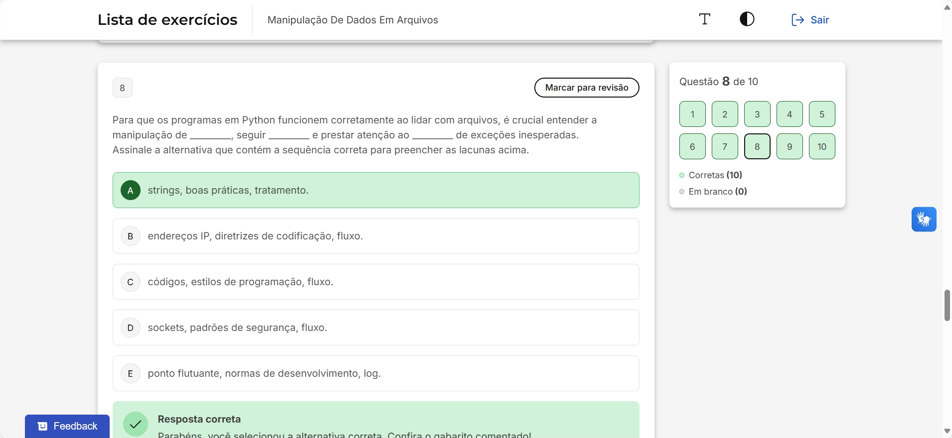 Lista de exercícios Manipulação De Dados Em Arquivos T Sair Questão 8 de 10 8 Marcar para revisão 1 2 3 4 5 Para que os programas em Python funcionem corretamente ao lidar com arquivos, é crucial entender a manipulação de seguir e atenção ao de exceções inesperadas. Assinale a alternativa que contém a sequência correta para preencher as lacunas acima. 6 7 8 9 10 Corretas (10) A strings, boas práticas, tratamento. Em branco (0) B endereços IP, diretrizes de codificação, fluxo. C códigos, estilos de programação, fluxo. D sockets, padrões de segurança, fluxo. E ponto flutuante, normas de desenvolvimento, log. Resposta correta Feedback