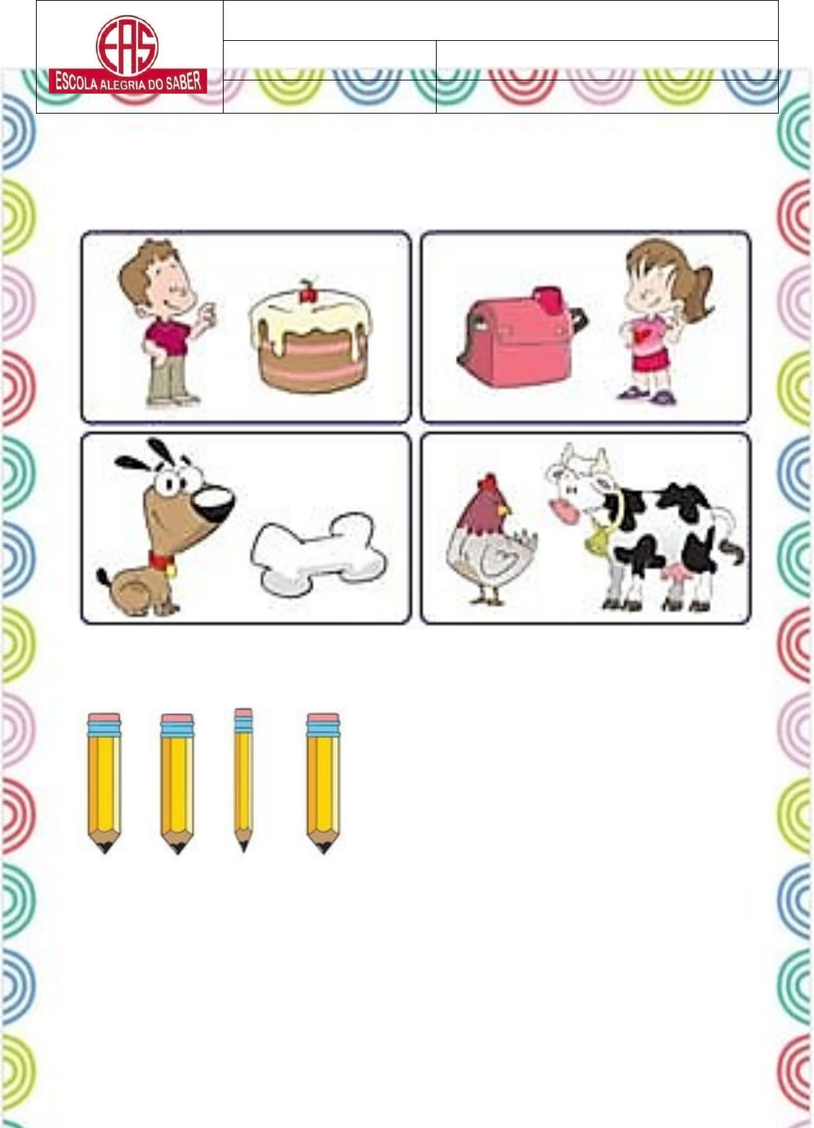 Escola: Alegria do Saber Data: Aluno(a): Pró: Daniele Série: 1º Ano Prova de Matemática – I Unidade 1º) No mundo real, umas das coisas que estão em cada quadrado abaixo é menor que a outra. Faça um circulo em volta de tudo que é menor. 2º Passe um traço no lápis mais fino. 3º Vamos somar! a) 3 + 5 = ________________ d) 5 + 2 = _________________ b) 9 + 1 = ________________ e) 7 + 2 = _________________ c) 1 + 7 = ________________ f) 8 + 8 = _________________ 4º Complete com os números faltosos. 5º Conte e escreva o número de objetos de cada grupo. 6º Pinte os patos que estão dentro do lago e circule o pato que está fora do lado. 7º Circule o objeto que está em cima da mesa e pinte o objeto que está embaixo da mesa. 8º Faça um x no pote de mel que está vazio e circule o pote que está cheio. 9º Pinte a colmeia mais comprida. 10º Leve a abelhinha até o caule mais curto. image4.jpeg image5.png image6.png image7.png image8.png image9.gif image10.png image11.png image12.png image1.jpeg image2.png image3.png Prova de Matemática – I Unidade 1º) No mundo real , umas das coi sas que estão em cada quadrado abaixo é menor que a outra. Faça um circulo em volta de tudo que é menor. 2º Pas se um traço no lápis mais fino. 3º Vamos somar! a) 3 + 5 = ________________ d) 5 + 2 = _________________ b) 9 + 1 = ________________ e) 7 + 2 = _________________ c) 1 + 7 = ________________ f) 8 + 8 = _________________ Escola: Alegria do Saber Data: Aluno(a): Pró: Daniele Série: 1º Ano Prova de Matemática – I Unidade 1º) No mundo real, umas das coisas que estão em cada quadrado abaixo é menor que a outra. Faça um circulo em volta de tudo que é menor. 2º Passe um traço no lápis mais fino. 3º Vamos somar! a) 3 + 5 = ________________ d) 5 + 2 = _________________ b) 9 + 1 = ________________ e) 7 + 2 = _________________ c) 1 + 7 = ________________ f) 8 + 8 = _________________ Escola: Alegria do Saber Data: Aluno(a): Pró: Daniele Série: 1º Ano