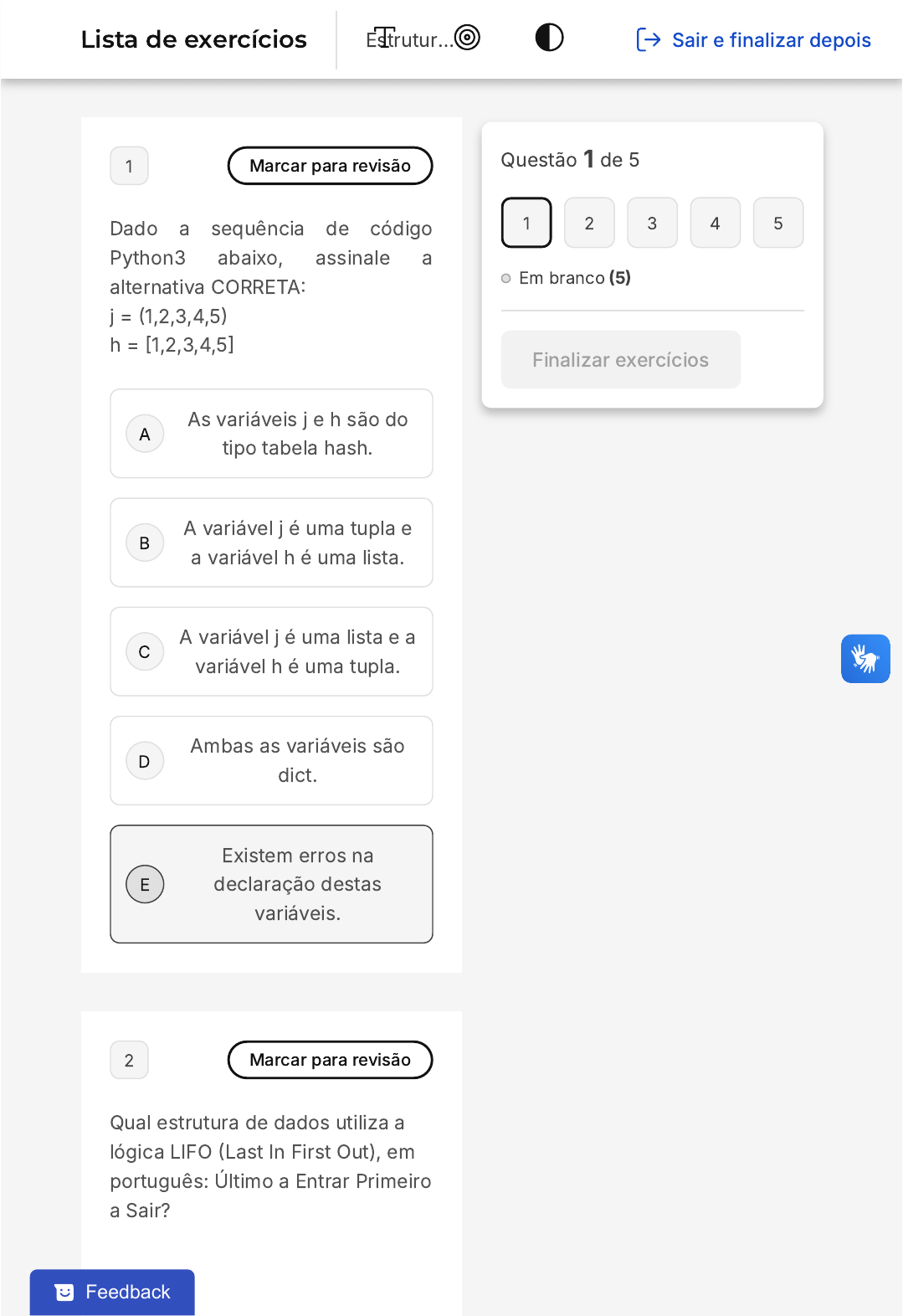 A B C D E 1 Marcar para revisão Dado a sequência de código Python3 abaixo, assinale a alternativa CORRETA� j = �1,2,3,4,5� h = �1,2,3,4,5� As variáveis j e h são do tipo tabela hash. A variável j é uma tupla e a variável h é uma lista. A variável j é uma lista e a variável h é uma tupla. Ambas as variáveis são dict. Existem erros na declaração destas variáveis. 2 Marcar para revisão Qual estrutura de dados utiliza a lógica LIFO �Last In First Out), em português: Último a Entrar Primeiro a Sair? Questão 1 de 5 Em branco �5� 1 2 3 4 5 Finalizar exercícios Lista de exercícios Estrutur… Sair e finalizar depois Feedback A B C D E A B C D E Fila Pilha Vetor Lista Encadeada Matriz 3 Marcar para revisão Quais estruturas de dados a seguir são estáticas e lineares: Listas e Tuplas Matrizes e Tuplas Conjuntos e Matrizes Listas e Filas Vetores e Filas 4 Marcar para revisão Considere o código a seguir: A B C D E >>> lista = [x+5 for x in �0,1,2,3,4,5] if x >> conjunto_a = set([1, 1, 2, 3�� >>> conjunto_b = set([2, 2, 3, 4�� >>> conjunto_c = conjunto_a.union(conjunto_b) >>> print(sum(conjunto_c)) Qual o resultado impresso por esse programa: A B C D E 4 8 10 18 20
