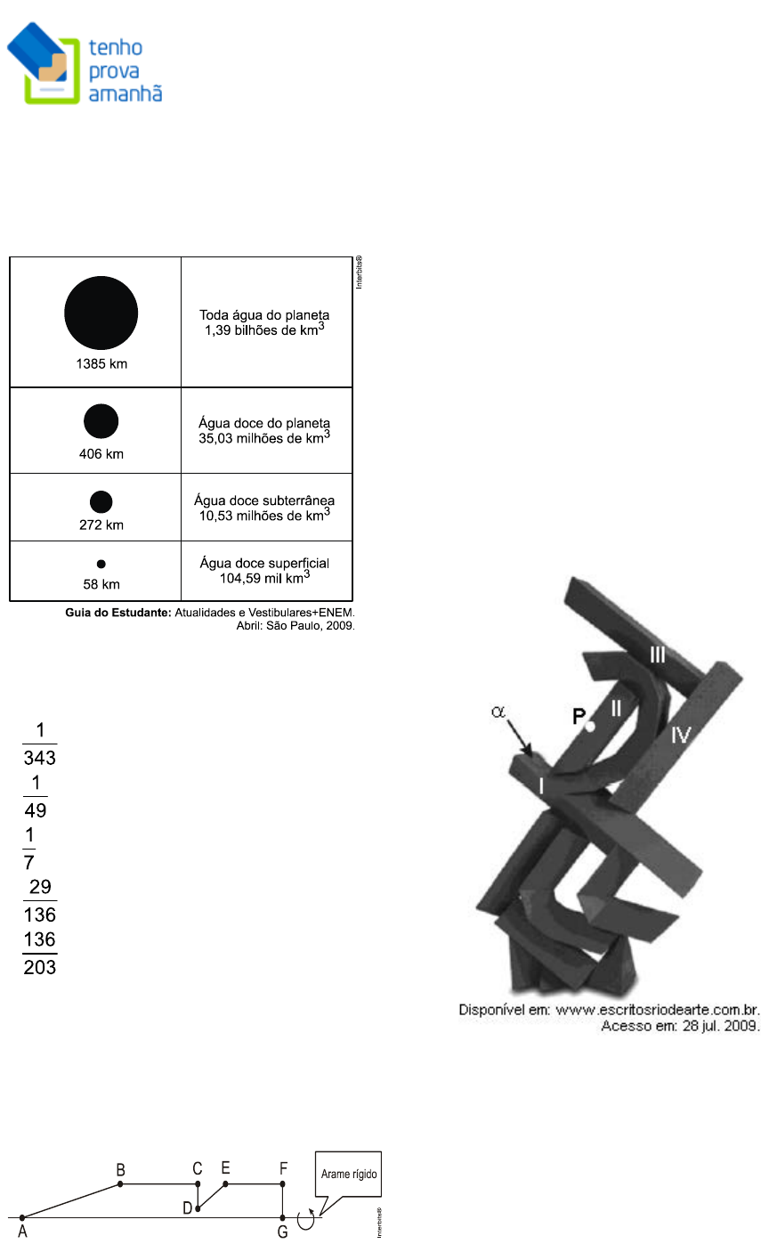 Provas ENEM Matemática www.tenhoprovaamanha.com.br www.tenhoprovaamanha.com.br 58 29. (Enem 2ª aplicação 2010) Se pudéssemos reunir em esferas toda a água do planeta, os diâmetros delas seriam: A razão entre o volume da esfera que corresponde à água doce superficial e o volume da esfera que corresponde à água doce do planeta é a) b) c) d) e) 30. (Enem 2ª aplicação 2010) Numa feira de artesanato, uma pessoa constrói formas geométricas de aviões, bicicletas, carros e outros engenhos com arame inextensível. Em certo momento, ele construiu uma forma tendo como eixo de apoio outro arame retilíneo e rígido, cuja aparência é mostrada na Ao girar tal forma em torno do eixo, formou-se a imagem de um foguete, que pode ser pensado como composição, por justaposição, de diversos sólidos básicos de revolução. Sabendo que, a figura, os pontos B, C, E e F são colineares, AB = 4FG, BC = 3FG, EF = 2FG, e utilizando-se daquela forma de pensar o foguete, a decomposição deste, no sentido da ponta para a cauda, é formada pela seguinte sequência de sólidos: a) pirâmide, cilindro reto, cone reto, cilindro reto. b) cilindro reto, tronco de cone, cilindro reto, cone equilátero. c) cone reto, cilindro reto, tronco de cone e cilindro equilátero. d) cone equilátero, cilindro reto, pirâmide, cilindro. e) cone, cilindro equilátero, tronco de pirâmide, cilindro. 31. (Enem 2009) Suponha que, na escultura do artista Emanoel Araújo, mostrada na figura a seguir, todos os prismas numerados em algarismos romanos são retos, com bases triangulares, e que as faces laterais do poliedro II são perpendiculares à sua própria face superior, que, por sua vez, é um triângulo congruente ao triângulo base dos prismas. Além disso, considere que os prismas I e III são perpendiculares ao prisma IV e ao poliedro II. Imagine um plano paralelo à face á do prisma I, mas que passe pelo ponto P pertencente à aresta do poliedro II, indicado na figura. A interseção desse plano imaginário com a escultura contém a) dois triângulos congruentes com lados correspondentes paralelos. b) dois retângulos congruentes e com lados correspondentes paralelos. c) dois trapézios congruentes com lados correspondentes perpendiculares. d) dois paralelogramos congruentes com lados correspondentes paralelos. e) dois quadriláteros congruentes com lados correspondentes perpendiculares. Provas ENEM Matemática www.tenhoprovaamanha.com.br www.tenhoprovaamanha.com.br 59 32. (Enem 2009) Uma empresa que fabrica esferas de aço, de 6 cm de raio, utiliza caixas de madeira, na forma de um cubo, para transportá-las. Sabendo que a capacidade da caixa é de 13.824 cm3, então o número máximo de esferas que podem ser transportadas em uma caixa é igual a a) 4. b) 8. c) 16. d) 24. e) 32. 33. (Enem cancelado 2009) Considere um caminhão que tenha uma carroceria na forma de um paralelepípedo retângulo, cujas dimensões internas são 5,1 m de comprimento, 2,1 m de largura e 2,1 m de altura. Suponha que esse caminhão foi contratado para transportar 240 caixas na forma de cubo com 1 m de aresta cada uma e que essas caixas podem ser empilhadas para o transporte. Qual é o número mínimo de viagens necessárias para realizar esse transporte? a) 10 viagens. b) 11 viagens. c) 12 viagens. d) 24 viagens. e) 27 viagens. 34. (Enem 2009) Um artesão construiu peças de artesanato interceptando uma pirâmide de base quadrada com um plano. Após fazer um estudo das diferentes peças que poderia obter, ele concluiu que uma delas poderia ter uma das faces pentagonal. Qual dos argumentos a seguir justifica a conclusão do artesão? a) Uma pirâmide de base quadrada tem 4 arestas laterais e a interseção de um plano com a pirâmide intercepta suas arestas laterais. Assim, esses pontos formam um polígono de 4 lados. b) Uma pirâmide de base quadrada tem 4 faces triangulares e, quando um plano intercepta essa pirâmide, divide cada face em um triângulo e um trapézio. Logo, um dos polígonos tem 4 lados. c) Uma pirâmide de base quadrada tem 5 faces e a interseção de uma face com um plano é um segmento de reta. Assim, se o plano interceptar todas as faces, o polígono obtido nessa interseção tem 5 lados. d) O número de lados de qualquer polígono obtido como interseção de uma pirâmide com um plano é igual ao número de faces da pirâmide. Como a pirâmide tem 5 faces, o polígono tem 5 lados. e) O número de lados de qualquer polígono obtido interceptando-se uma pirâmide por um plano é igual ao número de arestas laterais da pirâmide. Como a pirâmide tem 4 arestas laterais, o polígono tem 4 lados. 35. (Enem 2009) Uma fábrica produz velas de parafina em forma de pirâmide quadrangular regular com 19 cm de altura e 6 cm de aresta da base. Essas velas são formadas por 4 blocos de mesma altura — 3 troncos de pirâmide de bases paralelas e 1 pirâmide na parte superior —, espaçados de 1 cm entre eles, sendo que a base superior de cada bloco é igual à base inferior do bloco sobreposto, com uma haste de ferro passando pelo centro de cada bloco, unindo-os, conforme a figura. Se o dono da fábrica resolver diversificar o modelo, retirando a pirâmide da parte superior, que tem 1,5 cm de aresta na base, mas mantendo o mesmo molde, quanto ele passará a gastar com parafina para fabricar uma vela? a) 156 cm3. b) 189 cm3. c) 192 cm3. d) 216 cm3. e) 540 cm3. 36. (Enem cancelado 2009) Em uma praça pública, há uma fonte que é formada por dois cilindros, um de raio r e altura h1, e o outro de raio R e altura h2. O cilindro do meio enche e, após transbordar, começa a encher o outro. Se R = r e h2 = e, para encher o cilindro do meio, foram necessários 30 minutos, então, para se conseguir encher essa fonte e o segundo cilindro, de modo que fique completamente cheio, serão necessários a) 20 minutos. Provas ENEM Matemática www.tenhoprovaamanha.com.br www.tenhoprovaamanha.com.br 60 b) 30 minutos. c) 40 minutos. d) 50