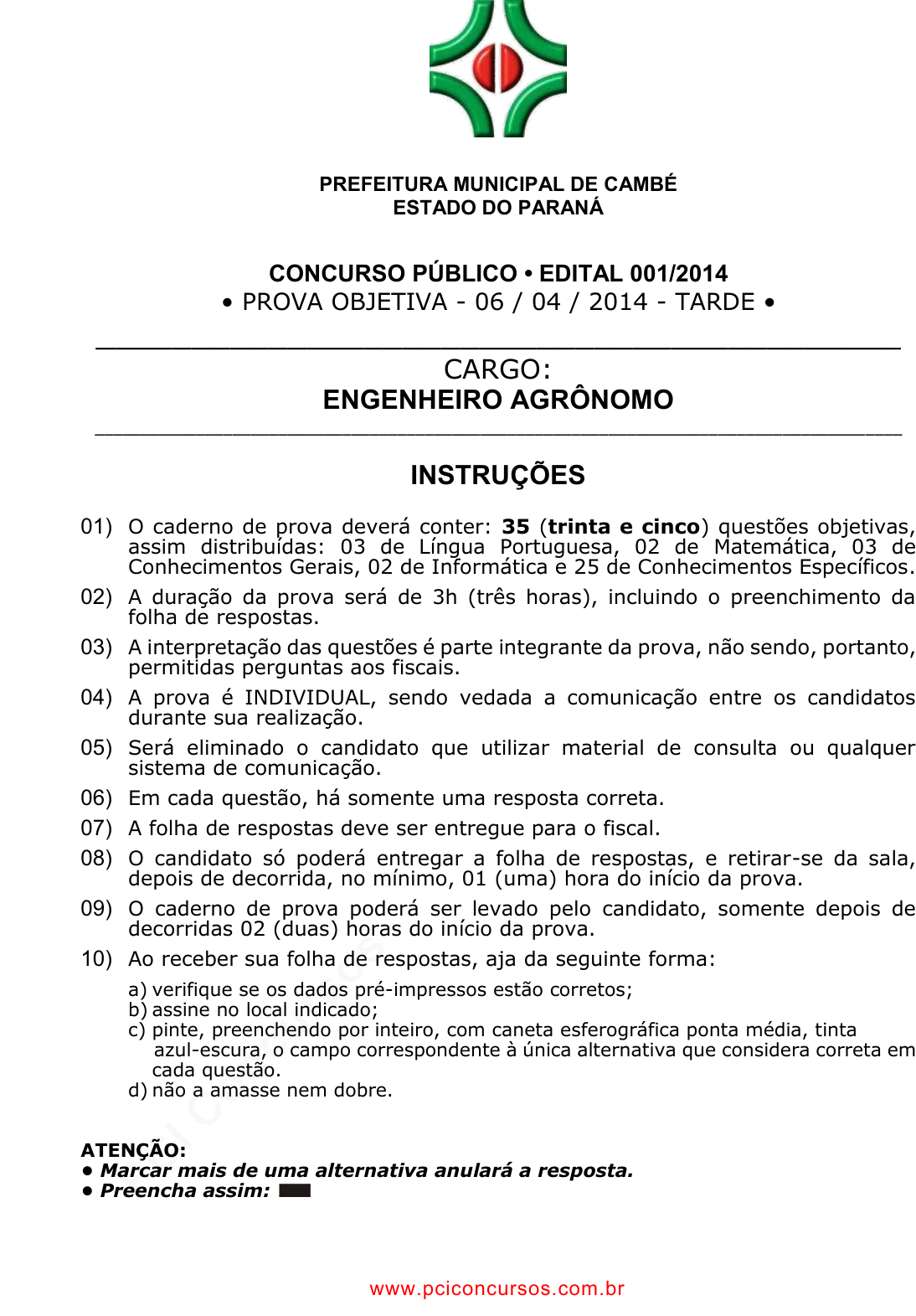 pcimarkpci MDAwMDowMDAwOjAwMDA6MDAwMDowMDAwOmZmZmY6YmFmOTpiNDVi:VGh1LCAyMyBKYW4gMjAyNSAxNjoxNTo0NyAtMDMwMA== www.pciconcursos.com.br PREFEITURA MUNICIPAL DE CAMBÉ ESTADO DO PARANÁ CONCURSO PÚBLICO • EDITAL 001/2014 • PROVA OBJETIVA - 06 / 04 / 2014 - TARDE • __________________________________________ CARGO: ENGENHEIRO AGRÔNOMO ________________________________________________________________________________________ INSTRUÇÕES 01) O caderno de prova deverá conter: 35 (trinta e cinco) questões objetivas, assim distribuídas: 03 de Língua Portuguesa, 02 de Matemática, 03 de Conhecimentos Gerais, 02 de Informática e 25 de Conhecimentos Específicos. 02) A duração da prova será de 3h (três horas), incluindo o preenchimento da folha de respostas. 03) A interpretação das questões é parte integrante da prova, não sendo, portanto, permitidas perguntas aos fiscais. 04) A prova é INDIVIDUAL, sendo vedada a comunicação entre os candidatos durante sua realização. 05) Será eliminado o candidato que utilizar material de consulta ou qualquer sistema de comunicação. 06) Em cada questão, há somente uma resposta correta. 07) A folha de respostas deve ser entregue para o fiscal. 08) O candidato só poderá entregar a folha de respostas, e retirar-se da sala, depois de decorrida, no mínimo, 01 (uma) hora do início da prova. 09) O caderno de prova poderá ser levado pelo candidato, somente depois de decorridas 02 (duas) horas do início da prova. 10) Ao receber sua folha de respostas, aja da seguinte forma: a) verifique se os dados pré-impressos estão corretos; b) assine no local indicado; c) pinte, preenchendo por inteiro, com caneta esferográfica ponta média, tinta azul-escura, o campo correspondente à única alternativa que considera correta em cada questão. d) não a amasse nem dobre. ATENÇÃO: • Marcar mais de uma alternativa anulará a resposta. • Preencha assim: www.pciconcursos.com.br pcimarkpci MDAwMDowMDAwOjAwMDA6MDAwMDowMDAwOmZmZmY6YmFmOTpiNDVi:VGh1LCAyMyBKYW4gMjAyNSAxNjoxNTo0NyAtMDMwMA== www.pciconcursos.com.br 02 –Prefeitura Municipal de Cambé–Concurso Público 001/2014 CONTINUA NA PÁGINA SEGUINTE. www.pciconcursos.com.br pcimarkpci MDAwMDowMDAwOjAwMDA6MDAwMDowMDAwOmZmZmY6YmFmOTpiNDVi:VGh1LCAyMyBKYW4gMjAyNSAxNjoxNTo0NyAtMDMwMA== www.pciconcursos.com.br Engenheiro Agrônomo – 03 LÍNGUA PORTUGUESA Texto para questões 01 a 02 João Lima Moraes, 42 anos, repete o programa quase todo dia, sem nunca se cansar. Num pequeno porto da cidade de Guaíra, oeste do Paraná, embarca em sua lancha e segue sem pressa pelas águas calmas do lago de Itaipu. João conhece o lago como poucos. O trânsito em seus passeios matinais se resume aos barcos de amigos, pescadores como ele, que identifica de longe, gritando pelo nome. Desvia com habilidade de bancos submersos de areia, sobe o lago até algumas ilhas desertas e, volta e meia, leva sua lancha a um trecho de águas bem mansas, onde galhos secos e retorcidos de árvores mortas ainda afloram à superfície. [...] A calmaria atual em nada lembra a paisagem que havia no mesmo lugar. [...] (Ronaldo Ribeiro, Terra) Questão 01) Analise o seguinte período misto “Desvia com habilidade de bancos submersos de areia, sobe o lago até algumas ilhas desertas e, volta e meia, leva sua lancha a um trecho de águas bem mansas, onde galhos secos e retorcidos de árvores mortas ainda afloram à superfície.”. I. A 1ª oração é subordinada. II. A 2ª oração é coordenada. III. A 3ª oração é coordenada em relação à 2ª oração e principal em relação à 4ª oração. IV. A 4ª oração é subordinada. Assinale a alternativa correta. A) Somente I está correta. B) Somente I e II estão corretas. C) Somente II e III estão corretas. D) Somente I, III e IV estão corretas. E) Somente II, III e IV estão corretas. Questão 02) Sob o ponto de vista da morfossintaxe, assinale a alternativa que contenha a classificação correta dos termos em destaque no trecho “e segue sem pressa pelas águas calmas do lago de Itaipu”. A) Substantivo e predicativo do sujeito. B) Adjetivo e predicativo do objeto. C) Substantivo e adjunto adnominal. D) Adjetivo e adjunto adnominal. E) Adjetivo e predicativo do sujeito. Questão 03) Considerando a norma padrão culto da Língua Portuguesa, analise as orações. I. Preferiu a dura realidade do que a ilusão de uma vida feliz. II. Há empresas que pagam comissões injustas aos funcionários. III. Três homens presidiram o júri. IV. Todo o povo brasileiro simpatizou com a ideia de plebiscito. V. Lembramos do endereço da agência de viagens. Assinale a alternativa correta. A) Somente I e II estão incorretas. B) Somente II e IV estão incorretas. C) Somente III está incorreta. D) Somente II, IV e V estão incorretas. E) Somente I, III e V estão incorretas. CONTINUA NA PÁGINA SEGUINTE. www.pciconcursos.com.br pcimarkpci MDAwMDowMDAwOjAwMDA6MDAwMDowMDAwOmZmZmY6YmFmOTpiNDVi:VGh1LCAyMyBKYW4gMjAyNSAxNjoxNTo0NyAtMDMwMA== www.pciconcursos.com.br Engenheiro Agrônomo – 04 MATEMÁTICA O enunciado abaixo se refere às questões 04 e 05. Considere uma caixa d’água com formato cilíndrico de base circular com raio igual a 72 cm e altura de 2 m. Questão 04) Quantos metros quadrados de área lateral tem a caixa d’água? A) 0,0288 B) 0,288 C) 2,88 D) 28,8 E) 288 Questão 05) O volume de água para encher completamente a caixa d’água, em litros, é de aproximadamente: (use =3) A) 3,1 B) 31 C) 310 D) 3.100 E) 31.000 CONHECIMENTOS GERAIS Questão 06) “As políticas econômicas devem atingir e beneficiar os mais necessitados da sociedade, bem como, promover igualdade social”. Dentre as funções das políticas econômicas, relacionadas abaixo, assinale aquela que resume ou define o trecho acima. A) Regulatória. B) Provedora. C) Estabilizadora. D) Redistributiva. E) Mantenedora. Questão 07) Leia atentamente as duas primeiras estrofes do Hino ao município de Cambé: Deus lembrou
