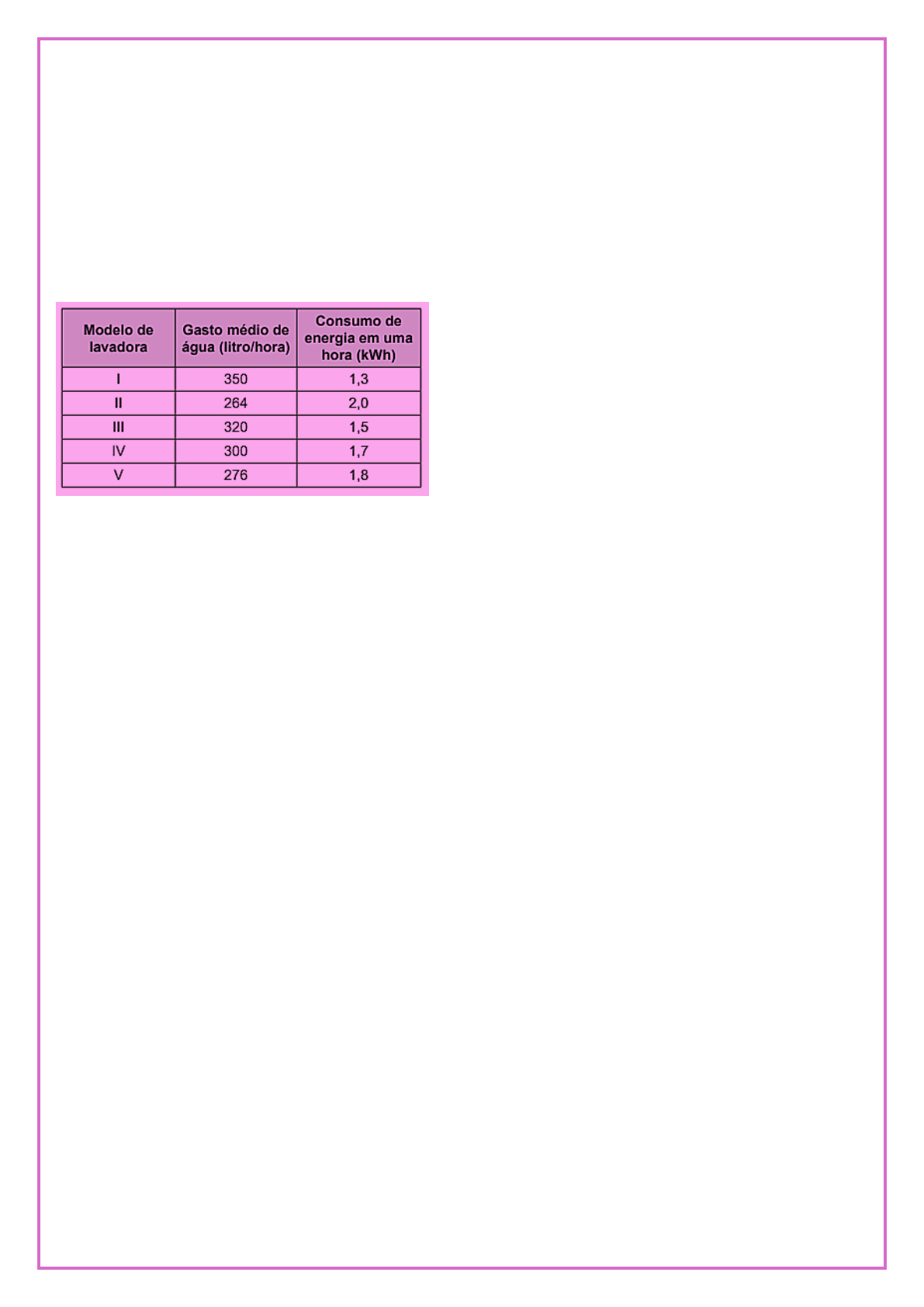 Página 1 de 7 SEGUNDA LISTA DE EXERCÍCIOS QUARTO BIMESTRE MATEMÁTICA PROFESSORA LUCIANA FERREIRA 01. Razão e proporção Querendo reduzir custos na limpeza da área de estacionamento de um prédio, o síndico resolveu comprar uma lavadora de alta pressão. Sabe-se que, na utilização desse equipamento, o consumo de água é menor, entretanto, existe o gasto com energia elétrica. O síndico coletou os dados de cinco modelos de lavadora com mesmo preço, e cujos consumos de água e de energia são os fornecidos no quadro. As tarifas de água e de energia elétrica são, respectivamente, R$ 0,0025 por litro de água e R$ 0,30 por quilowatt-hora. O modelo de lavadora que o síndico deve adquirir para gastar menos com a limpeza do estacionamento é A) I. B) II. C) III. D) IV. E) V. 02. Sistema de equações Para aumentar a arrecadação de seu restaurante que cobra por quilograma, o proprietário contratou um cantor e passou a cobrar dos clientes um valor fixo de couvert artístico, além do valor da comida. Depois, analisando as planilhas do restaurante, verificou-se em um dia que 30 clientes consumiram um total de 10 kg de comida em um período de 1 hora, sendo que dois desses clientes pagaram R$ 50,00 e R$ 34,00 e consumiram 500 g e 300 g, respectivamente. Qual foi a arrecadação obtida pelo restaurante nesse período de 1 hora, em real? A) 800,00. B) 810,00. C) 820,00. D) 1 100,00. E) 2 700,00 03. Razão e Proporção Um fazendeiro precisava de 1 L de certo produto fabricado por três indústrias distintas. • A indústria I comercializa o produto em embalagens de 250 mL por R$ 23,00 cada. • A indústria II comercializa o produto em embalagens de 8 fl oz (onça fluida) por R$ 18,50 cada. • A indústria III comercializa o produto em embalagens de 1 L por R$ 93,00 cada. O fazendeiro conseguiu adquirir a quantidade necessária do produto de que precisava, de uma única indústria, gastando o menor valor possível nessa compra. Considere que 1 L seja equivalente a 33,81 fl oz. Nessas condições, a quantidade de embalagens e a respectiva indústria onde a compra foi realizada foram A) quatro da indústria I. B) cinco da indústria I. C) quatro da indústria II. D) cinco da indústria II. E) uma da indústria III. 04. Lógica Uma pessoa chega ao hotel no qual fez uma pré- reserva com diária no valor de R$ 210,00. Como a confirmação da reserva não foi feita, quando chegou ao hotel não havia quarto disponível. Dessa forma, o recepcionista apresentou-lhe algumas opções de hotéis com diárias mais baratas, mas localizados a certa distância desse hotel, conforme apresentado. • H1: diária de R$ 180,00 e distância de 7 km; • H2: diária de R$ 200,00 e distância de 1,6 km; • H3: diária de R$ 199,00 e distância de 4,5 km; • H4: diária de R$ 190,00 e distância de 1,5 km; • H5: diária de R$ 205,00 e distância de 1,2 km. Para se locomover até um outro hotel, essa pessoa utiliza um táxi que cobra R$ 2,50 por quilômetro rodado mais taxa fixa de R$ 6,00. Sua escolha será em função do menor custo, composto pelo valor da diária mais a locomoção de táxi. O hotel escolhido foi o A) H1. B) H2. C) H3. D) H4. E) H5. 05. Probabilidade Em uma campanha promocional de uma loja, um cliente gira uma roleta, conforme a apresentada no esquema, almejando obter um desconto sobre o valor total de sua compra. O resultado é o que está marcado na região apontada pela seta, sendo que todas as regiões são congruentes. Além disso, um Página 2 de 7 dispositivo impede que a seta venha a apontar exatamente para a linha de fronteira entre duas regiões adjacentes. Um cliente realiza uma compra e gira a roleta, torcendo para obter o desconto máximo. A probabilidade, em porcentagem, de esse cliente ganhar o desconto máximo com um único giro da roleta é melhor aproximada por A) 8,3. B) 10,0. C) 12,5. D) 16,6. E) 50,0 06. Geometria Espacial No desenho técnico, é comum representar um sólido por meio de três vistas (frontal, perfil e superior), resultado da projeção do sólido em três planos, perpendiculares dois a dois. A figura representa as vistas de uma torre. Com base nas vistas fornecidas, qual figura melhor representa essa torre? 07. Escala Um estudante, morador da cidade de Contagem, ouviu dizer que nessa cidade existem ruas que formam um hexágono regular. Ao pesquisar em um sítio de mapas, verificou que o fato é verídico, como mostra a figura. Ele observou que o mapa apresentado na tela do computador estava na escala 1 : 20 000. Nesse instante, mediu o comprimento de um dos segmentos que formam os lados desse hexágono, encontrando 5 cm. Se esse estudante resolver dar uma volta completa pelas ruas que formam esse hexágono, ele percorrerá, em quilômetro, A) 1. B) 4. C) 6. D) 20. E) 24. 08. Interpretação de gráficos Página 3 de 7 A taxa de mortalidade infantil vem decaindo a cada ano no Brasil. O gráfico, gerado a partir de dados do IBGE, apresenta a evolução da taxa de mortalidade infantil (número de óbitos para cada 1 000 nascidos vivos) de crianças com até 5 anos, no Brasil, no período de 2000 a 2011. Considere que, para os próximos anos, o decréscimo anual médio do número de óbitos para cada 1 000 nascidos vivos registrado, no período de 2009 a 2011, será mantido. A partir das informações fornecidas, a taxa de mortalidade infantil de crianças com até 5 anos tornar-se-á inferior a 10 no período de A) 2011 a 2012. B) 2012 a 2013. C) 2013 a 2014. D) 2015 a 2016. E) 2017 a 2018. 09. Razão e Proporção Um motorista fez uma viagem de 100 km partindo da cidade A até a cidade B. Nos primeiros 30 km, a velocidade média na qual esse motorista viajou foi de 90 km/h. No segundo trecho, de 40 km, a velocidade média foi de 80 km/h. Suponha que a viagem foi realizada em 1 h 30 min. A velocidade média do motorista, em quilômetro por hora, no último trecho da viagem foi de A) 45. B) 67. C) 77. D) 85. E) 113. 10. Função Exponencial Um lab