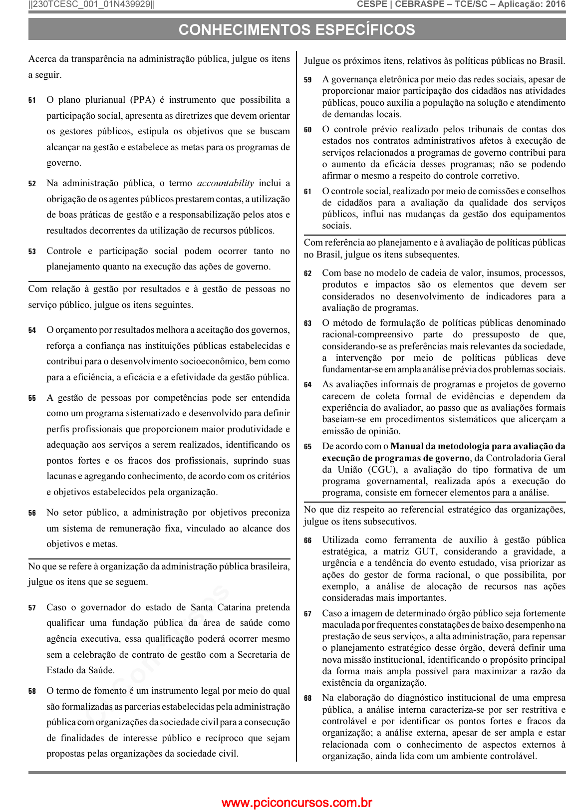 pcimarkpci MDAwMDowMDAwOjAwMDA6MDAwMDowMDAwOmZmZmY6YjViZjozZTlj:RnJpLCAyNCBKYW4gMjAyNSAwMDoyMjowMSAtMDMwMA== www.pciconcursos.com.br ||230TCESC_001_01N439929|| CESPE | CEBRASPE – TCE/SC – Aplicação: 2016 CONHECIMENTOS ESPECÍFICOS Acerca da transparência na administração pública, julgue os itens a seguir. 51 O plano plurianual (PPA) é instrumento que possibilita a participação social, apresenta as diretrizes que devem orientar os gestores públicos, estipula os objetivos que se buscam alcançar na gestão e estabelece as metas para os programas de governo. 52 Na administração pública, o termo accountability inclui a obrigação de os agentes públicos prestarem contas, a utilização de boas práticas de gestão e a responsabilização pelos atos e resultados decorrentes da utilização de recursos públicos. 53 Controle e participação social podem ocorrer tanto no planejamento quanto na execução das ações de governo. Com relação à gestão por resultados e à gestão de pessoas no serviço público, julgue os itens seguintes. 54 O orçamento por resultados melhora a aceitação dos governos, reforça a confiança nas instituições públicas estabelecidas e contribui para o desenvolvimento socioeconômico, bem como para a eficiência, a eficácia e a efetividade da gestão pública. 55 A gestão de pessoas por competências pode ser entendida como um programa sistematizado e desenvolvido para definir perfis profissionais que proporcionem maior produtividade e adequação aos serviços a serem realizados, identificando os pontos fortes e os fracos dos profissionais, suprindo suas lacunas e agregando conhecimento, de acordo com os critérios e objetivos estabelecidos pela organização. 56 No setor público, a administração por objetivos preconiza um sistema de remuneração fixa, vinculado ao alcance dos objetivos e metas. No que se refere à organização da administração pública brasileira, julgue os itens que se seguem. 57 Caso o governador do estado de Santa Catarina pretenda qualificar uma fundação pública da área de saúde como agência executiva, essa qualificação poderá ocorrer mesmo sem a celebração de contrato de gestão com a Secretaria de Estado da Saúde. 58 O termo de fomento é um instrumento legal por meio do qual são formalizadas as parcerias estabelecidas pela administração pública com organizações da sociedade civil para a consecução de finalidades de interesse público e recíproco que sejam propostas pelas organizações da sociedade civil. Julgue os próximos itens, relativos às políticas públicas no Brasil. 59 A governança eletrônica por meio das redes sociais, apesar de proporcionar maior participação dos cidadãos nas atividades públicas, pouco auxilia a população na solução e atendimento de demandas locais. 60 O controle prévio realizado pelos tribunais de contas dos estados nos contratos administrativos afetos à execução de serviços relacionados a programas de governo contribui para o aumento da eficácia desses programas; não se podendo afirmar o mesmo a respeito do controle corretivo. 61 O controle social, realizado por meio de comissões e conselhos de cidadãos para a avaliação da qualidade dos serviços públicos, influi nas mudanças da gestão dos equipamentos sociais. Com referência ao planejamento e à avaliação de políticas públicas no Brasil, julgue os itens subsequentes. 62 Com base no modelo de cadeia de valor, insumos, processos, produtos e impactos são os elementos que devem ser considerados no desenvolvimento de indicadores para a avaliação de programas. 63 O método de formulação de políticas públicas denominado racional-compreensivo parte do pressuposto de que, considerando-se as preferências mais relevantes da sociedade, a intervenção por meio de políticas públicas deve fundamentar-se em ampla análise prévia dos problemas sociais. 64 As avaliações informais de programas e projetos de governo carecem de coleta formal de evidências e dependem da experiência do avaliador, ao passo que as avaliações formais baseiam-se em procedimentos sistemáticos que alicerçam a emissão de opinião. 65 De acordo com o Manual da metodologia para avaliação da execução de programas de governo, da Controladoria Geral da União (CGU), a avaliação do tipo formativa de um programa governamental, realizada após a execução do programa, consiste em fornecer elementos para a análise. No que diz respeito ao referencial estratégico das organizações, julgue os itens subsecutivos. 66 Utilizada como ferramenta de auxílio à gestão pública estratégica, a matriz GUT, considerando a gravidade, a urgência e a tendência do evento estudado, visa priorizar as ações do gestor de forma racional, o que possibilita, por exemplo, a análise de alocação de recursos nas ações consideradas mais importantes. 67 Caso a imagem de determinado órgão público seja fortemente maculada por frequentes constatações de baixo desempenho na prestação de seus serviços, a alta administração, para repensar o planejamento estratégico desse órgão, deverá definir uma nova missão institucional, identificando o propósito principal da forma mais ampla possível para maximizar a razão da existência da organização. 68 Na elaboração do diagnóstico institucional de uma empresa pública, a análise interna caracteriza-se por ser restritiva e controlável e por identificar os pontos fortes e fracos da organização; a análise externa, apesar de ser ampla e estar relacionada com o conhecimento de aspectos externos à organização, ainda lida com um ambiente controlável. www.pciconcursos.com.br pcimarkpci MDAwMDowMDAwOjAwMDA6MDAwMDowMDAwOmZmZmY6YjViZjozZTlj:RnJpLCAyNCBKYW4gMjAyNSAwMDoyMjowMSAtMDMwMA== www.pciconcursos.com.br ||230TCESC_001_01N439929|| CESPE | CEBRASPE – TCE/SC – Aplicação: 2016 A respeito dos indicadores de desempenho na administração pública, julgue os i