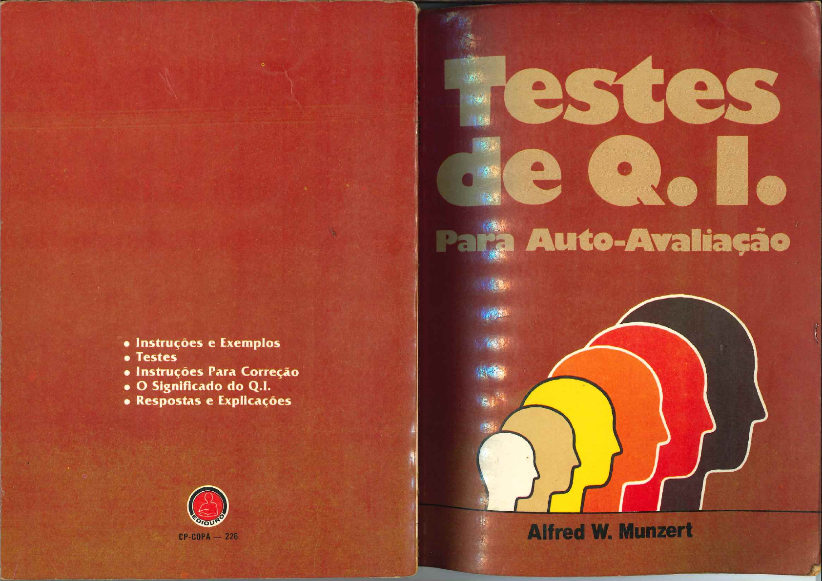 Para Auto-Avaliação Instruções e Exemplos Testes Instruções Para Correção O Significado do Q.I. Respostas e Explicações CP-COPA 226 Alfred W. MunzertInstruções e Exemplos Importante! Leia Estas Instruções Primeiro Este teste foi elaborado criteriosamente para medir o nível de inteligência de adultos e crianças de nove anos ou mais. Se você obedecer às instruções a seguir, o teste fornecerá uma avaliação bastante precisa do seu Q.I. A. Instruções (1) Você tem 45 minutos para responder às 60 questões. Não ultrapasse este limite de tempo. (2) Responda a todas as questões. Se você não souber a resposta, arrisque. A possibilidade de palpites foi considerada na avaliação. Não deixe nenhuma questão sem resposta. (3) Se lhe parecer que uma questão tem mais de uma resposta certa, ou nenhuma resposta certa, escolha a que parecer a melhor alternativa. Estas questões foram colocadas exatamente para testar a sua capacidade de pensar.e raciocinar. (4) Se uma criança estiver realizando o teste, seu pai (ou sua mãe) deverá tomar todas as precauções para que ela compreenda as instruções e os exemplos antes de começar. Se a criança tiver dificuldade de leitura, o pai (ou mãe) poderá ler as questões para ela, porém sob hipótese alguma deverá orientá-la nas respostas. Se a criança receber qualquer orientação, os resultados não refletirão seu verdadeiro Q.I. 7B. Exemplos III. Em algumas questões você terá números, ou letras, dispostos Estude atentamente os exemplos a seguir antes de iniciar o teste. numa certa ordem, de acordo com um padrão definido de Em algumas questões, você será solicitado a fazer comparações. Entretanto, um deles fugirá ao padrão. Você terá que escolher exatamente que foge ao padrão dos outros. Exemplo: Qual dos cinco representa a melhor comparação? Exemplo: Qual dos números não pertence à série? Barco está para água assim como avião está para: 1 - 3 - SOL - TERRA - ÁGUA - CÉU ÁRVORE A resposta é 10. A série se compõe de números impares A resposta é céu. Os barcos viajam sobre a água. Ele pode ser dispostos em 10 é um número par e portanto não se comparado a um avião que viaja no céu. encaixa na série. Você também será solicitado a comparar desenhos e formas IV. Você terá, também, que resolver alguns problemas. Nenhum geométricas. deles exige grandes conhecimentos matemáticos. Pelo contrário; a sua finalidade é apenas testar raciocínio lógico, ou seja, como você pensa. Exemplo: Qual dos cinco representa a melhor comparação? está para assim como está para: Agora você já pode começar teste. Leia todas as questões com (A) (C) (D) (E) atenção e escreva sua resposta no espaço existente abaixo de cada A resposta é C. Um círculo dividido em duas partes pode ser uma delas Você tem 45 minutos para completá-lo. comparado a um quadrado dividida em duas partes. II. Em algumas questões, você terá um grupo de cinco coisas diferentes. Quatro delas terão alguma coisa em comum. Você terá que escolher a única que não é semelhante às outras quatro Exemplo: Qual dos cinco se parece menos com os outros quatro? CACHORRO - CARRO - GATO - PEIXE A resposta é carro. Todos os outros são seres vivos. Carro não é um ser vivo. Estas questões também podem incluir desenhos. Exemplo: Qual dos cinco se parece menos com os outros quatro? (A) (B) + (C) (D) (E) X A resposta é D. Todos os outros se compõem de linhas retas. círculo é uma linha curva. 8 9TestesQual dos cinco se parece menos com os outros qua- tro? URSO COBRA VACA CACHORRO TIGRE RESPOSTA 132 3 Se você reordenar as letras "ECHOOL" o resultado Qual dos cinco desenhos representa a melhor compa- será nome de um: ração? OCEANO está assim está para como para: PAÍS CIDADE (A) (B) (C) ESTADO (D) (E) ANIMAL RESPOSTA RESPOSTA 14 1551 Qual dos cinco se parece menos com os outros? Qual dos cinco desenhos representa a melhor compa- ração? BATATA está assim está para como para: MILHO CENOURA (A) (B) (C) FEIJÃO 1 MAÇÃ (D) (E) RESPOSTA RESPOSTA 16 176 71 João, que doze anos, é três vezes mais velho que Qual dos cinco representa a melhor comparação? o irmão. Qual será a idade de João quando ele for Irmão está para assim como sobrinha está para: duas vezes mais velho que irmão? 15 MÃE 16 TIO 18 FILHA 20 TIA 21 SOBRINHO RESPOSTA RESPOSTA 18 19al das cinco letras se parece menos com as OU- Qual dos cinco representa a melhor comparação? ? Leite está para vidro assim como carta está para: SELO A Z CANETA LIVRO F N E CORREIO ENVELOPE POSTA RESPOSTA 2110 11 ual dos cinco desenhos se parece menos com os OU- Qual das cinco alternativas representa a melhor quatro? comparação? AMOR está para ROMA assim como 5232 está para: (A) 2523 (A) (B) A (C) (B) 3252 (C) 2325 (D) A (E) (D) 3225 (E) 5223 RESPOSTA RESPOSTA 2 2312 13 Se alguns Smaugs são Thors e alguns Thors são Qual dos cinco desenhos se parece menos com os ou Thrains, então alguns Smaugs serão obrigatoriamente tros quatro? Thrains. Esta afirmativa é: FALSA (A) (B) (C) VERDADEIRA (D) (E) NENHUMA DAS DUAS RESPOSTA RESPOSTA 24 214 15 Qual dos cinco representa a melhor comparação? Qual dos números não pertence à série? Árvore está para chão assim como chaminé está para: FUMAÇA TIJOLO 9-7-8-6 - CÉU 7 3 GARAGEM CASA RESPOSTA RESPOSTA 26 2716 Qual dos cinco se parece menos com os outros qua- Qual dos cinco desenhos representa a melhor compa- tro? ração? TATO está assim está para como para: PALADAR AUDIÇÃO (A) (B) (C) - SORRISO VISÃO (D) (E) V RESPOSTA RESPOSTA 28 2918 19 João é mais alto que Pedro, e Antônio é mais baixo Qual dos cinco se parece menos com os outros qua- que João. tro? Qual das afirmativas abaixo estaria mais certa? BOLSA (A) Antônio é mais alto que Pedro. MEIA (B) Antônio é mais baixo que Pedro. CALÇA (C) Antônio tem a mesma altura que Pedro. SAPATO (D) É impossível dizer quem é mais alto, se Antônio ou P