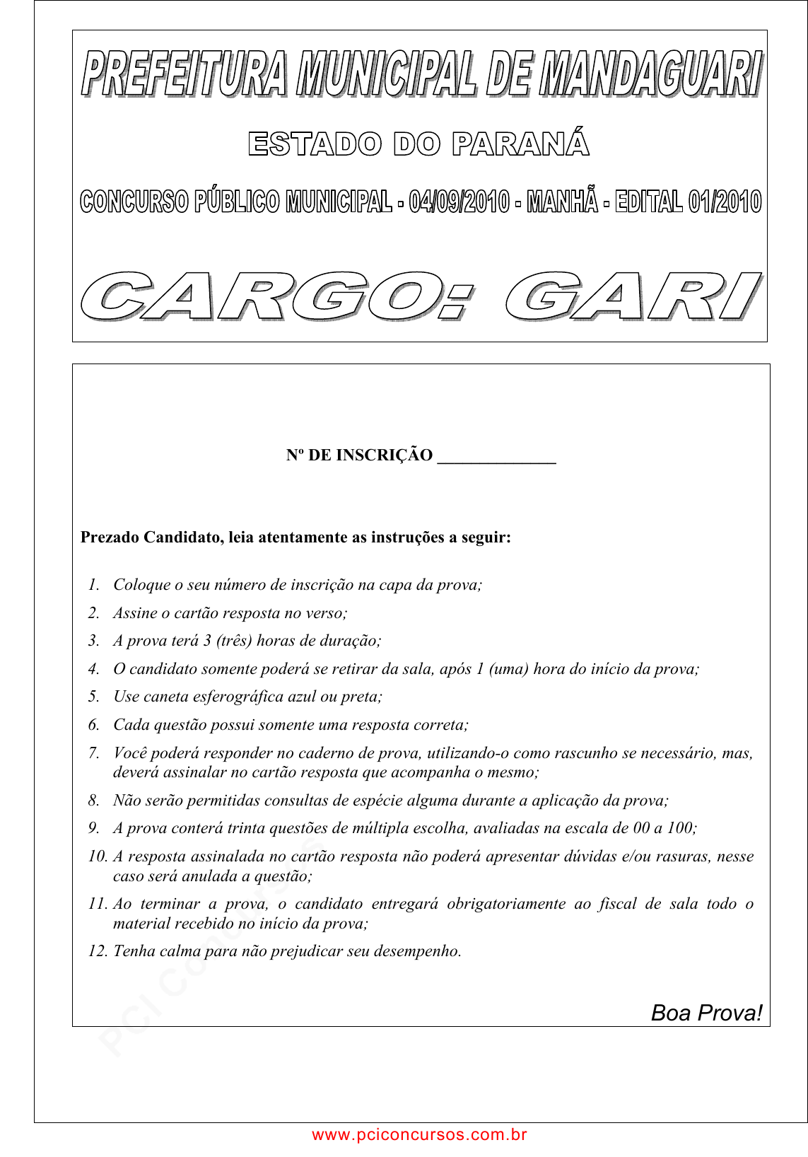 pcimarkpci MDAwMDowMDAwOjAwMDA6MDAwMDowMDAwOmZmZmY6YmFmOTpiNDVi:RnJpLCAyNCBKYW4gMjAyNSAwODoxNjo1OCAtMDMwMA== www.pciconcursos.com.br Nº DE INSCRIÇÃO ______________ Prezado Candidato, leia atentamente as instruções a seguir: 1. Coloque o seu número de inscrição na capa da prova; 2. Assine o cartão resposta no verso; 3. A prova terá 3 (três) horas de duração; 4. O candidato somente poderá se retirar da sala, após 1 (uma) hora do início da prova; 5. Use caneta esferográfica azul ou preta; 6. Cada questão possui somente uma resposta correta; 7. Você poderá responder no caderno de prova, utilizando-o como rascunho se necessário, mas, deverá assinalar no cartão resposta que acompanha o mesmo; 8. Não serão permitidas consultas de espécie alguma durante a aplicação da prova; 9. A prova conterá trinta questões de múltipla escolha, avaliadas na escala de 00 a 100; 10. A resposta assinalada no cartão resposta não poderá apresentar dúvidas e/ou rasuras, nesse caso será anulada a questão; 11. Ao terminar a prova, o candidato entregará obrigatoriamente ao fiscal de sala todo o material recebido no início da prova; 12. Tenha calma para não prejudicar seu desempenho. Boa Prova! www.pciconcursos.com.br pcimarkpci MDAwMDowMDAwOjAwMDA6MDAwMDowMDAwOmZmZmY6YmFmOTpiNDVi:RnJpLCAyNCBKYW4gMjAyNSAwODoxNjo1OCAtMDMwMA== www.pciconcursos.com.br 2 A PROFECIA WERNER ZOTZ Caraíbas têm a cabeça oca. Deviam ter aprendido muitas lições com o povo filho da terra e não souberam ____________, nem ouvir, nem sentir. E sofrerão por isso. Dia virá em que ficarão com sede, muita sede, e não terão água para beber: os rios e lagoas e valos e regatos e até a água da chuva estarão sujos e podres. E chorarão. E continuarão com sede porque a água do choro é salgada e amarga... O tempo da fome também virá. E a terra está seca, o chão duro. As sementes do milho e a mandioca não mais nascerão verdes, alimentando a esperança de quarups ao redor do fogo com muita comida e bebida. A caça e peixe também terão fugido ou morrido. E a fome apertará o estômago do caraíba, e ele não poderá comer nem sua _____________, nem sua terra nua e ____________. Os dias serão sempre mais quentes. E quando o caraíba procurar uma sombra como abrigo, descobrirá que a terra não tem mais árvores. As noites serão escuras e frias. Sem a luz, sem estrelas. E sem fogueiras quentes. E o caraíba, o homem-branco chorará. E quando acordar de sua imensa estupidez será tarde, muito tarde. Eu, Tamãi, o velho pajé, falei. (Apenas um curumim. Curitiba, Coo Editora, 1979. p. 9-10.) 01 - Assinale a alternativa que preenche corretamente as lacunas do texto: a) enchegar – riqueza – estériu. c) enxergar – riquesa – estéril. b) enxergar – riqueza – estéril. d) enchergar – riquesa – estério. 02 - Analise as afirmativas relacionadas ao texto e assinale a correta: a) A diferença do homem branco e do índio em relação à natureza é que o índio a preserva; o homem a destrói. b) Segundo o narrador a imensa estupidez do homem branco é ignorar que ele faz parte da natureza, destruindo-a. c) Os homens brancos acumulam riquezas à custa da destruição da natureza. d) Todas as alternativas estão corretas. 03 - “Pajé” se escreve com “j”. Também se escreve com “j” as palavras da alternativa: a) penu___em – sur___ir. c) can___ica – la___ota. b) ma___ia – re___enerar. d) refú___io – le___ível. 04 - Assinale a alternativa em que as palavras são acentuadas graficamente por obedecerem à mesma regra: a) estômago – árvore. c) água – chorará. b) caraíbas – árvore. d) pajé – caraíbas. 05 - Assinale a alternativa que justifica corretamente o emprego de reticências no 2º parágrafo do texto: a) Para marcar fala quebrada, própria de quem está nervoso ou inseguro. b) Para indicar que parte de um trecho citado foi omitida. c) Para assinalar inflexão de natureza emocional – tristeza. d) Para marcar uma interrupção provocada pela surpresa de quem fala. 06 - O plural de chão é chãos, assinale a alternativa em que o plural dos substantivos seguem a mesma forma: a) grão – alemão. c) alemão – cidadão. b) cão – pão. d) cristão – irmão. 07 - A fração que equivale a um numeral decimal não exato é: a) 66 80 b) 10 12 c) 28 32 d) Nenhuma das alternativas anteriores www.pciconcursos.com.br pcimarkpci MDAwMDowMDAwOjAwMDA6MDAwMDowMDAwOmZmZmY6YmFmOTpiNDVi:RnJpLCAyNCBKYW4gMjAyNSAwODoxNjo1OCAtMDMwMA== www.pciconcursos.com.br 3 08 - Adicionando 16 à área do quadrado ao lado obtemos o dobro de seu perímetro. Quanto medem os lados desse quadrado? a) 2 b) 4 c) 6 d) Nenhuma das alternativas anteriores 09 - Guardando R$ 360,00 por mês, uma senhora conseguiu juntar uma certa quantia em 20 meses. Para obter essa mesma quantia em 16 meses, quanto ela deveria ter guardado por mês? a) R$ 288,00 c) R$ 450,00 b) R$ 368,00 d) Nenhuma das alternativas anteriores 10 - Dos números 10 8 18 ; ; 18 3 36 e 27 15 , marque a alternativa correta: a) O maior é 8 3 c) O maior é 27 15 b) O menor é 18 36 d) Nenhuma das alternativas anteriores 11 - Depois de ser desativada, o que aconteceu com o prédio da Estação Ferroviária de Mandaguari? a) Ficou abandonada até virar ruínas. b) Foi demolida. c) Foi reformada e transformada na sede da prefeitura. d) Foi utilizada como rodoviária. 12 - Qual das legislações abaixo foi Sancionada pelo Presidente Luiz Inácio Lula da Silva em 20 de Julho deste ano? a) Estatuto da Criança e do Adolescente. c) Estatuto da Igualdade Racial. b) Estatuto do Idoso. d) Estatuto do Torcedor. 13 - Quantos vereadores compõem a Câmara Municipal de Mandaguari? a) 7. c) 11. b) 9. d) 13. 14 - Que dia será realizado o 1º (primeiro) turno das eleições 2.010? a) No 1º (primeiro) domingo de outubro. c) No 3º (terceiro) domingo de outubro. b) No 2º (segundo) domingo de outubro. d) No 4º (quarto) domingo de outubro. 15 - A defini