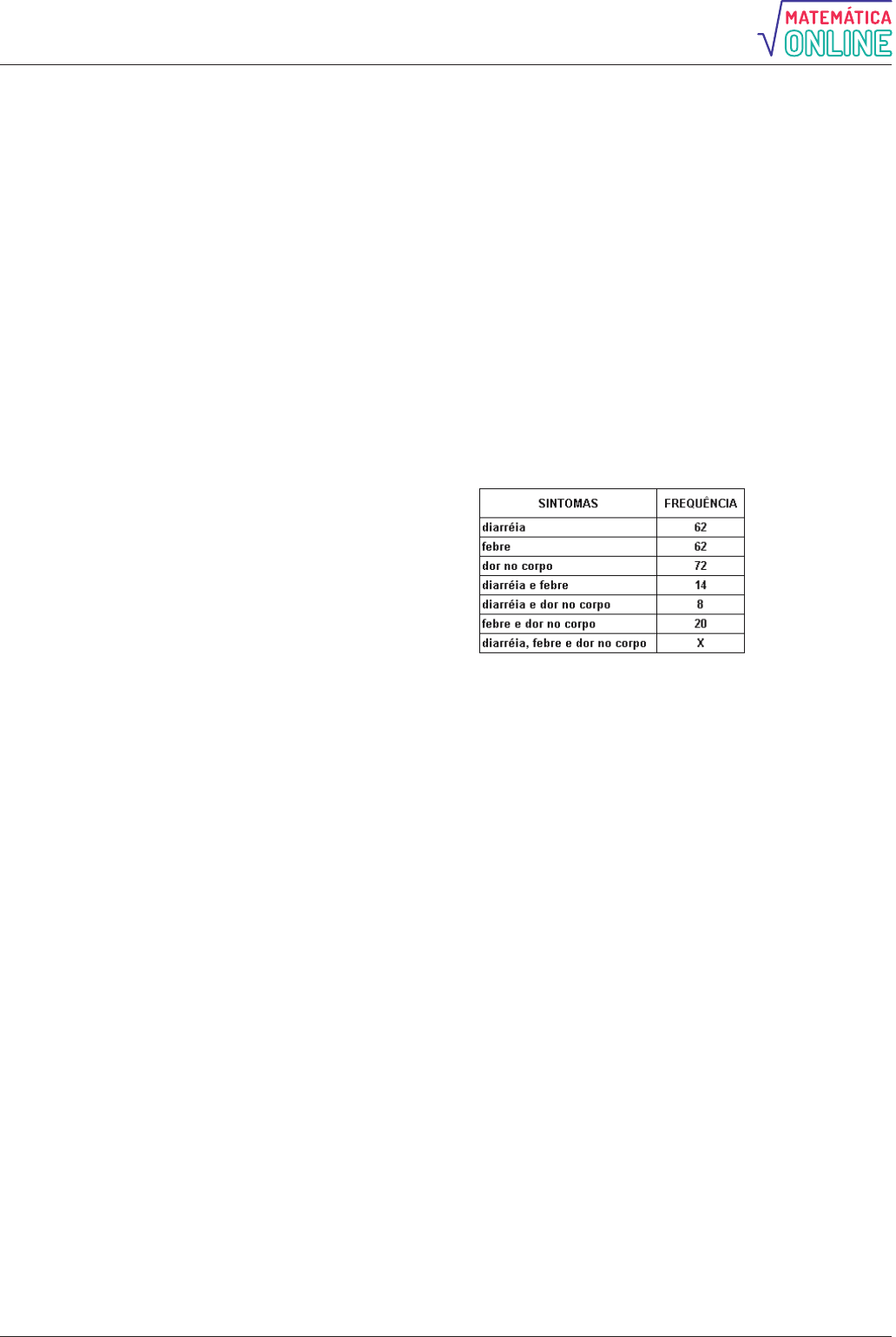 Alisson Marques - online 1 1. (Unesp 1990) Numa classe de 30 alunos, 16 alunos gostam de Matemática e 20 de História. O número de alunos desta classe que gostam de Matemática e de História é: a) exatamente 16 b) exatamente 10 c) no máximo 6 d) no mínimo 6 e) exatamente 18 2. (Pucmg 1997) Em uma empresa, 60% dos funcionários leem a revista A, 80% leem a revista B, e todo funcionário é leitor de pelo menos uma dessas revistas. O percentual de funcionários que leem as duas revistas é: a) 20 % b) 40 % c) 60 % d) 75 % e) 140 % 3. (Unirio 1997) Tendo sido feito o levantamento estatístico dos resultados do CENSO POPULACIONAL 96 em uma cidade, descobriu-se, sobre a população, que: I - 44% têm idade superior a 30 anos; II - 68% são homens; III - 37% são homens com mais de 30 anos; IV - 25% são homens solteiros; V - 4% são homens solteiros com mais de 30 anos; VI - 45% são indivíduos solteiros; VII - 6% são indivíduos solteiros com mais de 30 anos. Com base nos dados anteriores, pode-se afirmar que a porcentagem da população desta cidade que representa as mulheres casadas com idade igual ou inferior a 30 anos é de: a) 6% b) 7% c) 8% d) 9% e) 10% 4. (Unirio 1999) Numa pesquisa para se avaliar a leitura de três revistas "A", "B" e "C", descobriu-se que 81 pessoas leem, pelo menos, uma das revistas; 61 pessoas leem somente uma delas e 17 pessoas leem duas das três revistas. Assim sendo, o número de pessoas mais bem informadas dentre as 81 é: a) 3 b) 5 c) 12 d) 29 e) 37 5. (Mackenzie 1999) Num grupo constituído de K pessoas, das quais 14 jogam xadrez, 40 são homens. Se 20% dos homens jogam xadrez e 80% das mulheres não jogam xadrez, então o valor de K é: a) 62 b) 70 c) 78 d) 84 e) 90 6. (Ufrn 2001) Uma pesquisa de opinião, realizada num bairro de Natal, apresentou o resultado seguinte: 65% dos entrevistados frequentavam a praia de Ponta Negra, 55% frequentavam a praia do Meio e 15% não iam à praia. De acordo com essa pesquisa, o percentual dos entrevistados que frequentavam ambas as praias era de: a) 20% b) 35% c) 40% d) 25% 7. (Uerj 2002) Em um posto de saúde foram atendidas, em determinado dia, 160 pessoas com a mesma doença, apresentando, pelo menos, os sintomas diarreia, febre ou dor no corpo, isoladamente ou não. A partir dos dados registrados nas fichas de atendimento dessas pessoas, foi elaborada a tabela a seguir. Na tabela, X corresponde ao número de pessoas que apresentaram, ao mesmo tempo, os três sintomas. Pode-se concluir que X é igual a: a) 6 b) 8 c) 10 d) 12 8. (Ufmg 2003) Em uma pesquisa de opinião, foram obtidos estes dados: - 40% dos entrevistados leem o jornal A. - 55% dos entrevistados leem o jornal B. - 35% dos entrevistados leem o jornal C. - 12% dos entrevistados leem os jornais A e B. - 15% dos entrevistados leem os jornais A e C. - 19% dos entrevistados leem os jornais B e C. - 7% dos entrevistados leem os três jornais. - 135 pessoas entrevistadas não leem nenhum dos três jornais. Considerando-se esses dados, é CORRETO afirmar que o número total de entrevistados foi a) 1 200. b) 1 500. c) 1 250. d) 1 350. 03