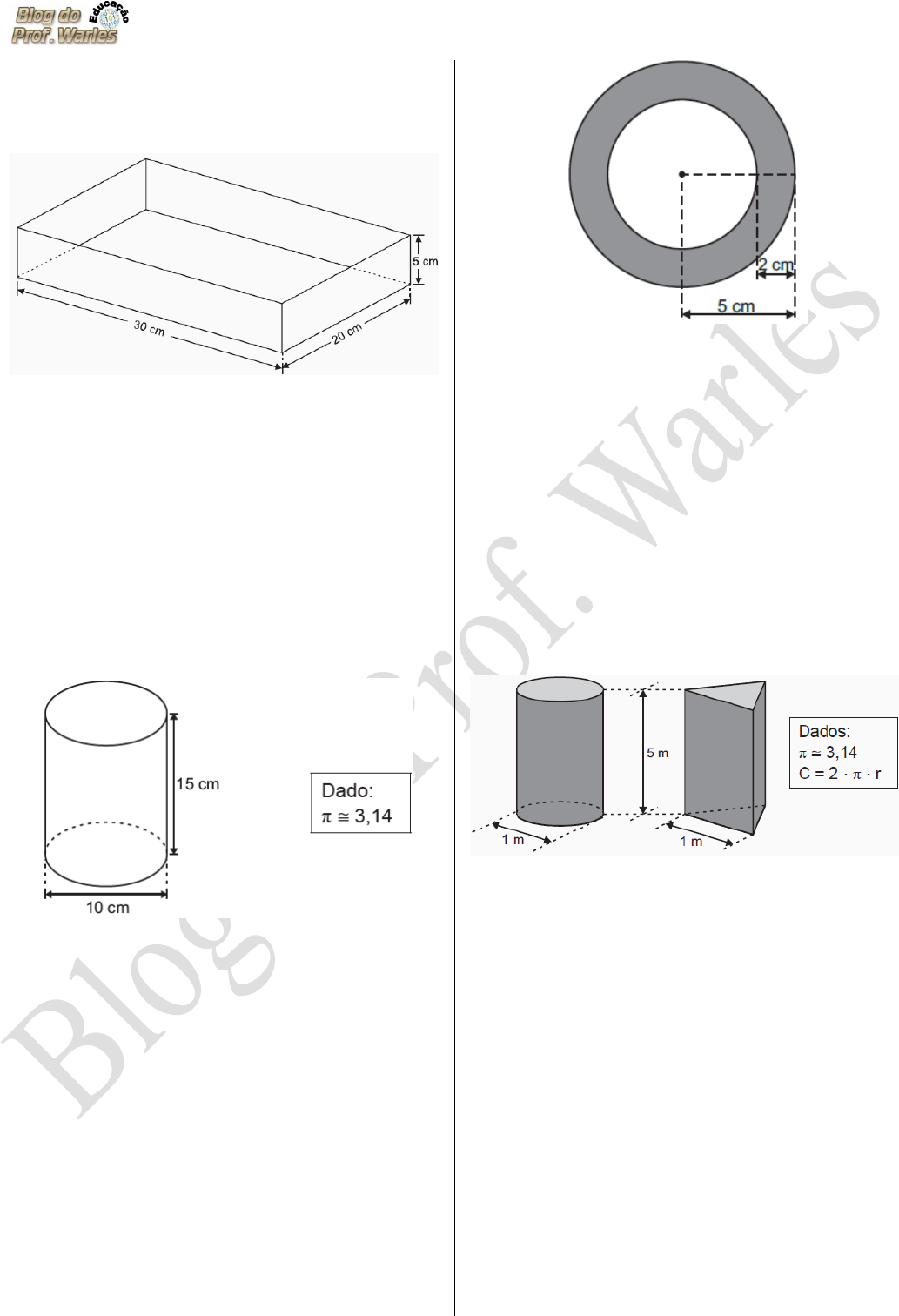 D13 – Resolver problema envolvendo a área total e/ou volume de um sólido (prisma, pirâmide, cilindro, cone, esfera). ------------------------------------------------------------------- (SAEPE). Amanda comprou uma forma de bolo com formato de bloco retangular , cujas medidas internas estão representadas na figura abaixo. A capacidade máxima, em cm³, dessa forma é A) 220. B) 500. C) 600. D) 1 100. E) 3 000. ------------------------------------------------------------------- (SAEPE). Um fabricante de sabão em pó decidiu remodelar a embalagem de seu produto, criando um novo padrão com o formato de um cilindro reto. A figura abaixo representa essa nova embalagem com as suas medidas internas indicadas. A quantidade máxima, aproximada, de sabão em pó, em cm³, que essa embalagem comporta é A) 235,5. B) 471,0. C) 1 177,5. D) 3 532,5. E) 4 710,0. ------------------------------------------------------------------- (SAEP). O desenho abaixo é formado por dois círculos concêntricos. Qual é a medida da área da parte colorida de cinza? A) 34 cm2 B) 25 cm2 C) 21 cm2 D) 16 cm2 E) 13 cm2 ------------------------------------------------------------------- (SAEP). Uma empresa de publicidade utiliza dois tipos de suportes rotatórios para veicular propaganda, um em forma de cilindro circular reto de diâmetro 1 m e o outro em forma de um prisma reto, cuja base é um triângulo equilátero de lado medindo 1 m. Os dois suportes têm 5 m de altura, conforme indicado no desenho abaixo. O preço cobrado por propaganda é de R$ 100,00 por m2 de área lateral externa do suporte utilizado. O valor a ser pago pela opção de suporte mais econômica para um anunciante é, aproximadamente, A) R$ 1 500,00 B) R$ 1 570,00 C) R$ 1 586,60 D) R$ 1 727,00 ------------------------------------------------------------------- (SPAECE). Fábio construiu, em sua fazenda, um silo para armazenar soja. A parede cilíndrica desse silo será revestida com uma camada de manta. A figura abaixo representa o silo construído por Fábio com suas dimensões indicadas. 1 D13 – Resolver problema envolvendo a área total e/ou volume de um sólido (prisma, pirâmide, cilindro, cone, esfera). A quantidade mínima de manta, em metros quadrados, que Fábio deverá comprar para revestir a parte cilíndrica desse silo é A) 1,6 π. B) 2,0 π. C) 3,2 π. D) 6,4 π. E) 8,4 π. ------------------------------------------------------------------- (SPAECE). Maria comprou uma orquídea, que veio plantada em um vaso cilíndrico, como representado no desenho abaixo. A medida da área total desse vaso cilíndrico é A) 133,04 cm². B) 376,80 cm². C) 866,64 cm². D) 1 507,20 cm². E) 2 260,80 cm². ------------------------------------------------------------------- (SEAPE). Observe abaixo o desenho de um reservatório no formato de um cilindro circular reto que contém água até a metade de sua altura total. Nesse desenho, as medidas indicadas correspondem às dimensões internas desse reservatório. Qual é o volume de água contido nesse reservatório? A) 1,5 π m³ B) 2,5 π m³ C) 3 π m³ D) 6 π m³ E) 12 π m³ ------------------------------------------------------------------- (PAEBES). Para o abastecimento de água tratada de uma pequena cidade, foi construído um reservatório com a forma de um paralelepípedo retângulo, conforme a representação abaixo. A capacidade máxima de água desse reservatório é de (A) 135 m³ (B) 180 m³ (C) 450 m³ (D) 550 m³ (E) 900 m³ ------------------------------------------------------------------- Um copo cilíndrico, com 4 cm de raio e 12 cm de altura, está com água até a altura de 8 cm. Foram então colocadas em seu interior n bolas de gude, e o nível da água atingiu a boca do copo, sem derramamento. Qual é o volume, em cm3, de todas as n bolas de gude juntas? (A) 32π (B) 48π (C) 64π (D) 80π (E) 96π 2 D13 – Resolver problema envolvendo a área total e/ou volume de um sólido (prisma, pirâmide, cilindro, cone, esfera). ------------------------------------------------------------------- (PROEB). Para desenvolver a visão espacial dos estudantes, o professor ofereceu-lhes uma planificação de uma pirâmide de base quadrada como a figura: A área da base dessa pirâmide é 100 cm² e a área de cada face é 80 cm². A área total, no caso da pirâmide considerada, é igual a: (A) 320 cm² (B) 340 cm² (C) 360 cm² (D) 400 cm² (E) 420 cm² ------------------------------------------------------------------- De um bloco cúbico de isopor de aresta 3a, recorta-se o sólido, em forma de H, mostrado na figura abaixo. O volume do sólido é: (A) 27a³. (B) 21a³. (C) 18a³. (D) 14a³. (E) 9a³. ------------------------------------------------------------------- Um empresário produz sólidos pedagógicos de plástico, como por exemplo, pirâmides. Ele quer embalá-las em caixas no formato de um cubo, sabendo que a pirâmide está inscrita, como mostra a figura abaixo. Sabendo-se que o volume da pirâmide é de 6 m³, então o volume do cubo, em m³, é igual a: (A) 9 (B) 12 (C) 15 (D) 18 (E) 21 ------------------------------------------------------------------- Um cubo mágico de volume 512 cm³ foi montado com 64 cubos iguais, conforme a figura a abaixo. A medida do lado de cada um dos cubos menores, em centímetros, é: (A) 2 (B) 3 (C) 4 (D) 5 (E) 6 ------------------------------------------------------------------- Uma embalagem de talco de forma cilíndrica possui 15 centímetros de altura e base com 3 centímetros de raio. Qual é o volume máximo, em cm³, de talco que essa embalagem comporta? A) 540 π B) 180 π C) 135 π D) 90 π E) 45 π ------------------------------------------------------------------- 3 D13 – Resolver problema envolvendo a área total e/ou volume de um sólido (prisma, pirâmide, cilindro, cone, esfera). (SPAECE). Na figura abaixo, o bloco retangular representa uma lata de tinta para paredes completamente cheia. Observe as dimensões dessa lata. O vol