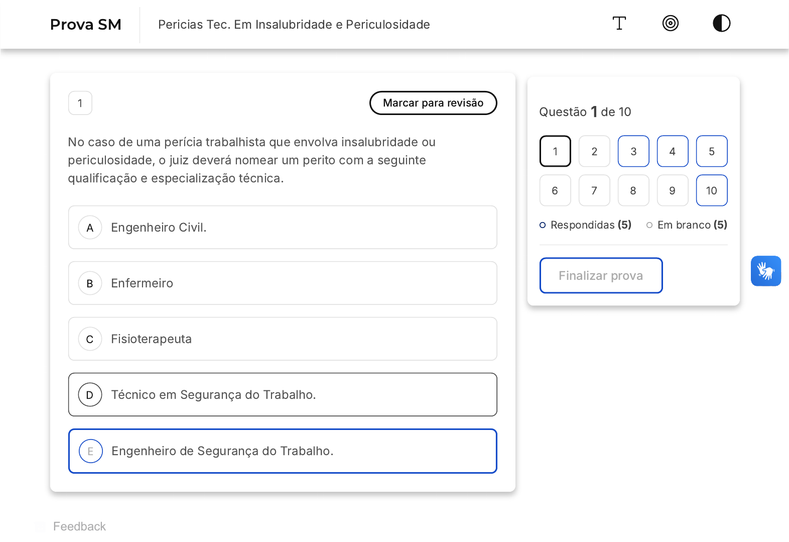 A B C D E 1 Marcar para revisão No caso de uma perícia trabalhista que envolva insalubridade ou periculosidade, o juiz deverá nomear um perito com a seguinte qualificação e especialização técnica. Engenheiro Civil. Enfermeiro Fisioterapeuta Técnico em Segurança do Trabalho. Engenheiro de Segurança do Trabalho. Questão 1 de 10 Respondidas �5� Em branco �5� Finalizar prova 1 2 3 4 5 6 7 8 9 10 Prova SM Pericias Tec. Em Insalubridade e Periculosidade Feedback A B C D E 2 Marcar para revisão Numa perícia trabalhista de periculosidade, o perito do juízo constatou que o Reclamante realmente atuava em subestações elétricas, ou seja, com atividades e operações que lhe garantem um adicional de periculosidade, conforme estabelece a Norma Regulamentadora NR 16. Qual será o percentual deste adicional e sua respectiva incidência? Adicional de 40% incidente sobre o salário base do Reclamante. Adicional de 30% incidente sobre o salário base do Reclamante. Adicional de 40% incidente sobre o salário mínimo nacional. Adicional de 20% incidente sobre o salário base do Reclamante. Adicional de 10% incidente sobre o salário mínimo nacional. 3 Marcar para revisão A B C D E Marque abaixo a opção em que o perito do juízo ficará impedido de ser nomeado em um determinado processo. Se o perito tiver especialização em medicina do trabalho. Se o perito não possuir mestrado na área em referência. Se o perito tiver qualquer vínculo com uma das partes envolvidas no processo. Se o perito for funcionário de empresa privada. Se o perito for professor universitário. 4 Marcar para revisão Um juiz poderá indeferir uma prova pericial quando: A B C D E O próprio juiz atuar como perito. O Reclamante apresentar as avaliações quantitativas realizadas pelo seu assistente técnico. O pedido versar sobre insalubridade. O pedido versar sobre periculosidade. O pedido versar sobre ergonomia ou outro tema que não seja insalubridade ou periculosidade. 5 Marcar para revisão Os assistentes técnicos não se sujeitam às restrições ou às sanções do CPC, tendo, ainda, prazo diverso para apresentação de seus pareceres. Estamos tratando dos seguintes Artigos do CPC, respectivamente: A B C D E Artigos 138; 433 e 426 do CPC. Artigos 138; 424 e 433 do CPC. Artigos 426; 434 e 433 do CPC. Artigos 126; 421 e 387 do CPC. Artigos 139; 440 e 521 do CPC. 6 Marcar para revisão Um perito judicial realizou a diligência sem comunicar as partes envolvidas no processo quanto à data e horário da mesma. É correto afirmar: A B C D E O perito do juízo pode realizar sua diligência sem comunicar previamente as partes. O Código de Processo Civil não obriga ao perito do juízo a diligência em conjunto. A parte que se sentir prejudicada poderá anular a perícia e solicitar nova diligência com o devido agendamento prévio. Caberá ao juiz se acatará ou não o laudo pericial. Somente haverá nova diligência caso ocorra de comum acordo entre as partes, Reclamante e Reclamada. 7 Marcar para revisão Havendo necessidade de perícia em processo de insalubridade por exposição a ruído ocupacional, o juiz nomeará profissional com especialização em engenharia de segurança do trabalho para atuar como: A B C D E A B Perito Judicial Assistente Técnico Designado Oficial Oficial de Justiça Profissional Contratado 8 Marcar para revisão Quem deverá elaborar os quesitos técnicos numa demanda pericial? Apenas o Reclamante. Com certeza, a Reclamada. C D E A B C O Perito. Os Assistentes Técnicos. Os prepostos. 9 Marcar para revisão Numa prova pericial, o Perito do Juízo inseriu diversas fotos do ambiente periciado. É correta a afirmação: As fotos são sempre importantes como registro técnico e evidências das informações contidas no Laudo Pericial. As fotos não devem fazer parte do Laudo do Perito pois não agregam nenhuma informação. As fotos somente serão importantes em perícias que envolvam a periculosidade. D E A B C Somente as fotos para constatarem o uso de equipamentos de proteção individuais deverão ser utilizadas. O juiz refutará o Laudo pericial se o Perito inseri-las em seu trabalho. 10 Marcar para revisão Um laudo pericial apresentado pelo Perito do Juízo, apresenta-se irregular sob o ponto de vista técnico. Caberá ao Assistente Técnico: Acatar normalmente este laudo pois trata-se do laudo oficial. Conversar pessoalmente com o Perito para que ele altere seu trabalho. Não cabe ao assistente técnico este tipo de avaliação. D E O assistente técnico deverá mover uma ação por danos morais ao Perito. O assistente técnico deverá elaborar um laudo complementar contestando as informações equivocadas do perito do juízo.