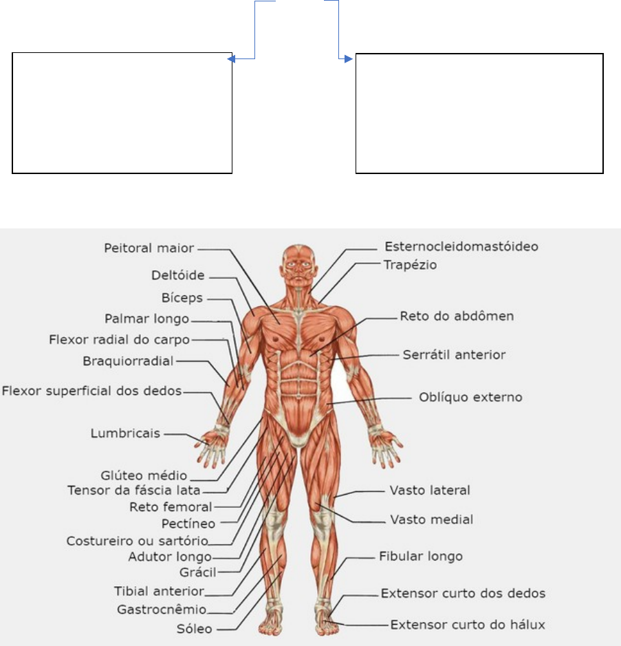 Sistema Muscular As fibras musculares, por sua vez, são controladas pelo sistema nervoso, que se encarregam de receber a informação e respondê-la realizando a ação solicitada. Os músculos são tecidos, cujas células ou fibras musculares possuem a função de permitir a contração e produção de movimentos. Funções do Sistema Muscular O Sistema Muscular apresenta algumas funções que são fundamentais para o corpo humano. Veja a seguir quais são essas funções: · Estabilidade corporal; · Produção de movimentos; · Aquecimento do corpo (manutenção da temperatura corporal); · Preenchimento do corpo (sustentação); · Auxílio nos fluxos sanguíneos. Grupos Musculares O corpo humano é formado por aproximadamente 600 músculos, que trabalham em conjunto com ossos, articulações e tendões para permitir que façamos diversos movimentos. Eles são agrupados da seguinte forma: músculos da cabeça e do pescoço, músculos do tórax e abdômen, músculos dos membros superiores e músculos dos membros inferiores. Características Funcionais do Músculo - Contractilidade (encolhe voluntariamente) - Excitabilidade (responde a estímulos) - Extensibilidade (pode ser estirado) - Elasticidade (volta ao comprimento em repouso) - O músculo encolhe voluntariamente, mas alonga passivamente. Músculos da Cabeça e do Pescoço O grupo muscular da cabeça e do pescoço é composto por mais de 30 pequenos músculos que ajudam a exprimir os sentimentos, mover os maxilares ou manter a cabeça erguida. Músculo Ação Frontal Mastigar ou morder. Masseter Movimentam as mandíbulas. Esternocleidomastoideo Permite a cabeça girar ou se inclinar para frente e para trás. Músculos do Tórax e do Abdômen Os músculos do grupo do tórax e abdômen permitem a respiração, impedem o corpo de se curvar e ceder ao próprio peso, entre outros movimentos. Músculo Ação Peitoral e Deltoide Levantar peso. Intercostais Atuam em conjunto com o diafragma para levarem o ar até os pulmões. Oblíquo Inclina o tórax para a frente. Músculos dos Membros Superiores Os músculos dos membros superiores são capazes de fazer a pressão exata e permitem flexibilidade e precisão para tarefas delicadas ou que exigem muita força Músculo Ação Bíceps Está ligado aos ossos omoplata e rádio, ao se contrair faz o braço se dobrar. Oponente do polegar Permite o movimento do polegar, pois utiliza músculos do antebraço e da mão Curto adutor Movimento para fora do polegar. Músculos dos Membros Inferiores Os músculos dos membros inferiores são os mais fortes do corpo. Graças aos músculos das pernas, podemos ficar de pé e manter o equilíbrio. Músculo Ação Costureiro (ou sartório) É o mais longo músculo do corpo, ao se contrair dobra a perna e gira o quadril. Trata-se do músculo das costureiras, por isso o nome. Flexores dorsais Fazem os dedos do pé levantarem. Tendão de Aquiles É o tendão mais forte do corpo, inserido no osso calcâneo. Sóleo, plantar delgado e gastrocnêmio São músculos flexores plantares responsáveis pelo movimento das bailarinas de ficar na ponta dos pés. Tipos de Músculos Os músculos apresentam diferentes tamanhos, formas e funções, por isso, são classificados em três tipos: liso, estriado cardíaco e estriado esquelético. Músculo Liso ou Não estriado Os músculos lisos são aqueles que possuem contração involuntária. Eles estão localizados nas estruturas ocas do corpo, ou seja, estômago, bexiga, útero, intestino, além da pele e dos vasos sanguíneos Músculo Estriado Cardíaco São músculos de contração involuntária e estão presentes no coração (miocárdio). Esses músculos asseguram os vigorosos batimentos cardíacos. Músculo Estriado Esquelético São músculos de contração voluntária, ou seja, os movimentos são controlados pela vontade do ser humano. Eles estão conectados com os ossos e cartilagens e, através das contrações, permitem os movimentos, as posições corporais, além de estabilizarem as articulações do organismo. image5.jpeg image6.jpeg image7.jpeg image8.jpeg image1.png image2.jpeg image3.jpeg image4.jpeg