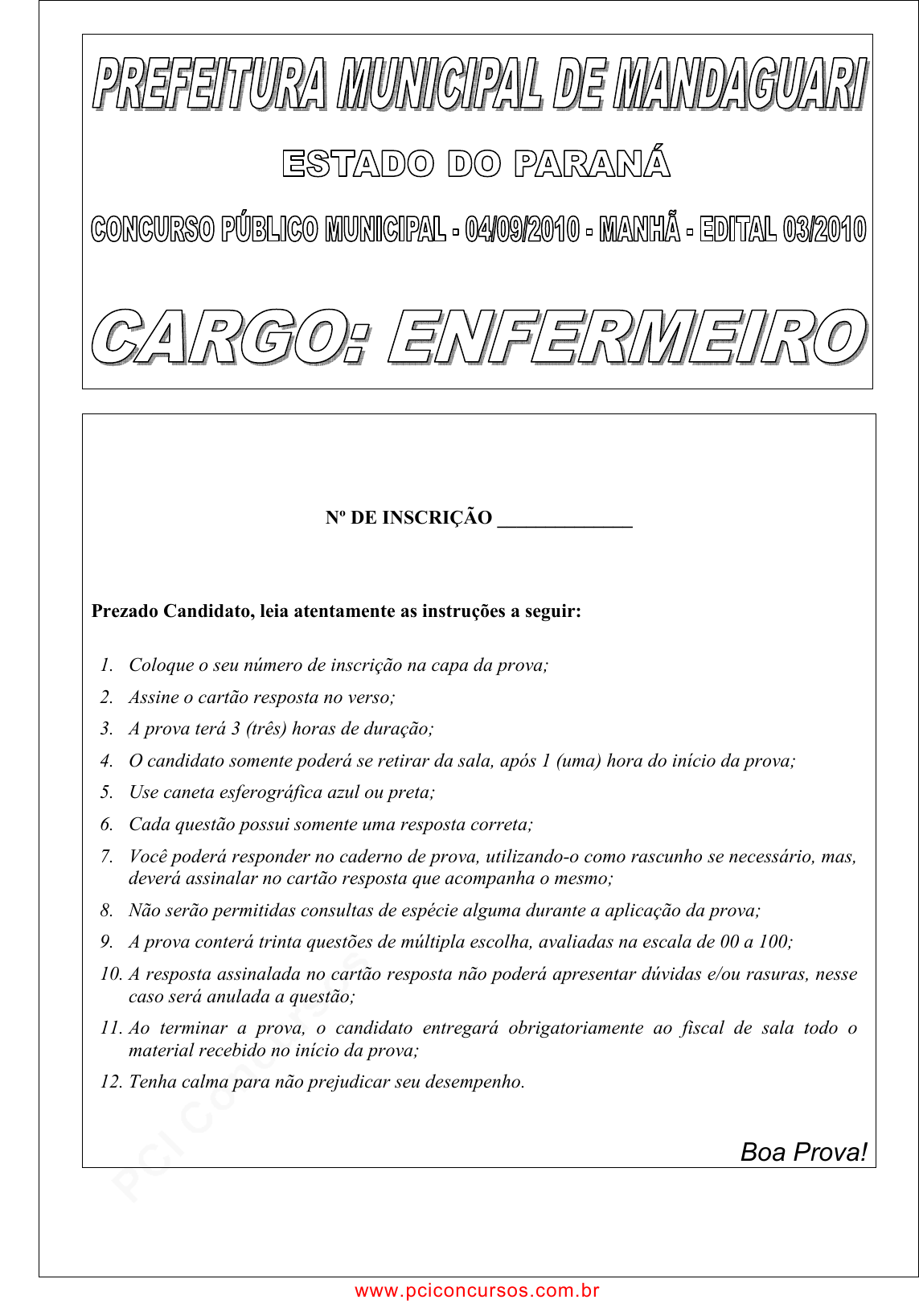 pcimarkpci MDAwMDowMDAwOjAwMDA6MDAwMDowMDAwOmZmZmY6YmFmOTpiNDVi:RnJpLCAyNCBKYW4gMjAyNSAwODoxNDo1MyAtMDMwMA== www.pciconcursos.com.br Nº DE INSCRIÇÃO ______________ Prezado Candidato, leia atentamente as instruções a seguir: 1. Coloque o seu número de inscrição na capa da prova; 2. Assine o cartão resposta no verso; 3. A prova terá 3 (três) horas de duração; 4. O candidato somente poderá se retirar da sala, após 1 (uma) hora do início da prova; 5. Use caneta esferográfica azul ou preta; 6. Cada questão possui somente uma resposta correta; 7. Você poderá responder no caderno de prova, utilizando-o como rascunho se necessário, mas, deverá assinalar no cartão resposta que acompanha o mesmo; 8. Não serão permitidas consultas de espécie alguma durante a aplicação da prova; 9. A prova conterá trinta questões de múltipla escolha, avaliadas na escala de 00 a 100; 10. A resposta assinalada no cartão resposta não poderá apresentar dúvidas e/ou rasuras, nesse caso será anulada a questão; 11. Ao terminar a prova, o candidato entregará obrigatoriamente ao fiscal de sala todo o material recebido no início da prova; 12. Tenha calma para não prejudicar seu desempenho. Boa Prova! www.pciconcursos.com.br pcimarkpci MDAwMDowMDAwOjAwMDA6MDAwMDowMDAwOmZmZmY6YmFmOTpiNDVi:RnJpLCAyNCBKYW4gMjAyNSAwODoxNDo1MyAtMDMwMA== www.pciconcursos.com.br 2 Cultura Além dos seres vivos e da matéria cósmica, existem, também, coisas culturais, muitíssimo mais complicadas. Chama-se cultura tudo o que é feito pelos homens, ou resulta do trabalho deles e de seus pensamentos. Por exemplo, uma cadeira está na cara que é cultural porque foi feita por alguém. Mesmo o banquinho mais vagabundo, que mal se põe em pé, é uma coisa cultural. É cultura, também, porque feita pelos homens, uma galinha. Sem a intervenção humana, que criou os bichos domésticos, as galinhas, as vacas, os porcos, os cabritos, as cabras, não existiriam. Só haveria animais selvagens. A minhoca criada para produzir humo é cultural, eu compreendo. Mas a lombriga que você tem na barriga é apenas um ser biológico. Ou será, ela também, um ser cultural? Cultural não é, porque ninguém cria lombrigas. Elas é que se criam e se reproduzem nas suas tripas. Uma casa qualquer, ainda que material, é claramente um produto cultural, porque é feita pelos homens. A mesma coisa se pode dizer de um prato de sopa, de um picolé ou de um diário. Mas estas são coisas de cultura material, que se podem ver, medir, __________. Há também, para complicar, as coisas da cultura imaterial, impropriamente chamadas de espiritual – muitíssimo mais complicadas. A fala, por exemplo, que se revela quando a gente conversa, e que existe independentemente de qualquer boca falante, é criação cultural. Aliás, a mais importante. Sem a fala, os homens seriam uns macacos, porque não poderiam se entender uns com os outros, para acumular conhecimento e mudar o mundo como temos mudado. (...) Além da fala, temos as crenças, as artes, que são criações culturais, porque inventadas pelos homens e transmitidas uns aos outros através de gerações. Elas se tornam visíveis, se manifestam, através de criações artísticas, ou de ritos e práticas – o _____________, o casamento, a missa – em que a gente vê os conceitos e as idéias _______________ ou artísticas se realizarem. Essa separação de coisas cósmicas, coisas vivas, coisas culturais, ajuda a gente de alguma forma? Sei não. Se não ajuda, diverte. É melhor que decorar um dicionário, ou aprender datas. Você não acha? (Darcy Ribeiro. São Paulo, FTD, 1995.) 01 - Assinale a alternativa que preenche corretamente as lacunas do texto: a) pesar – batisado – religiosas. c) pezar – batizado – religiozas. b) pesar – batizado – religiosas. d) pezar – batisado – religiozas. 02 - Considerando-se o contexto o elemento sublinhado pode ser corretamente substituído pelo que está entre parênteses, sem prejuízo para o sentido do texto, exceto: a) “Sem a intervenção humana...” (1º parágrafo) interferência. b) “... que criou os bichos domésticos...” (1º parágrafo) animais. c) “... é uma coisa cultural (1º parágrafo) um elemento. d) “... criada para produzir humo é cultural (2º parágrafo) um tipo de adubo. 03 - Os travessões utilizados no 5º parágrafo assinalam no texto: a) a interrupção intencional do fluxo lógico das idéias. b) a conclusão da afirmativa anterior. c) um segmento de sentido explicativo, desempenhando a função dos parênteses. d) a síntese do que se vinha dizendo. 04 - A mesma regra que justifica a acentuação gráfica no vocábulo “práticas” aplica-se nos vocábulos da alternativa: a) domésticos – artísticas – cósmicas. c) diário – dicionário – cósmica. b) cósmica – matéria – diário. d) biológico – picolé – aliás. 05 - “... Elas se tornam visíveis, se manifestam, através de criações artísticas, ou de ritos...” (último parágrafo). A expressão pronominal elas é um recurso de coesão textual, está empregada, no texto, para substituir o segmento: a) Além da fala. c) Através das gerações. b) Criações artísticas. d) Criações culturais. 06 - Analise as afirmativas referentes ao texto: I – Segundo o autor, o mundo constitui-se de seres vivos, matéria cósmica e coisas culturais. II – Para Darcy Ribeiro, a criação cultural mais importante que existe é a fala. III – Algumas criações culturais são invisíveis, mas podem se materializar através de determinados acontecimentos sociais. Assinale a alternativa correta: a) apenas I e II estão corretas. c) apenas I e III estão corretas. b) apenas II e III estão corretas. d) I – II e III estão corretas. www.pciconcursos.com.br pcimarkpci MDAwMDowMDAwOjAwMDA6MDAwMDowMDAwOmZmZmY6YmFmOTpiNDVi:RnJpLCAyNCBKYW4gMjAyNSAwODoxNDo1MyAtMDMwMA== www.pciconcursos.com.br 3 07 - Seu Juca tem aplicado R$10.000,00 a juro