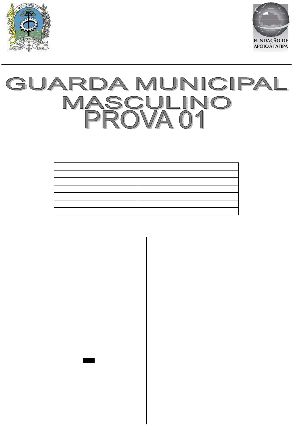 PREFEITURA MUNICIPAL DE SÃO JOSÉ DOS PINHAIS ESTADO DO PARANÁ R E F . E D I T A L N º 9 3 / 2 0 1 1 – C O N C U R S O P Ú B L I C O INSTRUÇÕES Você está recebendo do fiscal um Caderno de Questões com 60 (sessenta) questões numeradas sequencialmente que compõem a prova objetiva. Composição da Prova: QUANTIDADE DE QUESTÕES MATÉRIA 01 a 10 Língua Portuguesa 11 a 20 Raciocínio Lógico e Matemático 21 a 25 Conhecimentos Gerais 26 a 30 Noções de Informática 31 a 50 Legislação Específica 51 a 60 Legislação de Trânsito Você receberá, também, a Folha de Respostas personalizada para transcrever as respostas das questões da prova objetiva. ATENÇÃO 1. É proibido folhear o Caderno de Questões antes da autorização do fiscal. 2. Após autorização, verifique se o Caderno de Questões está completo, sem falhas de impressão e se a numeração está correta. Confira também se sua prova corresponde ao cargo para o qual você se inscreveu. Caso haja qualquer divergência, comunique o fato ao fiscal imediatamente. 3. Confira seu nome completo, o número de seu documento e o número de sua inscrição na Folha de Respostas. Caso encontre alguma divergência, comunique o fato ao fiscal para as devidas providências. 4. Você deverá transcrever as respostas das questões objetivas para a Folha de Respostas definitiva, que será o único documento válido para a correção das provas. O preenchimento da Folha de Respostas é de inteira responsabilidade do candidato. 5. Para realização da prova o candidato deverá utilizar caneta com tinta de cor azul ou preta. 6. Leia atentamente cada questão da prova e assinale, na Folha de Respostas, a opção que a responda corretamente. Exemplo correto da marcação da Folha de Respostas: 7. A Folha de Respostas não poderá ser dobrada, amassada, rasurada ou conter qualquer marcação fora dos campos destinados às respostas. 8. O candidato deverá marcar na Folha de Respostas o número que corresponde a sua prova. 9. Na correção da Folha de Respostas, será atribuída nota 0 (zero) às questões não assinaladas, que contiverem mais de uma alternativa assinalada, emenda ou rasura, ainda que legível. Assim que o candidato finalizar sua prova, deverá, obrigatoriamente, devolver a Folha de Respostas devidamente preenchida e assinada ao fiscal da sala. 10. Você dispõe de 4h (quatro horas) para fazer a prova, incluindo a marcação da Folha de Respostas. Faça-a com tranquilidade, mas controle seu tempo. 11. Você somente poderá deixar definitivamente a sala de prova após 60 (sessenta) minutos de seu início. Caso queira levar o caderno de questões, só poderá levá-lo após 4h (quatro horas) decorridas do início da prova. As provas estarão disponibilizadas no site da FAFIPA (www.fafipa.org/concurso/), a partir da divulgação do Gabarito Preliminar. O candidato poderá anotar o gabarito no verso da capa da prova e levar consigo. 12. Os 03 (três) últimos candidatos da sala só poderão sair juntos e após a conferência de todos os documentos da sala e assinatura do termo de fechamento. 13. Durante a prova, não será permitida qualquer espécie de consulta ou comunicação entre os candidatos, nem a utilização de livros, códigos, manuais, impressos ou anotações, calculadoras, relógios, agendas eletrônicas, pagers, telefones celulares, BIP, Walkman, gravador ou qualquer outro equipamento eletrônico. A utilização desses objetos causará eliminação imediata do candidato. 14. Os objetos de uso pessoal, incluindo telefones celulares, deverão ser desligados e mantidos dessa forma até o término da prova e entrega da Folha de Respostas ao fiscal. 15. Qualquer tentativa de fraude, se descoberta, implicará em imediata denúncia à autoridade competente, que tomará as medidas cabíveis, inclusive com prisão em flagrante dos envolvidos. ED01 FOLHA PARA ANOTAÇÃO DAS RESPOSTAS DO CANDIDATO QUESTÃO 01 02 03 04 05 06 07 08 09 10 11 12 13 14 15 16 17 18 19 20 RESP. QUESTÃO 21 22 23 24 25 26 27 28 29 30 31 32 33 34 35 36 37 38 39 40 RESP. QUESTÃO 41 42 43 44 45 46 47 48 49 50 51 52 53 54 55 56 57 58 59 60 RESP. CARGO: GUARDA MUNICIPAL MASCULINO - 3 - PROVA 01 LÍNGUA PORTUGUESA As questões de 01 a 03 referem-se à tirinha abaixo. http://www.culturamix.com/wp-content/gallery/tirinhas-mafalda/foto- tirinhas-mafalda-02.jpg QUESTÃO 01 Assinale a alternativa INCORRETA quanto ao que se afirma. (A) No primeiro quadrinho, a expressão vou começar pode ser substituída pela expressão começarei. (B) No primeiro quadrinho a preposição de, da expressão de que, pode ser retirada sem prejuízo. (C) No terceiro quadrinho, a expressão assim pode ser substituída pela expressão desse modo. (D) No terceiro quadrinho, a expressão como pode ser substituída pela expressão igual a. (E) No quarto quadrinho, a expressão da gente pode ser substituída pela expressão nossa. QUESTÃO 02 Em “ela tem medo de que eu não goste”, (A) o verbo goste tem seu complemento subentendido na oração anterior. (B) o verbo goste não requer complemento, pois é verbo intransitivo. (C) o verbo goste pede o objeto direto que é a expressão amanhã. (D) o nome medo completa a forma verbal transitiva indireta tem. (E) o nome preocupada completa o verbo transitivo direto está. QUESTÃO 03 No primeiro quadrinho, a expressão porque introduz relação lógico-discursiva de (A) adição. (B) contraste. (C) explicação. (D) conclusão. (E) finalidade. As questões de 04 a 06 referem-se à tirinha abaixo. http://www.nanihumor.com/search/label/tiras QUESTÃO 04 O humor da tirinha consiste (A) no nome atribuído à receita que contém galinha. (B) no fato de haver duas aves conversando como gente. (C) no emprego da expressão receita com duplo sentido. (D) no fato de que galinhas declaram imposto de renda. (E) na atitude do galo em não querer declarar seus bens. QUESTÃO 05 A expressão pegou foi empregada com o sentido de (A) roubar. (B) f