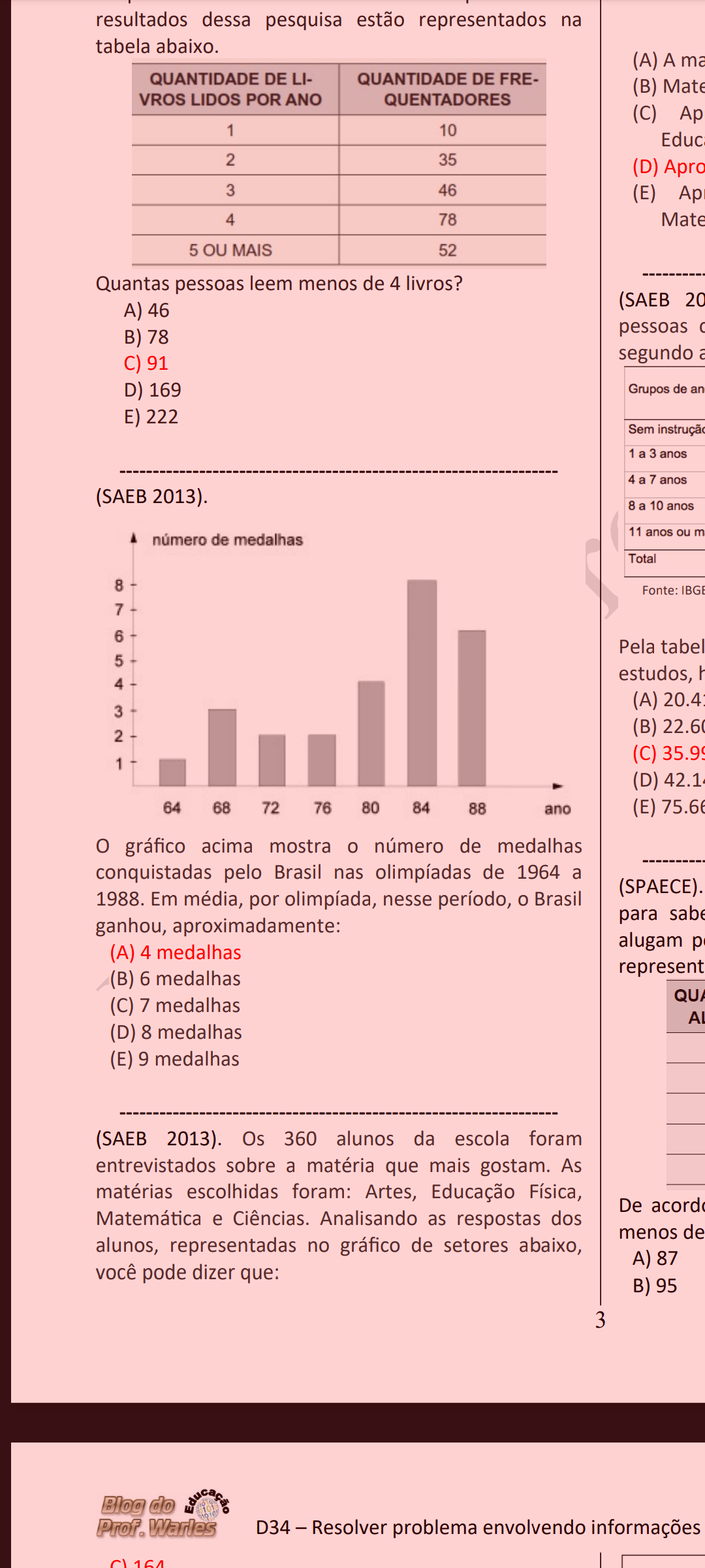 resultados dessa pesquisa estão representados na tabela abaixo. (A) A ma QUANTIDADE DE LI- QUANTIDADE DE FRE- (B) Mate VROS LIDOS POR ANO QUENTADORES (C) Ap 1 10 Educ 2 35 (D) Apro 3 46 (E) Ap 4 78 Mate 5 OU MAIS 52 Quantas pessoas leem menos de 4 livros? A) 46 (SAEB 20 B) 78 pessoas C) 91 segundo a D) 169 Grupos de an E) 222 Sem instrução 1 a 3 anos 4 7 anos (SAEB 2013). 8 a 10 anos número de medalhas 11 anos ou m Total 8 Fonte: 7 6 Pela tabel 5 4 estudos, (A) 20.41 3 2 (B) 1 (C) 35.99 (D) 42.14 64 68 72 76 80 84 88 ano (E) 75.66 o gráfico acima mostra o número de medalhas conquistadas pelo Brasil nas olimpíadas de 1964 a (SPAECE). 1988. Em média, por olimpíada, nesse período, o Brasil para sabe ganhou, aproximadamente: alugam p (A) 4 medalhas represent (B) 6 medalhas QUA (C) 7 medalhas Al (D) 8 medalhas (E) 9 medalhas (SAEB 2013). Os 360 alunos da escola foram entrevistados sobre a matéria que mais gostam. As matérias escolhidas foram: Artes, Educação Física, De acordo Matemática e Ciências. Analisando as respostas dos menos de alunos, representadas no gráfico de setores abaixo, A) 87 você pode dizer que: B) 95 3 Blog do Warles D34 - Resolver problema envolvendo informações CL164
