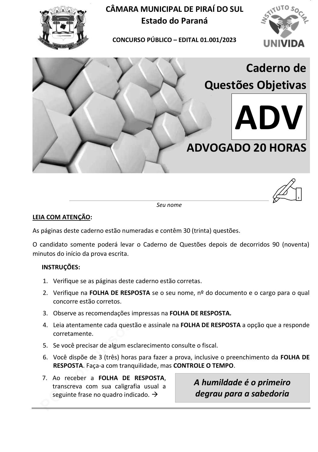 pcimarkpci MDAwMDowMDAwOjAwMDA6MDAwMDowMDAwOmZmZmY6OGY4OTo1NTk2:U2F0LCAyNSBKYW4gMjAyNSAwODoyMzozNCAtMDMwMA== www.pciconcursos.com.br Cargo: ACS – Agente Comunitário de Saúde 1 Prova objetiva CÂMARA MUNICIPAL DE PIRAÍ DO SUL Estado do Paraná CONCURSO PÚBLICO – EDITAL 01.001/2023 Caderno de Questões Objetivas ADV ADVOGADO 20 HORAS Seu nome LEIA COM ATENÇÃO: As páginas deste caderno estão numeradas e contêm 30 (trinta) questões. O candidato somente poderá levar o Caderno de Questões depois de decorridos 90 (noventa) minutos do início da prova escrita. INSTRUÇÕES: 1. Verifique se as páginas deste caderno estão corretas. 2. Verifique na FOLHA DE RESPOSTA se o seu nome, nº do documento e o cargo para o qual concorre estão corretos. 3. Observe as recomendações impressas na FOLHA DE RESPOSTA. 4. Leia atentamente cada questão e assinale na FOLHA DE RESPOSTA a opção que a responde corretamente. 5. Se você precisar de algum esclarecimento consulte o fiscal. 6. Você dispõe de 3 (três) horas para fazer a prova, inclusive o preenchimento da FOLHA DE RESPOSTA. Faça-a com tranquilidade, mas CONTROLE O TEMPO. 7. Ao receber a FOLHA DE RESPOSTA, transcreva com sua caligrafia usual a seguinte frase no quadro indicado. → A humildade é o primeiro degrau para a sabedoria pcimarkpci MDAwMDowMDAwOjAwMDA6MDAwMDowMDAwOmZmZmY6OGY4OTo1NTk2:U2F0LCAyNSBKYW4gMjAyNSAwODoyMzozNCAtMDMwMA== www.pciconcursos.com.br Câmara Municipal de Piraí do Sul-PR Edital 01.001/2023 ADV – Advogado 20 Horas www.institutounivida.org.br 2 Prova Escrita Objetiva Printed in Brazil www.institutounivida.org.br pcimarkpci MDAwMDowMDAwOjAwMDA6MDAwMDowMDAwOmZmZmY6OGY4OTo1NTk2:U2F0LCAyNSBKYW4gMjAyNSAwODoyMzozNCAtMDMwMA== www.pciconcursos.com.br Câmara Municipal de Piraí do Sul-PR Edital 01.001/2023 ADV – Advogado 20 Horas www.institutounivida.org.br 1 Prova Escrita Objetiva LÍNGUA PORTUGUESA TEXTO: Mercosul e União Europeia dizem que estão “engajados” em concluir acordo comercial O Mercosul e a União Europeia divulgaram uma nota conjunta nesta quinta-feira (7) destacando que estão “engajados” para concluir o acordo comercial entre os blocos “rapidamente”. O acordo é negociado há mais de 20 anos. O comunicado foi divulgado durante a 63ª Cúpula de Chefes de Estado do Mercosul e Estados Associados, realizada no Rio de Janeiro. “A UE e o Mercosul estão engajados em discussões construtivas com vistas a finalizar as questões pendentes no âmbito do Acordo de Associação”, diz a nota. Na semana passada, o presidente da França, Emmanuel Macron, disse ser "completamente contra" o acordo comercial. “É um acordo comercial antiquado que desmantela tarifas. Nos últimos anos, esses acordos foram bastante melhorados”, afirmou Macron durante sua participação na COP28, em Dubai. Apesar do posicionamento do líder francês, o presidente Luiz Inácio Lula da Silva (PT) disse que não desistirá do acordo. Para Lula, a França é um país "protecionista", mas a União Europeia tem uma visão diferente. Na nota conjunta, os blocos destacaram que nos últimos meses foram registrados “avanços consideráveis” nas discussões. “As negociações prosseguem com a ambição de concluir o processo e alcançar um acordo que seja mutuamente benéfico para ambas as regiões e que atenda às demandas e aspirações das respectivas sociedades”, diz o comunicado. A União Europeia e o Mercosul afirmaram ainda que esperam fechar “rapidamente” o acordo comercial. “Com base nos avanços efetuados até a presente data nas negociações, ambas as partes esperam alcançar rapidamente um acordo que corresponda à natureza estratégica dos laços que as vinculam e à contribuição crucial que podem oferecer para enfrentar os desafios globais em áreas como o desenvolvimento sustentável, a redução das desigualdades e o multilateralismo”, concluíram. Fonte consultada em 20/12/2023: https://www.gazetadopovo.com.br/economia/mercosul-e- uniao-europeia-dizem-que-estao-engajados-em-concluir- acordo-comercial/ 01. Relativamente à compreensão e à interpretação do texto apresentado, e a seus elementos, marque C=Certo e/ou E=Errado nos pares de parênteses a seguir e, depois, assinale a alternativa que apresenta a sequência correta: ( ) Apesar de os líderes brasileiro e francês terem o mesmo pensamento em relação ao Acordo de Associação, outros chefes de estado possuem posição discordante. ( ) Na iminência de fechamento do acordo comercial, estão incluídos na discussão itens como o desenvolvimento sustentável e a redução das desigualdades. ( ) As tratativas de acordo entre o Mercosul e a União Europeia tiveram início há quase duas décadas. A) E – E – C B) C – C – C C) E – C – E D) C – E – E E) E – E – E 02. Relativamente ao trecho “As negociações prosseguem com a ambição de concluir o processo e alcançar um acordo que seja mutuamente benéfico para ambas as regiões e que atenda às demandas e aspirações das respectivas sociedades”, é correto assinalar: A) A primeira oração permaneceria coerente, mas gramaticalmente incorreta, se o sujeito “As negociações” fosse substituído por “Os negócios”. B) A primeira aparição da palavra “que” poderia ser corretamente substituída pelo pronome relativo “o qual”, mantendo coerência e correção em todo o trecho. C) Se as palavras “demandas” e “aspirações” se apresentassem em ordem invertida, o sinal indicativo de crase que as antecede se desfazeria, tendo em vista a exclusão da preposição “a” em decorrência da inversão. D) A expressão “o processo” é sujeito do verbo concluir e objeto indireto de prosseguem. E) Por ser facultativo, é possível o uso de uma vírgula após a palavra “atenda”, sem comprometer a correção do trecho. 03. O numeral ordinal relativo ao cardinal 63, citado no primeiro parágrafo do texto, se fosse substituído por 603, teri