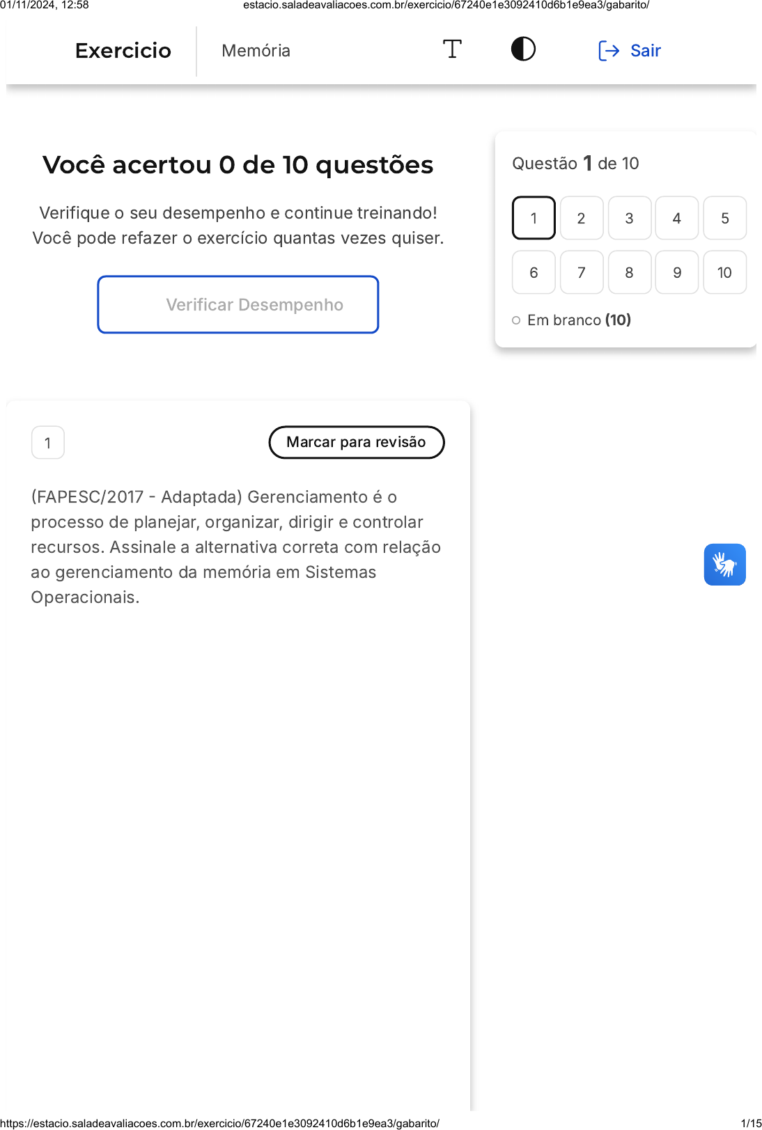 Você acertou 0 de 10 questões Verifique o seu desempenho e continue treinando! Você pode refazer o exercício quantas vezes quiser. Verificar Desempenho 1 Marcar para revisão �FAPESC/2017 � Adaptada) Gerenciamento é o processo de planejar, organizar, dirigir e controlar recursos. Assinale a alternativa correta com relação ao gerenciamento da memória em Sistemas Operacionais. Questão 1 de 10 Em branco �10� 1 2 3 4 5 6 7 8 9 10 Exercicio Memória Sair 01/11/2024, 12:58 estacio.saladeavaliacoes.com.br/exercicio/67240e1e3092410d6b1e9ea3/gabarito/ https://estacio.saladeavaliacoes.com.br/exercicio/67240e1e3092410d6b1e9ea3/gabarito/ 1/15 A B C D E Além de desacoplar os endereços lógicos dos endereços físicos e realizar a tradução entre ambos, a noção de memória virtual também permite implementar a proteção de memória do núcleo e dos processos entre si, fundamentais para a segurança e estabilidade do sistema. Para ocultar a organização complexa da memória física e simplificar os procedimentos de alocação da memória aos processos, os sistemas de computação modernos implementam a noção de memória virtual, na qual existem dois tipos de endereços de memória distintos: Endereços Diretos e Endereços Indiretos. Endereços físicos são os endereços de memória usados pelos processos e pelo sistema operacional e, portanto, usados pelo processador durante a execução. Estes endereços são definidos de acordo com o espaço de endereçamento do processador. Na execução, os processos "enxergam" somente a memória real. Assim, durante a execução de um programa, o processador gera endereços virtuais para acessar a memória. Por questões de desempenho, a tradução de endereços lógicos em físicos é feita por um componente específico do hardware do computador, denominado Unidade de Gerência de Endereçamento Virtual �VMM - Virtual Memory Management). 01/11/2024, 12:58 estacio.saladeavaliacoes.com.br/exercicio/67240e1e3092410d6b1e9ea3/gabarito/ https://estacio.saladeavaliacoes.com.br/exercicio/67240e1e3092410d6b1e9ea3/gabarito/ 2/15 A B Questão não respondida Opa! A alternativa correta é a letra A. Confira o gabarito comentado! Gabarito Comentado A memória virtual é uma técnica que permite ao sistema operacional simular a existência de mais memória física do que a realmente disponível, o que é importante para o desempenho do sistema. Além disso, a memória virtual permite desacoplar os endereços lógicos dos endereços físicos e realizar a tradução entre ambos. Isso é fundamental para a proteção de memória do núcleo e dos processos entre si, garantindo a segurança e a estabilidade do sistema operacional. 2 Marcar para revisão �UFPE/2017� Um cache de imagens para um site foi implementado de forma que as imagens que são solicitadas mais vezes ficam armazenadas no cache, independentemente de quando foram solicitadas. Quando o cache estiver cheio e precisar liberar memória, a imagem com menor quantidade de solicitações é removida. O algoritmo de cache que melhor se encaixa nesta descrição é: MRU LRU 01/11/2024, 12:58 estacio.saladeavaliacoes.com.br/exercicio/67240e1e3092410d6b1e9ea3/gabarito/ https://estacio.saladeavaliacoes.com.br/exercicio/67240e1e3092410d6b1e9ea3/gabarito/ 3/15 C D E LFU RR FIFO Questão não respondida Opa! A alternativa correta é a letra C. Confira o gabarito comentado! Gabarito Comentado O LFU mantém uma contagem das solicitações de cada item e remove o item com a menor contagem de solicitações quando o cache estiver cheio e precisar liberar memória. Esta descrição corresponde à implementação descrita na questão. 3 Marcar para revisão �FAPESC/2022 � Adaptada) Os processadores são componentes de hardware de um computador que executam instruções de programas e realizam cálculos. Quase todos os processadores suportam um mecanismo de memória virtual. Assinale a alternativa correta com relação a esse mecanismo. 01/11/2024, 12:58 estacio.saladeavaliacoes.com.br/exercicio/67240e1e3092410d6b1e9ea3/gabarito/ https://estacio.saladeavaliacoes.com.br/exercicio/67240e1e3092410d6b1e9ea3/gabarito/ 4/15 A B C D E Quando a memória virtual é usada, os campos de endereço das instruções de máquina contêm endereços físicos. Para leituras e escritas da memória principal, uma unidade de gerenciamento da memória �MMU, do inglês, Memory Management Unit) traduz cada endereço virtual para um endereço lógico na memória principal. A memória virtual é uma facilidade que permite que os programas enderecem a memória a partir de um ponto de vista lógico, sem considerar a quantidade de memória principal disponível fisicamente. Uma cache lógica, também conhecida como cache virtual, armazena dados usando endereços físicos, e desta forma o processador acessa a cache diretamente, sem passar pela MMU. O Translation Lookaside Buffer �TLB) é uma memória RAM dinâmica que contém as entradas (linhas) da Tabela de Páginas mais recentemente usadas. Questão não respondida Opa! A alternativa correta é a letra C. Confira o gabarito comentado! Gabarito Comentado A memória virtual é um recurso que permite aos programas endereçarem a memória a partir de uma perspectiva lógica, sem levar em consideração a quantidade de memória 01/11/2024, 12:58 estacio.saladeavaliacoes.com.br/exercicio/67240e1e3092410d6b1e9ea3/gabarito/ https://estacio.saladeavaliacoes.com.br/exercicio/67240e1e3092410d6b1e9ea3/gabarito/ 5/15 A B C principal fisicamente disponível. Isso é possível graças a uma unidade de gerenciamento de memória �MMU�, que traduz endereços virtuais em endereços físicos na memória principal. Assim, a memória virtual permite que os programas acessem uma quantidade de memória lógica que pode ser maior do que a quantidade de memória principal disponível, o que é especialmente útil em sistemas com recursos de memória limitados. 4 Marcar para revisão �COVEST