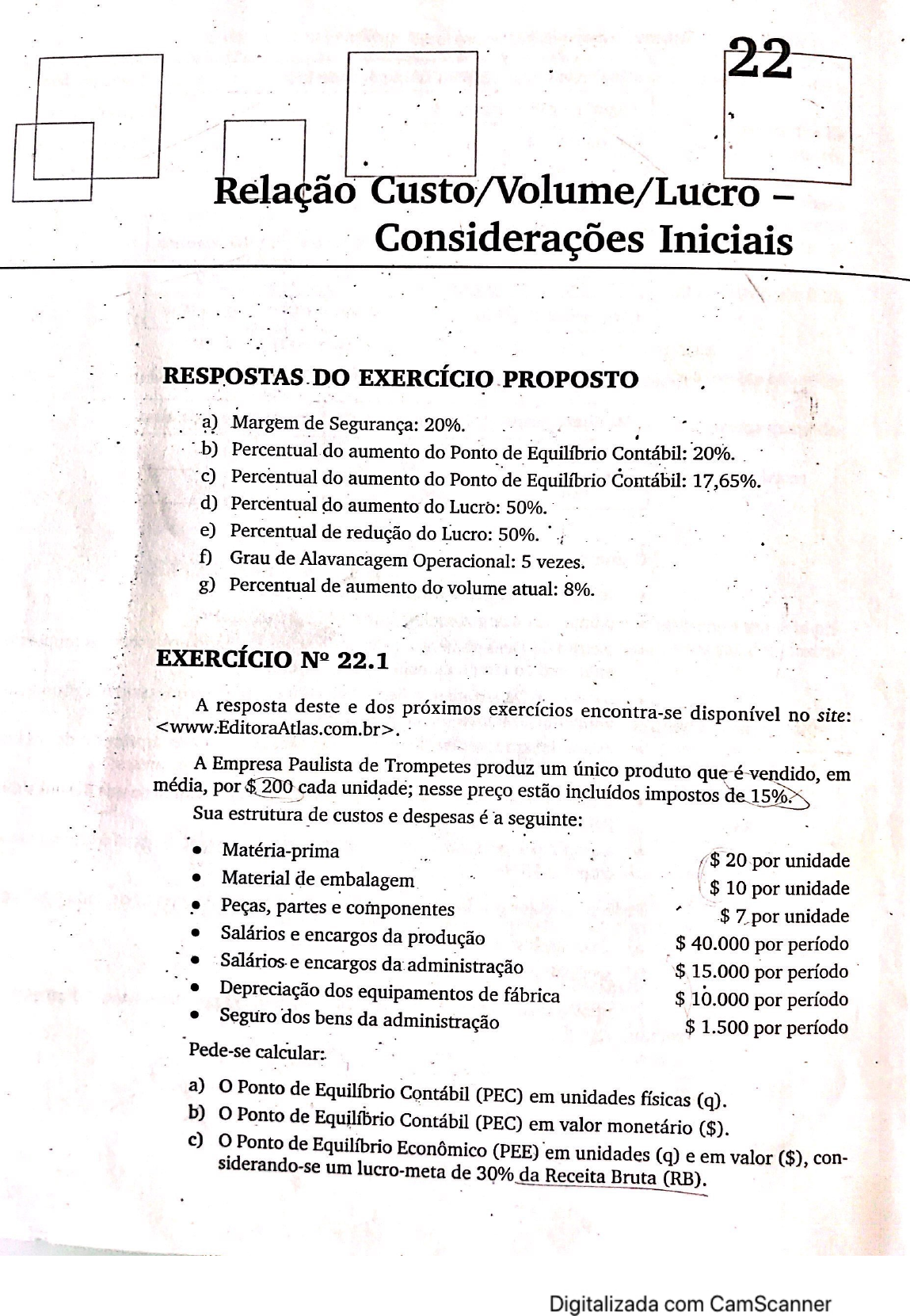 22 Relação Custo/Volume/Lucro - Considerações Iniciais RESPOSTAS DO EXERCÍCIO PROPOSTO a) Margem de Segurança: 20%. b) Percentual do aumento do Ponto de Equilíbrio Contábil: c) Percentual do aumento do Ponto de Equilíbrio Contábil: 17,65%. d) Percentual do aumento do Lucro: e) Percentual de redução do Lucro: f) Grau de Alavancagem Operacional: 5 vezes. g) Percentual de aumento do volume atual: 8%. EXERCÍCIO 22.1 A resposta deste e dos próximos exercícios encontra-se disponível no site: A Empresa Paulista de Trompetes produz um único produto que é vendido, em média, por $ 200 cada unidade; nesse preço estão incluídos impostos de 15%. Sua estrutura de custos e despesas é a seguinte: Matéria-prima $ 20 por unidade Material de embalagem $ 10 por unidade Peças, partes e componentes $ 7 por unidade Salários e encargos da produção $ 40.000 por período Salários e encargos da administração $ 15.000 por período Depreciação dos equipamentos de fábrica $ 10.000 por período Seguro dos bens da administração $ 1.500 por período Pede-se calcular: a) o Ponto de Equilíbrio Contábil (PEC) em unidades físicas (q). b) o Ponto de Equilíbrio Contábil (PEC) em valor monetário ($). c) o Ponto de Equilíbrio Econômico (PEE) em unidades (q) e em valor ($), con- siderando-se um lucro-meta de 30% da Receita Bruta (RB). Digitalizada com CamScannerEXERCÍCIO 22.2 o Hotel Porta das Maravilhas possui 100 apartamentos, todos da categoria Standard Simples. Sua estrutura de custos, despesas e receita é a seguinte: Preço da diária por apartamento, líquido de tributos $ 150 Despesas variáveis por apto. 10% (preço de locação) Custo variável por apartamento por dia Custos fixos anuais $ 480.000 Despesas fixas anuais $ 60.000 Pede-se calcular: a) o Ponto de Equilíbrio Contábil (PEC) em número de diárias (q). b) o Ponto de Equilíbrio Contábil (PEC) em valor ($). c) o Ponto de Equilíbrio Econômico (PEE) em número de diárias (q) e em valor ($), considerando-se um lucro-meta de 20% da Receita Líquida (RL). d) o percentual de margem de segurança, quando a taxa de ocupação é de e) A capacidade teórica do hotel, em termos de número máximo de diárias por ano. f) o percentual de taxa de ocupação, quando a empresa atinge o PEC. g) Idem, quando atinge PEE. h) o lucro operacional do hotel, antes do Imposto de Renda (LAIR), consideran- do-se a taxa de ocupação de EXERCÍCIO 22.3 A empresa Toshimp, produtora de televisores, tem patrimônio líquido (PL) (valor único da empresa para os acionistas) de $ 12.000.000 e produz um único modelo, de um tamanho. Esse produto é vendido, em média, por 555 cada unidade, e nesse preço estão incluídos impostos de 10%. o custo de matéria-prima, material de embalagem, peças, partes e componentes des- é de por unidade; os custos fixos atingem por período; 20% e as des- se valor correspondem à depreciação de máquinas e equipamentos da fábrica; pesas fixas de administração e vendas, $ 400.000, também por período. uma dívida de $ 600.000, de curto prazo, contraída junto a um banco A comercial, empresa possui para financiar seu capital circulante, a vencer no período objeto de análise. Pede-se calcular: a) o Ponto de Equilíbrio Contábil (PEC) em unidades físicas (q) e em valor mo- netário ($) relativo à receita líquida. b) o Ponto de Equilíbrio Financeiro (PEF) em unidades físicas (q) e em valor mo- netário ($) relativo à receita líquida. c) o Ponto de Equilíbrio Econômico (PEE), em unidades físicas (q), consideran- desconta- do que o lucro mínimo desejado pelos acionistas é de 10% do PL, já do o Imposto de Renda sobre o lucro, que é de 20%. 123 Digitalizada com CamScannerEXERCÍCIO 22.4 A Empresa Comp-ID presta serviços de consultoria e possui a seguinte estrutura de preço, custos e despesas: Preço por hora de consultoria, líquido de tributos $ 250 Despesas variáveis 25% (dos honorários líquidos cobrados) Custo variável por hora de consultoria $ 100 Custos fixos mensais $ 300.000 Despesas fixas mensais $ 50.000 Pede-se calcular: a) A Margem de Segurança, em percentual, quando a empresa presta 5.000 ho- ras de consultoria em determinado mês. b) o valor do lucro contábil mensal, quando a empresa atingir o Ponto de Equi- líbrio Econômico, considerando-se um lucro desejado de 5% sobre a receita total. c) o Ponto de Equilíbrio Financeiro, em quantidade de horas (h), considerando- se que 40% dos custos fixos são sunk costs. d) o Ponto de Equilíbrio Contábil, em quantidade de horas (h), caso a empresa reduza seu preço de consultoria em EXERCÍCIO N° 22.5 Uma indústria do setor eletroeletrônico produz um único artigo, cujo preço de venda bruto é de $ 1.200 por unidade; o custo dos componentes utilizados para a pro- dução das filmadoras é de $ 650/un. o valor do Patrimônio Líquido (PL) da empresa é de $ 2.000.000 e ela possui um passivo tributário cujo parcelamento acaba de ser negociado com a Secretaria da Re- ceita. o acordo de parcelamento estipula que o valor de cada pagamento mensal deve corresponder a 3% da receita bruta. Tabela 1 Estrutura básica de custos e despesas fixos mensais da empresa. $10.500 Aluguel do galpão industrial $ 12.000 Supervisão geral da produção Energia elétrica na produção (demanda) $ 6.800 $ 9.500 Despesas administrativas gerais da empresa $ 25.000 Depreciação das máquinas de produção $ 68.000 Despesas com publicidade e.propaganda $ 10.100 Despesas com assessoria de imprensa 124 Digitalizada com CamScannerOutros dados: sobre a receita bruta incidem 25% de tributos; e a empresa remunera seus vendedores à base de 2% sobre a receita líquida. Com base nos dados apresentados, pede-se calcular o Ponto de Equilíbrio mensal da empresa (PE) em unidades físicas (q), de modo a cumprir com o parcelamento de tributos e ainda remunerar os acionistas em 6% ao ano. A resposta destes exercícios encontra-se disponível no site: