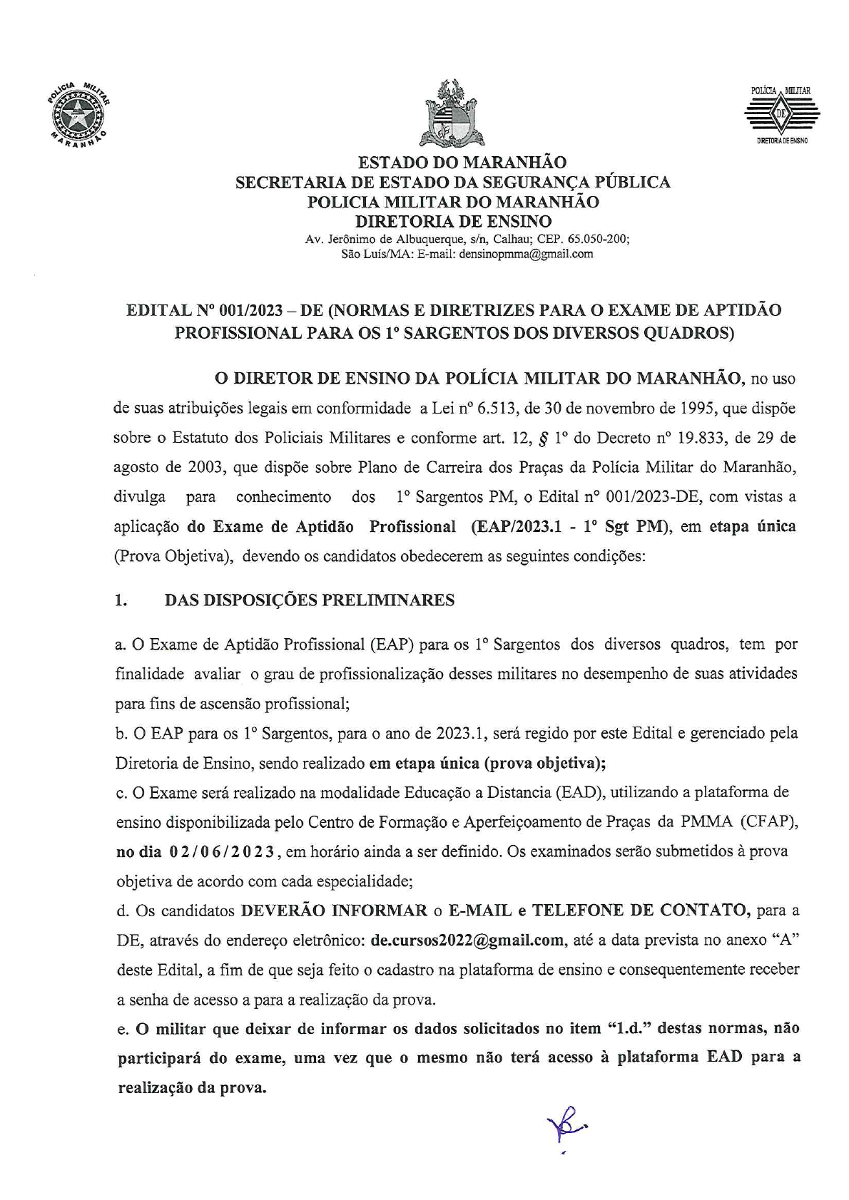 POLICIA POLÍCIA MILITAR DIRETORIA DE ENSINO ESTADO DO MARANHÃO SECRETARIA DE ESTADO DA SEGURANÇA PÚBLICA POLICIA MILITAR DO MARANHÃO DIRETORIA DE ENSINO Av. Jerônimo de Albuquerque, s/n, Calhau; CEP. 65.050-200; São Luís/MA: E-mail: densinopmma@gmail.com EDITAL 001/2023 DE (NORMAS E DIRETRIZES PARA EXAME DE APTIDÃO PROFISSIONAL PARA os 1° SARGENTOS DOS DIVERSOS QUADROS) o DIRETOR DE ENSINO DA POLÍCIA MILITAR DO MARANHÃO, no uso de suas atribuições legais em conformidade a Lei n° 6.513, de 30 de novembro de 1995, que dispõe sobre o Estatuto dos Policiais Militares e conforme art. 12, § 1° do Decreto n° 19.833, de 29 de agosto de 2003, que dispõe sobre Plano de Carreira dos Praças da Polícia Militar do Maranhão, divulga para conhecimento dos 1° Sargentos PM, o Edital n° 001/2023-DE, com vistas a aplicação do Exame de Aptidão Profissional (EAP/2023.1 - 1° Sgt PM), em etapa única (Prova Objetiva), devendo os candidatos obedecerem as seguintes condições: 1. DAS DISPOSIÇÕES PRELIMINARES a. O Exame de Aptidão Profissional (EAP) para os 1° Sargentos dos diversos quadros, tem por finalidade avaliar o grau de profissionalização desses militares no desempenho de suas atividades para fins de ascensão profissional; b. O EAP para os 1° Sargentos, para o ano de 2023.1, será regido por este Edital e gerenciado pela Diretoria de Ensino, sendo realizado em etapa única (prova objetiva); O Exame será realizado na modalidade Educação a Distancia (EAD), utilizando a plataforma de ensino disponibilizada pelo Centro de Formação e Aperfeiçoamento de Praças da PMMA (CFAP), no dia 02/06/2023, em horário ainda a ser definido. Os examinados serão submetidos à prova objetiva de acordo com cada especialidade; d. Os candidatos DEVERÃO INFORMAR o E-MAIL e TELEFONE DE CONTATO, para a DE, através do endereço eletrônico: de.cursos2022@gmail.com, até a data prevista no anexo "A" deste Edital, a fim de que seja feito o cadastro na plataforma de ensino e consequentemente receber a senha de acesso a para a realização da prova. e. O militar que deixar de informar os dados solicitados no item "1.d." destas normas, não participará do exame, uma vez que o mesmo não terá acesso à plataforma EAD para a realização da prova.2. DAS VAGAS Serão convocados os 1° Sargentos PM, constantes no Anexo "G", deste Edital, cabendo ao indicado que não tiver interesse em participar do EAP, formalizar sua desistência para a Diretoria de Ensino. 3. DOS REQUISITOS a) Estar classificado no mínimo no comportamento BOM; b) Não estar submetido a conselho de disciplina; c) Ser 1° Sargento PM e constar na relação da disponibilizada pela CPPPM, constante no Anexo "G" d) Não possuir EAP. 4. DA APLICAÇÃO DO EXAME Exame de Aptidão Profissional (EAP), será realizado em etapa única (prova objetiva), e a aplicação do mesmo será de responsabilidade da Comissão nomeada através de Portaria do Comandante Geral da PMMA, sob a coordenação da Diretoria de Ensino, obedecendo os critérios abaixo estabelecidos: a) Na prova objetiva serão cobrados os assuntos constantes nos anexos "B", "C", "D", "E" e destas normas, para cada QPMP equivalente. A prova terá valor de 10,0 (dez) pontos e conterá 30 (trinta) questões objetivas de múltipla escolha, sendo 20 (vinte) questões no valor de 0,30 cada e 10 (dez) questões no valor de 0,40 cada. Todas as questões terão 04 (quatro) alternativas de resposta, das quais apenas uma será a correta; b) As 20 (vinte) questões da prova objetiva serão comuns a todas as especialidades, com assuntos constantes no anexo "B". As outras 10 (dez) questões serão referentes a assuntos específicos de cada especialidade, conforme anexos "C", " D" "E" e "F"; c) Todas as 30 (trinta) questões das provas dos Sargentos Combatentes (QPMP-0) constarão apenas no Anexo "B"; d) A prova terá hora determinada com abertura da plataforma EAD/CFAP para início, bem como fechamento da plataforma ao término do horário e, subsequente divulgação do resultado da avaliação. Não será admitido questões sem resposta, sendo consideradas incorretas para o candidato; e) A Comissão de Aplicação do EAP/2023.1, não se responsabilizará por eventual ausência ou interrupção no fornecimento de energia elétrica ou pela instabilidade na conexão de internet para acesso à plataforma EAD/CFAP durante a aplicação da prova objetiva, salvo em caso de incidente natural/sinistro, devidamente comprovado;f) Havendo anulação de questão, o ponto a ela atribuído será revertido a todos os candidatos. 5. DA CLASSIFICAÇÃO a) Para estar Apto no exame, o candidato deverá obter pontuação final mínima de 07 (sete). b) A Diretoria de Ensino divulgará a relação dos candidatos aptos no EAP após a correção das provas e resultados, conforme cronograma constante no Anexo "A". c) resultado dos exames a que se refere esse Edital não altera a ordem de classificação por antiguidade dos considerados aptos. 6. DAS PRESCRIÇÕES DIVERSAS a) Será de responsabilidade da Comissão do EAP/1° Sgt PM, emitir para a Diretoria de Ensino a Ata contendo o resultado parcial das notas dos candidatos, e consequentemente a emissão da ATA com o resultado final de APTO ou INAPTO, a qual deverá ser divulgada pela Diretoria de Ensino, conforme prazo previsto no Anexo "A"; b) Qualquer membro designado para compor a comissão de elaboração da prova de conhecimentos ou análise de recursos deverá alegar impedimento à autoridade que o designou, caso exista dentre os candidatos pessoa com quem tenha parentesco afim ascendentes, descendentes ou irmãos do cônjuge/companheiro (a) consanguíneo em linha reta, colateral até 4° grau ou cônjuge/companheiro (a) ou alegar suspeição por outros motivos, sob pena de responsabilidade administrativa, civil e penal; c) candidato terá o prazo de 48 (quarenta e oito) horas após a divulgação do resultado Parcial para recorrer administrativamente no q