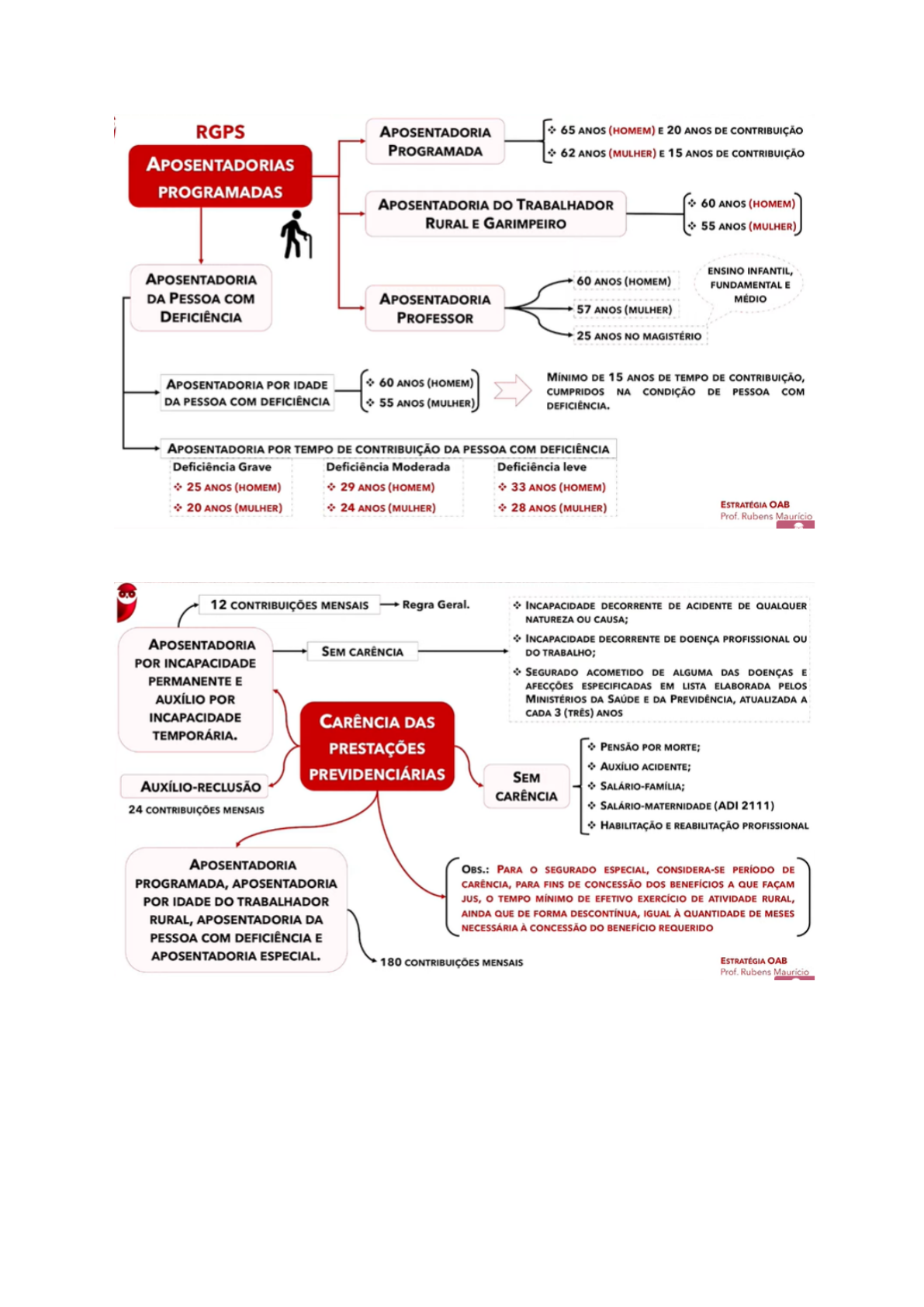 RGPS APOSENTADORIA 65 ANOS (HOMEM) E 20 ANOS DE CONTRIBUIÇÃO PROGRAMADA 62 ANOS (MULHER) E 15 ANOS DE CONTRIBUIÇÃO APOSENTADORIAS PROGRAMADAS APOSENTADORIA DO TRABALHADOR 60 ANOS (HOMEM) RURAL E GARIMPEIRO 55 ANOS (MULHER) ENSINO INFANTIL, APOSENTADORIA 60 ANOS (HOMEM) FUNDAMENTAL E DA PESSOA COM APOSENTADORIA MÉDIO 57 ANOS (MULHER) DEFICIÊNCIA PROFESSOR 25 ANOS NO MAGISTÉRIO 60 ANOS (HOMEM) MÍNIMO DE 15 ANOS DE TEMPO DE CONTRIBUIÇÃO, APOSENTADORIA POR IDADE CUMPRIDOS NA CONDIÇÃO DE PESSOA COM DA PESSOA COM DEFICIÊNCIA 55 ANOS (MULHER) DEFICIÊNCIA. APOSENTADORIA POR TEMPO DE CONTRIBUIÇÃO DA PESSOA COM DEFICIÊNCIA Deficiência Grave Deficiência Moderada Deficiência leve 25 ANOS (HOMEM) 29 ANOS (HOMEM) 33 ANOS (HOMEM) 20 ANOS (MULHER) 24 ANOS (MULHER) 28 ANOS (MULHER) ESTRATÉGIA OAB Prof. Rubens 12 CONTRIBUIÇÕES MENSAIS Regra Geral. INCAPACIDADE DECORRENTE DE ACIDENTE DE QUALQUER NATUREZA CAUSA; APOSENTADORIA INCAPACIDADE DECORRENTE DE DOENÇA PROFISSIONAL SEM CARÊNCIA DO TRABALHO; POR INCAPACIDADE SEGURADO ACOMETIDO DE ALGUMA DAS DOENÇAS E PERMANENTE E AFECÇÕES ESPECIFICADAS EM LISTA ELABORADA PELOS AUXÍLIO POR MINISTÉRIOS DA SAÚDE E DA PREVIDÊNCIA, ATUALIZADA A INCAPACIDADE CADA 3 ANOS CARÊNCIA DAS TEMPORÁRIA. PRESTAÇÕES PENSÃO POR MORTE; PREVIDENCIÁRIAS ACIDENTE; SEM CARÊNCIA 24 CONTRIBUIÇÕES MENSAIS SALÁRIO-MATERNIDADE (ADI 2111) HABILITAÇÃO E REABILITAÇÃO PROFISSIONAL APOSENTADORIA OBS.: PARA SEGURADO ESPECIAL, CONSIDERA-SE PERÍODO DE PROGRAMADA, APOSENTADORIA CARÊNCIA, PARA FINS DE CONCESSÃO DOS BENEFÍCIOS A QUE FAÇAM POR IDADE DO TRABALHADOR JUS, TEMPO MÍNIMO DE EFETIVO EXERCÍCIO DE ATIVIDADE RURAL, AINDA QUE DE FORMA DESCONTÍNUA, IGUAL À QUANTIDADE DE MESES RURAL, APOSENTADORIA DA NECESSÁRIA À CONCESSÃO DO BENEFÍCIO REQUERIDO PESSOA COM DEFICIÊNCIA E APOSENTADORIA ESPECIAL. 180 CONTRIBUIÇÕES MENSAIS ESTRATÉGIA OAB Prof. Rubens
