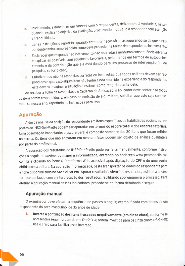 Inicialmente, estabelecer um rapport com o respondente, deixando-o à vontade e, na se- a. quência, explicar o objetivo da avaliação, procurando motivá-lo a responder com atenção e tranquilidade. b. Ler as instruções e repeti-las quando entender necessário, assegurando-se de que res- pondente tenha compreendido como deve proceder na tarefa de responder ao Esclarecer que responder ao instrumento não acarretará nenhuma consequência adversa C. e explicar as possíveis consequências favoráveis, pelo menos em termos de autoconhe- cimento e da contribuição que ele está dando para um processo de intervenção (ou de pesquisa, se for caso). d. Enfatizar que não há respostas corretas ou incorretas, que todos os itens devem ser res- pondidos e que, caso algum item não tenha ainda ocorrido na experiência do respondente, este deverá imaginar a situação e estimar como reagiria diante dela. Ao receber a Folha de Respostas e o Caderno de Aplicação, o aplicador deve conferir se todos os itens foram respondidos e, em caso de omissão de algum item, solicitar que este seja comple- tado, se necessário, repetindo as instruções para isso. Apuração Além da análise da posição do respondente em itens específicos de habilidades sociais, as res- postas ao IHS2-Del-Prette podem ser apuradas em termos do escore total e dos escores fatoriais. Uma observação importante: o escore geral é composto somente dos 30 itens que foram retidos na escala. Os itens que não entraram em nenhum fator podem ser objeto de análise qualitativa por parte do profissional. A apuração dos resultados do IHS2-Del-Prette pode ser feita manualmente, conforme instru- ções a seguir, ou on-line, de maneira informatizada, entrando no endereço www.pearsonclinical. com.br e clicando no ícone Q-Plataforma Web, acessível após digitação do CPF e de uma senha obtida com a editora. Na apuração informatizada, basta transportar os dados do respondente para a ficha disponibilizada no site e clicar em "Apurar resultado". dos resultados, o sistema on-line fornece um laudo com a interpretação dos resultados, facilitando sobremaneira o processo. Para efetuar a apuração manual desses indicadores, procede-se da forma detalhada a seguir. Apuração manual examinador deve efetuar a sequência de passos a seguir, exemplificada com dados de um respondente do sexo masculino, de 35 anos de idade: 1. Inverta a pontuação dos itens fraseados negativamente (em cinza claro), conforme se apresenta a seguir (ordem direta: 0-1-2-3-4; ordem invertida para os cinza claro: 4-3-2-1-0); use o crivo para facilitar essa inversão. 66A B C D E A B C D 1 20 2 21 3 22 4 23 5 24 6 25 X 7 26 8 27 9 28 10 29 11 X 30 12 31 13 32 14 33 15 34 16 35 17 36 18 37 19 38 2. Compute o escore geral do respondente. Some a pontuação dos itens relativos ao escore total e a cada um dos fatores. 3. Compute escore de cada fator. Some os pontos obtidos pelo respondente em cada fator, considerando os itens que pertencem a cada uma delas, conforme especificado a seguir. Fator Itens a serem somados Escore geral Todos, exceto 04, 05, 14, 21, 32, 34, 37, 38 F1 - Conversação assertiva 02, 08, 09, 13, 17, 18, 19, 22, 23, 24, 26, 33, 36 F2 - Abordagem afetivo-sexual 07, 12, 20 F3 - Expressão de sentimento positivo 03, 06, 10, 25, 28, 29, 31, 35 F4 - Autocontrole/enfrentamento 11, 15, 16, 27, 30 F5 - Desenvoltura social 01, 09, 11, 19, 29, 31 674. Identifique a posição percentil para escore geral e para os escores fatoriais subes- calas. Consulte a tabela correspondente à faixa etária e ao sexo do respondente (Tabelas 6.1 a 6.4, no próximo capítulo). Como regra geral, quando há várias posições percentis para um mesmo escore, deve-se escolher percentil mais alto. 5. Preencha a Ficha de Apuração. Transporte os valores do escore total, dos escores fato- riais e dos itens para a Ficha de Apuração do respondente. 6. Compare o perfil do respondente com os valores médios do grupo amostral de refe- rência do mesmo sexo e faixa etária (área sombreada da coluna "Resultado bruto"), identificando os fatores e os itens em que o respondente se situou acima (em cinza escuro) ou abaixo (em cinza claro) do valor médio apresentado pelo grupo amostral. 686. NORMATIZAÇÃO E INTERPRETAÇÃO A interpretação dos resultados do IHS2-Del-Prette deve ser feita sempre considerando a refe- rência normativa do respondente, ou seja, os resultados de referência para sua faixa etária e seu gênero. Assim, os resultados do IHS2-Del-Prette, obtidos por um respondente específico, devem ser convertidos em sua posição percentil em relação ao grupo amostral de referência normativa, considerando-se: (a) o escore total; (b) os escores fatoriais; (c) os valores de cada item. escore total permite uma primeira avaliação da existência de recursos e déficit em habili- dades sociais no repertório do respondente. Porém, considerando o caráter situacional das habi- lidades sociais, é necessário verificar o quanto tais déficit são generalizados ou em quais áreas de habilidades específicas eles estão localizados. A análise dos valores obtidos pelo respondente nos diferentes fatores e em itens específicos permite confecção de seu portfólio, com identificação de seus déficit e recursos, que podem orientar as decisões baseadas na avaliação e a definição de objetivos de programas de treinamento de habilidades sociais (A. Del Prette, & Del Prette, 2017). Identificando a posição percentil dos escores do respondente na amostra normativa A interpretação dos resultados do IHS2-Del-Prette está baseada na conversão dos escores em um sistema de percentis referenciados à norma para gênero e faixa etária, tanto no caso do escore total quanto no dos escores fatoriais. sistema de percentis foi baseado no grupo amostral de 4.250 respondentes (que serviu de base à atualização das propriedades psicométricas do IHS- 2-Del-Prette); a maioria dos respond