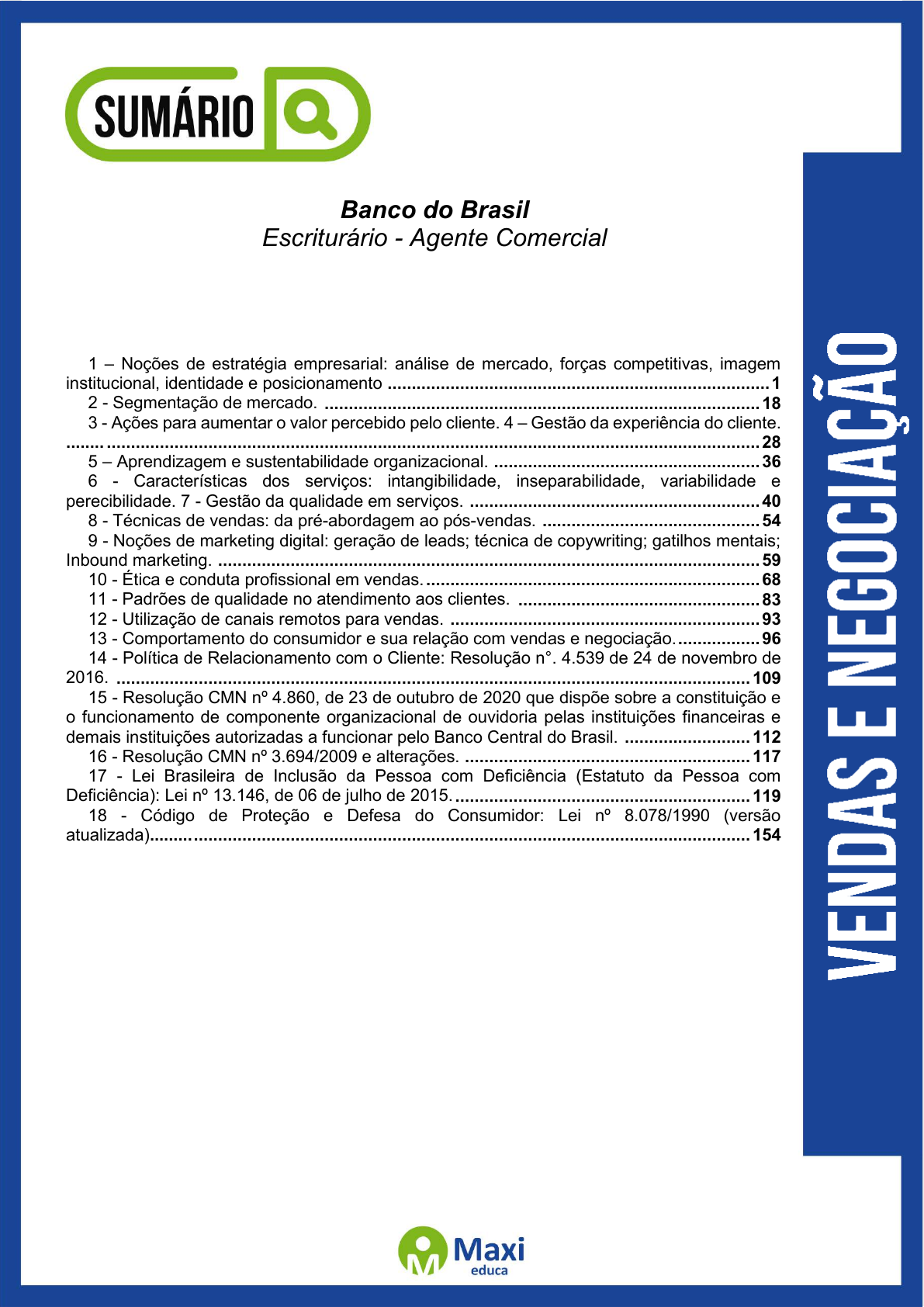 1 Banco do Brasil Escriturário - Agente Comercial 1 – Noções de estratégia empresarial: análise de mercado, forças competitivas, imagem institucional, identidade e posicionamento ............................................................................... 1 2 - Segmentação de mercado. .......................................................................................... 18 3 - Ações para aumentar o valor percebido pelo cliente. 4 – Gestão da experiência do cliente. ........ ....................................................................................................................................... 28 5 – Aprendizagem e sustentabilidade organizacional. ....................................................... 36 6 - Características dos serviços: intangibilidade, inseparabilidade, variabilidade e perecibilidade. 7 - Gestão da qualidade em serviços. ............................................................ 40 8 - Técnicas de vendas: da pré-abordagem ao pós-vendas. ............................................. 54 9 - Noções de marketing digital: geração de leads; técnica de copywriting; gatilhos mentais; Inbound marketing. ................................................................................................................ 59 10 - Ética e conduta profissional em vendas. ..................................................................... 68 11 - Padrões de qualidade no atendimento aos clientes. .................................................. 83 12 - Utilização de canais remotos para vendas. ................................................................ 93 13 - Comportamento do consumidor e sua relação com vendas e negociação. ................. 96 14 - Política de Relacionamento com o Cliente: Resolução n°. 4.539 de 24 de novembro de 2016. ................................................................................................................................... 109 15 - Resolução CMN nº 4.860, de 23 de outubro de 2020 que dispõe sobre a constituição e o funcionamento de componente organizacional de ouvidoria pelas instituições financeiras e demais instituições autorizadas a funcionar pelo Banco Central do Brasil. .......................... 112 16 - Resolução CMN nº 3.694/2009 e alterações. ........................................................... 117 17 - Lei Brasileira de Inclusão da Pessoa com Deficiência (Estatuto da Pessoa com Deficiência): Lei nº 13.146, de 06 de julho de 2015. ............................................................. 119 18 - Código de Proteção e Defesa do Consumidor: Lei nº 8.078/1990 (versão atualizada)......... ................................................................................................................... 154 1671811 E-book gerado especialmente para CARLA DIAS FERRAZ 2 Olá Concurseiro, tudo bem? Sabemos que estudar para concurso público não é tarefa fácil, mas acreditamos na sua dedicação e por isso elaboramos nossa apostila com todo cuidado e nos exatos termos do edital, para que você não estude assuntos desnecessários e nem perca tempo buscando conteúdos faltantes. Somando sua dedicação aos nossos cuidados, esperamos que você tenha uma ótima experiência de estudo e que consiga a tão almejada aprovação. Pensando em auxiliar seus estudos e aprimorar nosso material, disponibilizamos o e-mail professores@maxieduca.com.br para que possa mandar suas dúvidas, sugestões ou questionamentos sobre o conteúdo da apostila. Todos e-mails que chegam até nós, passam por uma triagem e são direcionados aos tutores da matéria em questão. Para o maior aproveitamento do Sistema de Atendimento ao Concurseiro (SAC) liste os seguintes itens: 01. Apostila (concurso e cargo); 02. Disciplina (matéria); 03. Número da página onde se encontra a dúvida; e 04. Qual a dúvida. Caso existam dúvidas em disciplinas diferentes, por favor, encaminhar em e-mails separados, pois facilita e agiliza o processo de envio para o tutor responsável, lembrando que teremos até cinco dias úteis para respondê-lo (a). Não esqueça de mandar um feedback e nos contar quando for aprovado! Bons estudos e conte sempre conosco! 1671811 E-book gerado especialmente para CARLA DIAS FERRAZ 1 A análise de mercado é um dos componentes do plano de negócios1 que está relacionado ao marketing da organização. Ela apresenta o entendimento do mercado da empresa, seus clientes, seus concorrentes e quanto a empresa conhece, em dados e informações, o mercado onde atua. A análise do mercado permite ainda se conhecer de perto o ambiente onde o produto/serviço se encontra. O mercado está composto pelo ambiente onde a empresa e produto se localizam, pela concorrência e pelo perfil do consumidor. A definição do mercado leva em conta: • Análise da Indústria/Setor • Descrição do Segmento de Mercado • Análise SWOT do produto/serviço • Análise da Concorrência • Análise da Indústria/Setor A análise da indústria deve apresentar as informações a respeito do tamanho, crescimento e estrutura da indústria/setor em que sua organização está inserida. Inicia-se com a coleta de informação do setor ao qual pertence o produto/serviço. Essa informação é geralmente discriminada em termos dos objetivos e pode estar relacionada com a estrutura da indústria e do setor em termos estatísticos, práticas de marketing e o composto de marketing. Essa informação pode ser usada para monitorar mudanças no setor e aproveitar as oportunidades decorrentes dessas mudanças em nichos específicos. Descrição do Segmento de Mercado Definido o setor em que atua e seu mercado geral, você também quer e precisa saber identificar e clarificar quais porções particulares, ou segmentos deste mercado são seu alvo. O segmento de mercado é definido a partir das características do produto, estilo de vida do consumidor (idade, sexo, renda, profissão, família