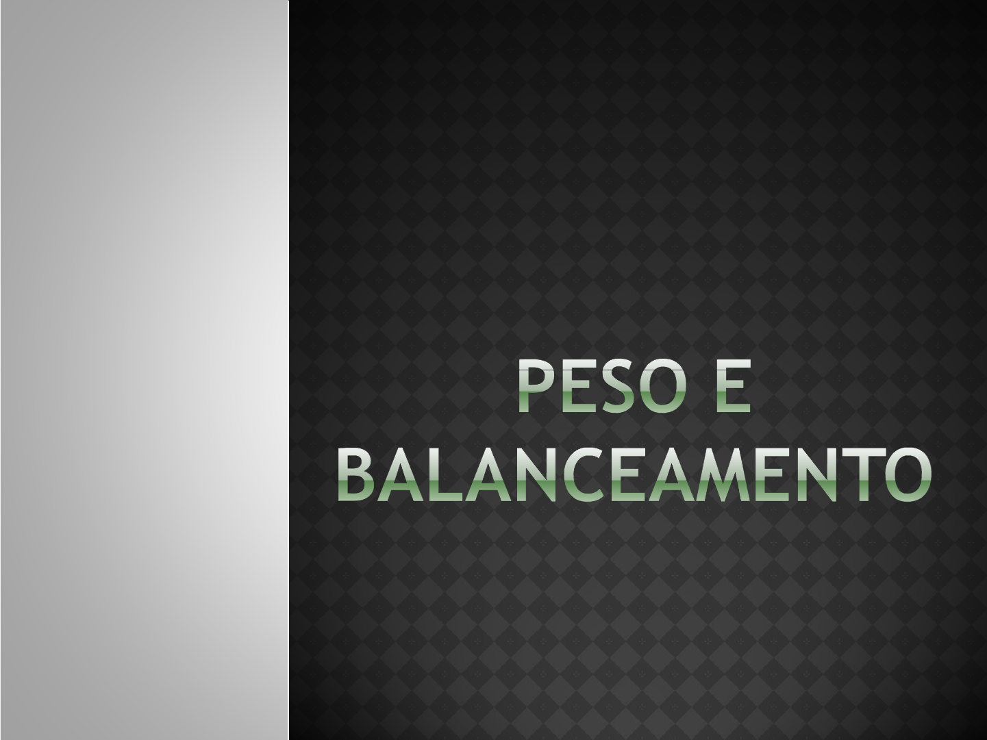 � PESOPESO –– O peso é a força gravitacional, em virtude da atração gravitacional, exercida em um corpo massivo. ��BRAÇOBRAÇO –– Uma determinada distância de um eixo de rotação. ��MOMENTOMOMENTO (TORQUE)(TORQUE) –– É o peso X braço, produzindo um movimento rotacional. � LINHALINHA DATUMDATUM –– Linha de referência ou linha DATUM, é uma linha imaginária em plano vertical, localizada em uma posição que a partir dela faremos medidas no plano horizontal. �� PBPB PesoPeso BásicoBásico (BW(BW BasicBasic Weight)Weight) -- É o avião vazio, incluindo fluido hidráulico, óleo, combustível não drenável, poltronas e equipamentos fixos. �� PBOPBO PesoPeso básicobásico operacionaloperacional –– PB + tripulação com bagagens + copa. �� PAZCPAZC PesoPeso zerozero combustívelcombustível –– PBO + carga paga (payload). 75 Kg75 Kg �� POPO PesoPeso operacionaloperacional –– PBO + combustível de decolagem. �� PADPAD PesoPeso dede decolagemdecolagem –– É a soma do peso zero combustível PAZC + combustível de decolagem, ou PO + carga paga. 75 Kg75 Kg �� CargaCarga útilútil -- É a soma da carga paga com o combustível de decolagem. 75 Kg75 Kg75 Kg75 Kg �� PAPPAP PesoPeso dede pousopouso –– PAD - Trip Fuel ( combustível consumido na etapa). �� CombustívelCombustível àà decolagemdecolagem (Take(Take--OffOff Fuel)Fuel) -- É o peso do combustível nos tanques no momento em que o avião se encontra na cabeceira da pista, pronto para decolar. �� CombustívelCombustível parapara TaxiTaxi (Taxi(Taxi Fuel)Fuel) -- É o peso total do combustível queimado durante o “Taxi” do avião até o ponto de início de decolagem. �� AbastecimentoAbastecimento dede CombustívelCombustível (Block(Block Fuel)Fuel) -- É o peso total de combustível existente nos tanques, antes de iniciar o acionamento dos motores. �� CombustívelCombustível aa consumirconsumir nana viagemviagem (Trip(Trip Fuel)Fuel) -- É o peso estimado, calculado no planejamento de voo, para ser consumido desde o início da decolagem até o pouso no destino.destino. �� CombustívelCombustível ReservaReserva (MFOD)(MFOD) -- É o peso total de combustível restante nos tanques, sobre o aeródromo de destino. �� AA ++ BB ++ 1010%% triptrip fuelfuel ++ CC ++ 3030 minutosminutos dede�� AA ++ BB ++ 1010%% triptrip fuelfuel ++ CC ++ 3030 minutosminutos dede esperaespera (holding)(holding) 15001500 ftft AGLAGL.. �� PMEDPMED PesoPeso MáximoMáximo EstruturalEstrutural dede DecolagemDecolagem (MTOCW)(MTOCW) –– Peso máximo estrutural com o qual uma aeronave pode decolar, determinado pelo fabricante. Esse peso limitará o PAD. �� PMDPMD PesoPeso MáximoMáximo dede DecolagemDecolagem (MTOW)(MTOW) –– Peso máximo com o qual uma aeronave pode decolar, considerando o vento, temperatura, pressão atmosférica, resistência do piso, etc (obtido no gráfico de performance do avião). �� PMEPPMEP PesoPeso MáximoMáximo EstruturalEstrutural dede pousopouso (MLCW)(MLCW) –– Peso máximo com o qual uma aeronave poderá pousar, sem causar danos à sua estrutura. Esse peso é determinado pelo fabricante. �� PMPPMP PesoPeso MáximoMáximo dede pousopouso (MLW)(MLW) –– Peso máximo estrutural de pouso, reduzido para as condições da pista do aeroporto (obtido no gráfico de performance de pouso do avião). �� PMTPMT PesoPeso MáximoMáximo dede TáxiTáxi (MTW)(MTW) –– Peso máximo com a qual uma aeronave poderá iniciar o táxi, sem danos à sua estrutura. É determinado pelo fabricante da aeronave. �� PMZCPMZC PesoPeso MáximoMáximo ZeroZero CombustívelCombustível (MZFW)(MZFW) –– Peso máximo de uma aeronave totalmente carregada porém sem combustível. Esse peso pode ser excedido com combustível nos tanques. Determinado pelo fabricante. Se esse peso for excedido a Se esse peso for excedido a raizraiz da asa sofrerá danos estruturais. da asa sofrerá danos estruturais. �� CG à frente do limite dianteiro CG à frente do limite dianteiro -- Aumento da estabilidade longitudinal. o A controlabilidade do avião ficará reduzida, exigindo maiores esforços do piloto exigindo maiores esforços do piloto (comandos pesados). (comandos pesados). o O Arrasto será aumentadoArrasto será aumentado, e com ele o aumento do consumo de combustível. o A velocidade de estol aumenta velocidade de estol aumenta com o passeio do CG para a frente. �� CGCG atrásatrás dodo limitelimite traseirotraseiro -- deterioração da estabilidade longitudinal e aumento de controlabilidade. o O CG muito atrás poderá impossibilitarimpossibilitar aa recuperaçãorecuperação dede umum estolestol..recuperaçãorecuperação dede umum estolestol.. o Os comandos podem se tornar muito levesleves (tailstrike)(tailstrike).. o A estabilidade pode se tornar críticacrítica, especialmente em voos turbulentos e/ou com um motor inoperante.