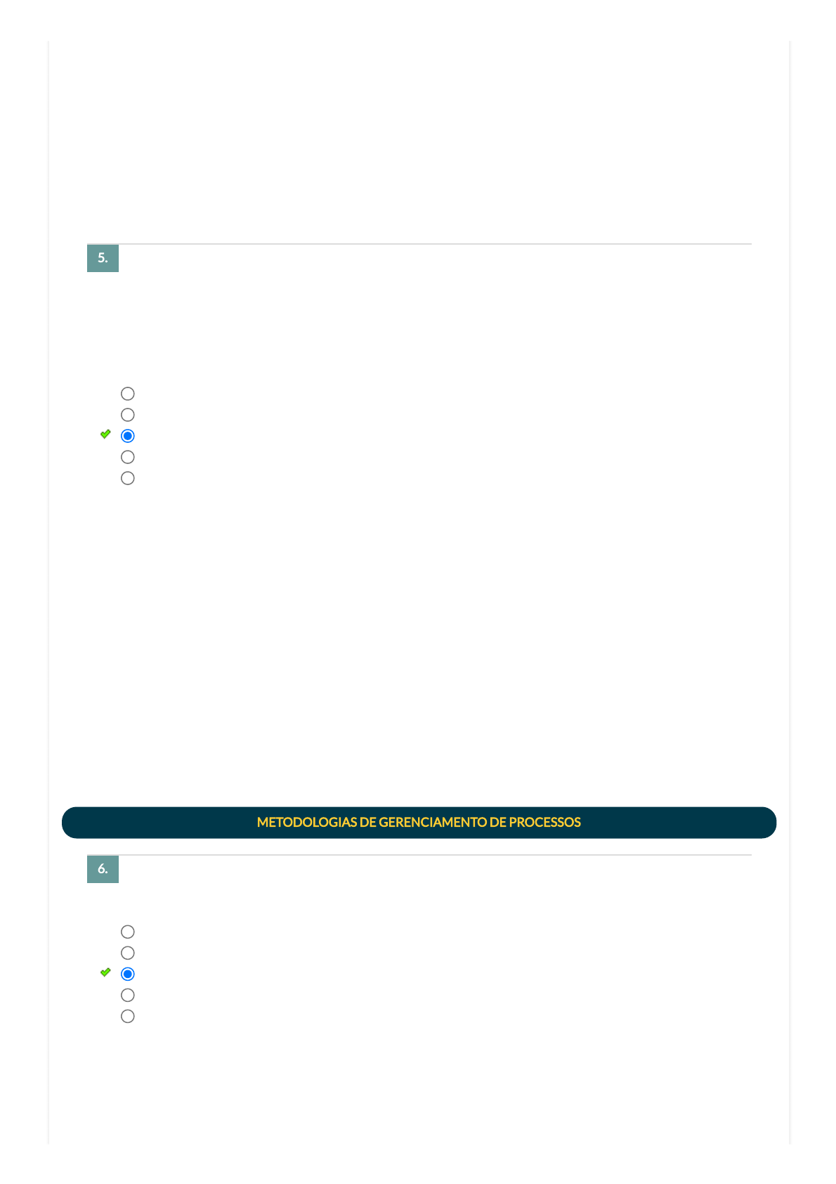 17/11/2023 10:15 Estácio: Alunos https://simulado.estacio.br/alunos/ 3/5 O PPMS é um sistema de gestão do desempenho de processos que busca apresentar uma visão holística deste desempenho. Para isso o PPMS tem as seguintes característica: I. Deve ser focado nos processos II. Deve avaliar o desempenho de toda a organização III. Deve designar um responsável para cada indicador a ser medido Assinale a alternativa que indica os itens corretos: O gerenciamento de processos tem como objetivos aprimorar e otimizar os resultados e para tal é indispensável a utilização de ferramentas de gerenciamento de processos. Para melhor compreensão do gerenciamento de processos, ele pode ser dividido em etapas, são elas: I. Visão �nanceira - correto. II. Visão sociedade - correto. III. Visão sustentatbilidade - incorreto. Visão inovação seria o correto. IV. Visão cliente - correto. V. Visão empregado - correto. 5. I e III, apenas. II e III, apenas. I, II e III. II, apenas. I e II, apenas. Data Resp.: 17/11/2023 10:01:38 Explicação: Um PPMS coleta resultados de forma sistêmica do desempenho dos processos e os compara com dados históricos deles, gerando relatórios com resultados a serem analisados pelos atores importantes do processo. De qualquer forma, o PPMS deve apresentar uma visão holística do desempenho dos processos de negócios. Portanto, três características são necessárias: I. Deve ser focado nos processos II. Deve avaliar o desempenho de toda a organização III. Deve designar um responsável para cada indicador a ser medido METODOLOGIAS DE GERENCIAMENTO DE PROCESSOS 6. Dirigir, modelar, desenvolver e aplicar. Dirigir, projetar, modelar, entregar e desenvolver. Dirigir, projetar, entregar e desenvolver. Dirigir, modelar, entregar e desenvolver. Projetar, entregar, melhorar e aplicar. Data Resp.: 17/11/2023 10:06:29 Explicação: A utilização de ferramentas de gestão é um fator indispensável no gerenciamento de processos, esse gerenciamento pode ser dividido em quatro etapas: Dirigir, projetar, entregar e desenvolver.