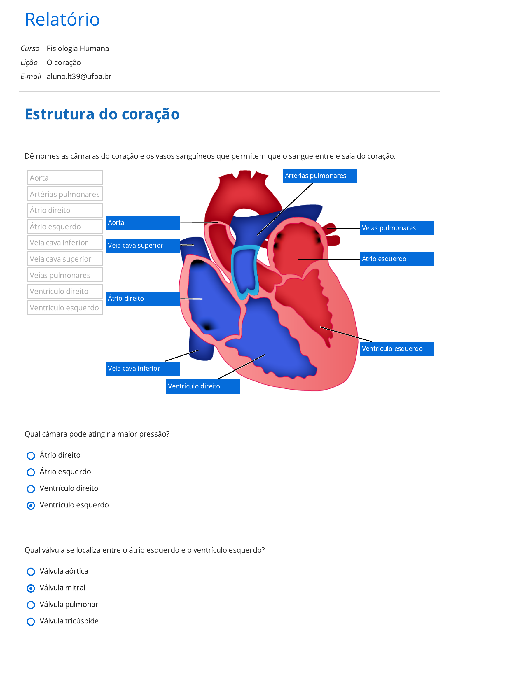Relatório Curso Fisiologia Humana Lição O coração E-mail aluno.lt39@ufba.br Estrutura do coração Dê nomes as câmaras do coração e os vasos sanguíneos que permitem que o sangue entre e saia do coração. Qual câmara pode atingir a maior pressão? Átrio direito Átrio esquerdo Ventrículo direito Ventrículo esquerdo Qual válvula se localiza entre o átrio esquerdo e o ventrículo esquerdo? Válvula aórtica Válvula mitral Válvula pulmonar Válvula tricúspide Aorta Artérias pulmonares Átrio direito Átrio esquerdo Veia cava inferior Veia cava superior Veias pulmonares Ventrículo direito Ventrículo esquerdo Aorta Artérias pulmonares Átrio direito Átrio esquerdo Veia cava inferior Veia cava superior Veias pulmonares Ventrículo direito Ventrículo esquerdo Válvulas cardíacas Identi�que as válvulas do coração. Qual das seguintes a�rmações não é verdadeira em relação ao fechamento de válvulas mitral e tricúspide? As válvulas mitral e tricúspide fecham quando a pressão ventricular excede a pressão atrial. Os músculos papilares e as cordas tendíneas criam tensão sobre as cúspides, e as impedem de se inverter de volta para os átrios. Os músculos papilares se contraem e puxam as cordas tendíneas para fechar as válvulas. Diferenças de pressão entre os ventrículos e os átrios determinam quando as válvulas mitral e tricúspide são abertas e fechadas durante cada batimento cardíaco. Em qual dessas situações estas válvulas estariam abertas? A pressão atrial é maior que a pressão ventricular. A pressão ventricular é maior que a pressão atrial. A pressão ventricular é maior que as pressões aórtica e pulmonar. As pressões aórtica e pulmonar são maiores que a pressão ventricular. Válvula aórtica Válvula mitral Válvula pulmonar Válvula tricúspide Válvula aórtica Válvula mitral Válvula pulmonar Válvula tricúspide Vasos do coração Reorganize as estruturas a seguir para descrever a ordem em que o sangue �ui da circulação sistêmica para os pulmões. Artérias transportam o sangue oxigenado, enquanto veias levam sangue desoxigenado. Verdadeiro Falso Qual estrutura cardíaca contém a menor quantidade de oxigênio? Aorta Veia pulmonar Ventrículo direito Válvula pulmonar Átrio direito Veias cavas Artéria pulmonar Válvula tricúspide Ventrículo direito Pulmões Válvula pulmonar Átrio direito Veias cavas Artéria pulmonar Válvula tricúspide Ventrículo direito Pulmões Ciclo cardíaco Categorize as a�rmações a seguir sobre o coração e a circulação em verdadeiras ou falsas. As cúspides das válvulas aórtica e mitral são mantidas tensas por cordas tendíneas e músculos papilares. As válvulas aórtica e pulmonar não contêm cordas tendíneas e músculos papilares. O sangue na artéria pulmonar tem mais CO2 que o sangue na veia pulmonar. O sangue na artéria pulmonar tem mais O2 que o sangue na veia pulmonar. O ventrículo direito recebe sangue desoxigenado das veias cavas. Usando a imagem acima como guia, complete a tabela abaixo. Para cada fase do ciclo cardíaco, em que estado estão as válvulas AV e semilunares? Observação: a primeira foi preenchida para você. Fase Válvulas AV (mitral e tricúspide) Válvulas semilunares (aórtica e pulmonar) Contração atrial Aberta Fechada Contração isovolumétrica fechada fechada Ejeção ventricular fechada aberta Relaxamento isovolumétrico fechada fechada Enchimento ventricular aberta fechada Os seguintes componentes do ciclo cardíaco ocorrem na diástole e sístole? Contração atrial Contração isovolumétrica Ejeção Enchimento rápido Relaxamento isovolumétrico Verdadeiro Falso Diástole Sístole As cúspides das válvulas aórtica e mitral são mantidas tensas por cordas tendíneas e músculos papilares. As válvulas aórtica e pulmonar não contêm cordas tendíneas e músculos papilares. O sangue na artéria pulmonar tem mais CO2 que o sangue na veia pulmonar. O sangue na artéria pulmonar tem mais O2 que o sangue na veia pulmonar. O ventrículo direito recebe sangue desoxigenado das veias cavas. Contração atrial Contração isovolumétrica Ejeção Enchimento rápido Relaxamento isovolumétrico Diagrama de Wiggers Em que ponto a contração isovolumétrica termina e a ejeção começa? Quando a pressão aórtica excede a pressão ventricular esquerda. Quando a pressão na artéria pulmonar excede a pressão ventricular direita. Quando a pressão ventricular esquerda excede a pressão aórtica. Quando a pressão ventricular excede a pressão atrial. O que acontece quando a pressão ventricular é menor que a pressão atrial? A válvula mitral abre. O sangue �ui para a aorta. O sangue �ui para a artéria pulmonar. Os ventrículos se contraem. Indique onde as válvulas mitral e aórtica abrem e fecham no diagrama de Wiggers. Abertura da válvula aórtica Abertura da válvula mitral Fechamento da válvula aórtica Fechamento da válvula mitral Abertura da válvula aórtica Abertura da válvula mitral Fechamento da válvula aórtica Fechamento da válvula mitral Veri�cação do conhecimento Associe as fases do ciclo cardíaco a seguir com suas descrições. Identi�que as principais estruturas do coração. Contração atrial Ejeção Contração isovolumétrica Relaxamento isovolumétrico Enchimento rápido Átrio esquerdo Ventrículo esquerdo Válvulas atrioventriculares Válvulas semilunares Ventrículo direito Átrio direito Contração atrial Ejeção Contração isovolumétrica Relaxamento isovolumétrico Enchimento rápido Átrio esquerdo Ventrículo esquerdo Válvulas atrioventriculares Válvulas semilunares Ventrículo direito Átrio direito Identi�que as quatro válvulas cardíacas na imagem abaixo. Ordene as etiquetas a seguir para descrever o �uxo de sangue dos pulmões para a circulação sistêmica. Válvula aórtica Válvula mitral Válvula pulmonar Válvula tricúspide Válvula aórtica Válvula mitral Válvula pul