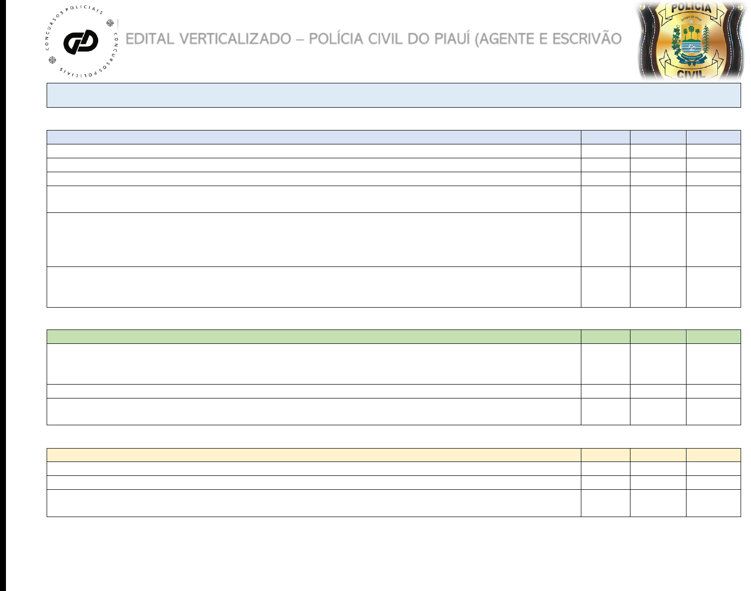 EDITAL VERTICALIZADO – POLÍCIA CIVIL DO PIAUÍ (AGENTE E ESCRIVÃO) www.professorgiovannydias.proluno.com.br 1. CONHECIMENTOS BÁSICOS I - LÍNGUA PORTUGUESA LEI SECA REVISÃO 01 REVISÃO 02 1. Compreensão e interpretação de textos de gêneros variados. 2. Reconhecimento de tipos e gêneros textuais. 3. Domínio da ortografia oficial. 4. Domínio dos mecanismos de coesão textual. 4.1 Emprego de elementos de referenciação, substituição e repetição, de conectores e de outros elementos de sequenciação textual. 4.2 Emprego de tempos e modos verbais. 5. Domínio da estrutura morfossintática do período. 5.1 Emprego das classes de palavras. 5.2 Relações de coordenação entre orações e entre termos da oração. 5.3 Relações de subordinação entre orações e entre termos da oração. 5.4 Emprego dos sinais de pontuação. 5.5 Concordância verbal e nominal. 5.6 Regência verbal e nominal. 5.7 Emprego do sinal indicativo de crase. 5.8 Colocação dos pronomes átomos. 6. Reescrita de frases e parágrafos do texto. 6.1 Significação das palavras. 6.2 Substituição de palavras ou de trechos de texto. 6.3 Reorganização da estrutura de orações e de períodos do texto. 6.4 Reescrita de textos de diferentes gêneros e níveis de formalidade. II – NOÇÕES DE LÓGICA 1) Entendimento da estrutura lógica das relações arbitrárias entre pessoas, lugares, coisas, eventos fictícios; dedução de novas informações das relações fornecidas e avaliar as condições usadas para estabelecer a estrutura daquelas relações. 2) Resolução de situações-problema. 3) As questões desta prova poderão tratar das seguintes áreas: estruturas lógicas, lógicas de argumentação, diagramas lógicos. III - NOÇÕES DE INFORMÁTICA Conceitos básicos de operação de microcomputadores. Noções básicas de operação de microcomputadores em rede local. Operação do sistema operacional Windows 7 e MS-Windows XP: uso de arquivos, pastas e operações mais frequentes, usode aplicativos e ferramentas, uso dos recursos da rede e Painel de controle. Francisco Thiago de Brito Ramos CPF: 02492909360 EDITAL VERTICALIZADO – POLÍCIA CIVIL DO PIAUÍ (AGENTE E ESCRIVÃO) www.professorgiovannydias.proluno.com.br MS Word 2007 – Utilização de janelas e menus; Barras de Ferramentas; Faixa de opções; Estilos; Operações com arquivos; Layout da página; Impressão de documentos econfiguração da impressora; Edição de textos; Voltar e repetir últimos comandos; exibição da página (características emodos de exibição); Utilização de cabeçalhos e rodapés; Formatação no Word; Criação e manipulação de tabelas e textos multicolunados; Correspondências; Revisão; Referências; Proteção de documentos e utilização das ferramentas. Operação da planilha MS-Excel 2007: Utilização de janelas e menus; Barra de ferramentas; Operações com arquivos: Layout dapágina; Confecção, formatação e impressão de planilhas; Comandos copiar, recortar, colar, inserir, voltar e repetir; Revisão; Gráficos; Características e modos de exibição; Utilização de cabeçalhos e rodapés; Dados; Utilização de mesclagemdecélulas, filtro, classificação de dados. Operação do apresentador MS- Power Point 2007: conceitos básicos; principais comandos aplicáveis às lâminas; modelos de apresentação; ferramentas diversas, temas e estilos. Noções de utilização do MS Internet Explorer 8 – Manutenção dos endereços Favoritos; Ferramentas; Utilização do Histórico; Noções de navegação em hipertexto. Segurança da informação e procedimentos de segurança. Procedimentos de backup. CONHECIMENTOS REGIONAIS DO ESTADO DO PIAUÍ O território do Piauí: características gerais e socioeconômicas, formação histórica e dinâmicas recentes. O espaço piauiense: população, economia, urbanização. O espaço agrário piauiense. Aspectos naturais do Piauí: relevo, clima, vegetação e hidrografia. Exploração e usos dos recursos naturais no Piauí. Questão ambiental no Piauí: problemas ambientais, degradação e conservação. Francisco Thiago de Brito Ramos CPF: 02492909360 EDITAL VERTICALIZADO – POLÍCIA CIVIL DO PIAUÍ (AGENTE E ESCRIVÃO) www.professorgiovannydias.proluno.com.br 2. CONHECIMENTOS ESPECÍFICOS I - CONHECIMENTOS GERAIS 1) Relações políticas e socioeconômicas no espaço mundial. 2) Disputas interimperialistas e transformações do espaçocapitalista. 3) Formações dos blocos de poder. 4) Caracterização dos sistemas político-econômicos contemporâneos e suas áreas de influência e disputas; Globalização e Fragmentação do espaço. 5) Conflitos étnicos, políticos e religiosos atuais. 6) Organismos Internacionais. 7) Questão Ambiental: degradação e conservação no âmbito nacional e internacional. 8) Relações econômicas entre o Brasil e o Mundo. II – NOÇÕES DE DIREITO NOÇÕES DE DIREITO ADMINISTRATIVO: 1) Direito administrativo como direito Público. Objeto do direito administrativo. 2) Princípios gerais do direito administrativo. 3) Personalidade de direito público. Conceito de pessoa administrativa. 4) Classificação dos órgãos e funções da administração pública. 5) Competência administrativa: conceito e critérios dedistribuição. Avocação e delegação de competência. 6) Poderes e atos administrativos. 7) Centralização e descentralizaçãoda atividade administrativa do Estado. 8) Administração pública direta e indireta. NOÇÕES DE DIREITO CONSTITUCIONAL: 1) Direitos e garantias fundamentais: direitos e garantias individuais e coletivos; direito à vida, à liberdade, à igualdade, à segurança e à propriedade. 2) Direitos sociais: nacionalidade, cidadania e direitos políticos. Francisco Thiago de Brito Ramos CPF: 02492909360 EDITAL VERTICALIZADO – POLÍCIA CIVIL DO PIAUÍ (AGENTE E ESCRIVÃO) www.professorgiovannydias.proluno.com.br 3) Poder executivo: forma e sistema de governo, chefia de estado e chefi