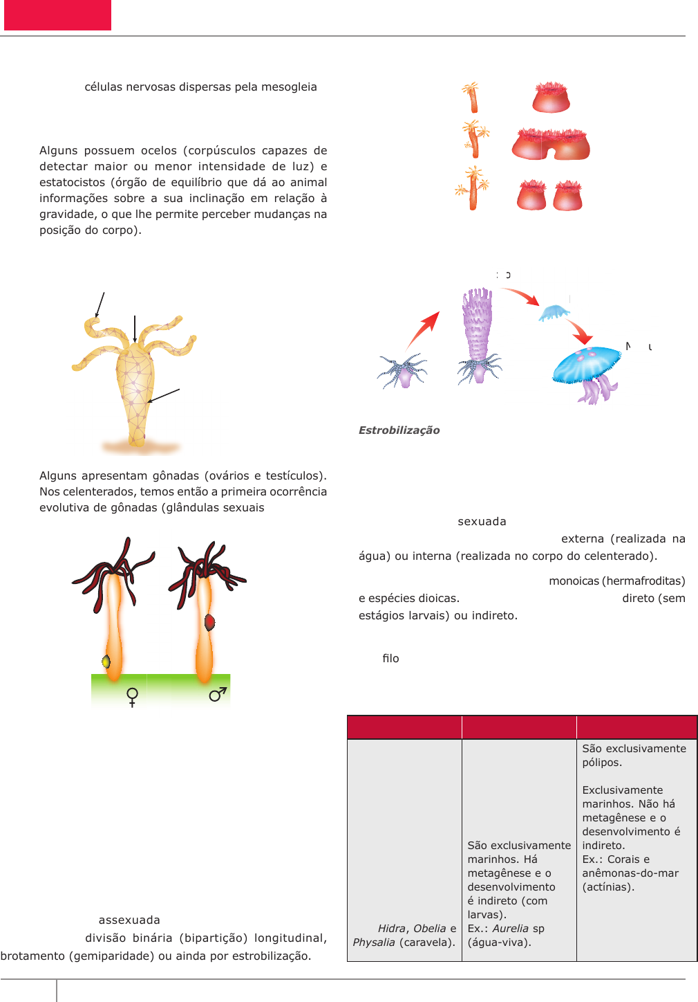 86 Coleção Estudo Frente C Módulo 08 • Há um sistema nervoso difuso, constituído por uma rede de células nervosas dispersas pela mesogleia e que fazem comunicação com células da epiderme e da gastroderme. Assim, nos celenterados, temos a primeira ocorrência evolutiva de um sistema nervoso. Alguns possuem ocelos (corpúsculos capazes de detectar maior ou menor intensidade de luz) e estatocistos (órgão de equilíbrio que dá ao animal informações sobre a sua inclinação em relação à gravidade, o que lhe permite perceber mudanças na posição do corpo). Sistema nervoso da Hydra Tentáculos Células nervosas interligadas Boca • Alguns apresentam gônadas (ovários e testículos). Nos celenterados, temos então a primeira ocorrência evolutiva de gônadas (glândulas sexuais). Ovário Testículo Hidra Hidra Assim como nos poríferos, os sistemas respiratório, circulatório e excretor inexistem nos celenterados. A distribuição de nutrientes se faz por difusão entre as diversas células do corpo, assim como as trocas gasosas (O2 e CO2) e a eliminação de excretas nitrogenados também se fazem por simples difusão. A reprodução pode ser assexuada ou sexuada, ocorrendo em certas espécies o fenômeno da metagênese (alternância de gerações). A reprodução assexuada dos celenterados pode ser realizada por divisão binária (bipartição) longitudinal, brotamento (gemiparidade) ou ainda por estrobilização. A B Reprodução assexuada – A. o broto permanece fixo, formando colônias. B. bipartição. Pólipo Estrobilização Éfira MedusausduedMMM çççããoooo Éfira Estrobilização num pólipo – Na estrobilização, o corpo do pólipo sofre uma série de divisões transversais, originando segmentos discoidais, denominados éfiras, que são formas elementares de medusas. Cada éfira, ao se desenvolver, origina uma medusa adulta. A reprodução sexuada se faz por fecundação, que, dependendo da espécie, pode ser externa (realizada na água) ou interna (realizada no corpo do celenterado). Quanto ao sexo, existem espécies monoicas (hermafroditas) e espécies dioicas. O desenvolvimento pode ser direto (sem estágios larvais) ou indireto. No desenvolvimento indireto, há uma larva ciliada, a plânula. O filo dos celenterados está subdividido em três classes: Hidrozoa (hidrozoários), Scyphozoa (cifozoários) e Anthozoa (antozoários). Hidrozoários Cifozoários Antozoários Possuem pólipos bem desenvolvidos com fase de medusa pequena (hidromedusas) ou ausente. Em algumas espécies, há metagênese. São marinhos ou dulcícolas e têm desenvolvimento direto ou indireto (com larvas). Ex.: Hidra, Obelia e Physalia (caravela). Predominam as grandes medusas (cifomedusas). Os pólipos, chamados cifístomas, são de pequeno tamanho e de vida curta. São exclusivamente marinhos. Há metagênese e o desenvolvimento é indireto (com larvas). Ex.: Aurelia sp (água-viva). São exclusivamente pólipos. Não há medusas. Exclusivamente marinhos. Não há metagênese e o desenvolvimento é indireto. Ex.: Corais e anêmonas-do-mar (actínias). Leticia Realce Leticia Realce Leticia Realce Leticia Realce Leticia Realce Leticia Realce Leticia Realce Leticia Realce Leticia Realce Leticia Realce Leticia Realce Leticia Realce Leticia Realce Leticia Realce Leticia Realce Leticia Realce Leticia Realce Poríferos e celenterados 87Editora Bernoulli B IO LO G IA EXERCÍCIOS DE FIXAÇÃO 01. (OSEC-SP) Espongiários são animais A) exclusivamente aquáticos. B) pseudocelomados. C) diblásticos. D) triblásticos. E) com metagênese. 02. (UNIRIO-RJ) Qual das alternativas a seguir justifica a classificação das esponjas no sub-reino Parazoa? A) Ausência de epiderme B) Ocorrência de fase larval C) Inexistência de orgãos ou de tecidos bem definidos D) Hábitat exclusivamente aquático E) Reprodução unicamente assexuada 03. (PUCPR) Em relação ao Phylum Cnidaria, foram feitas as seguintes proposições: I. Os cnidários são aquáticos, diblásticos e com simetria radial, sendo encontrados em duas formas: pólipos (fixos) e medusa (livres). II. A digestão nos cnidários é extra e intracelular e não há aparelho respiratório, circulatório ou excretor, e o sistema nervoso é difuso. III. Nos cnidários, a reprodução sexuada ocorre por brotamento ou estrobilização. IV. Os corais e a anêmona-do-mar são exemplos da classe dos cifozoários. Assinale a alternativa CORRETA. A) Todas estão incorretas. B) Apenas III e IV estão corretas. C) Apenas I está correta. D) Todas estão corretas. E) Apenas I e II estão corretas. 04. (OSEC-SP) Entre as alternativas a seguir, assinale o principal avanço evolutivo dado pelos celenterados, mantido e desenvolvido pelos animais mais evoluídos. A) Presença de células urticantes B) Digestão extracelular C) Passagem do meio aquático para o terrestre D) Sistema circulatório E) Tubo digestório completo 05. (UFPR) Relacione as colunas e assinale a alternativa CORRETA. (1) Coanócitos (2) Células nervosas (3) Átrio (4) Mesênquima (5) Cnidoblastos ( ) Cavidade central das esponjas ( ) Células de defesa dos celenterados ( ) Mesogleia, abaixo da epiderme ( ) Digestão intracelular dos poríferos ( ) Camada média da estrutura dos poríferos A) 3 – 2 – 5 – 1 – 4 B) 5 – 3 – 2 – 1 – 4 C) 5 – 2 – 3 – 1 – 4 D) 3 – 5 – 2 – 4 – 1 E) 3 – 5 – 2 – 1 – 4 EXERCÍCIOS PROPOSTOS 01. (PUC Minas) Quando fazemos um corte longitudinal em uma esponja ascoide, como na figura a seguir, encontraremos, revestindo o átrio ou espongiocele, A) cnidócitos. B) celomócitos. C) coanócitos. D) células enzimático-glandulares. E) células mioepiteliais. Leticia Realce Leticia Realce Leticia Realce Leticia Realce Leticia Realce Leticia Realce Leticia Realce Leticia Realce 88 Coleção Estudo Frente C Módulo 08 06. (UFJF-MG) Observe as seguintes afirmativas: I. A grande capacidade regenerativa das esponjas revela a pequena interd