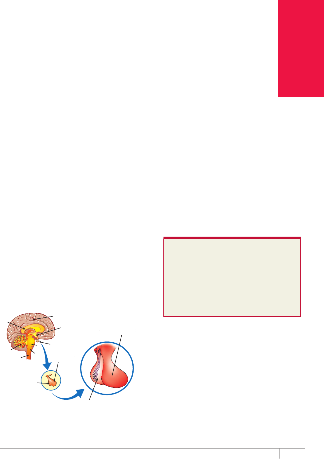 25Editora Bernoulli MÓDULO O sistema endócrino é formado por todas as glândulas endócrinas do organismo. As glândulas endócrinas ou glândulas de secreção interna são produtoras de hormônios. Por isso, o sistema endócrino é também conhecido por sistema hormonal. Hormônios são substâncias de natureza química variável (polipeptídeos, esteroides, etc.) que atuam como mensageiros bioquímicos, isto é, atuam a distância do local onde são produzidos, chegando aos seus “órgãos-alvos” através da corrente sanguínea. Os hormônios controlam as atividades de órgãos, tecidos, células, bem como a taxa de muitas substâncias no organismo. No decorrer deste módulo, estudaremos os principais componentes do nosso sistema endócrino. HIPÓFISE (GLÂNDULA PITUITÁRIA, GLÂNDULA-MESTRA) Localiza-se numa cavidade (sela túrcica) do osso esfenoide (que forma a base ou assoalho da caixa craniana). Tem, aproximadamente, o tamanho de um grão de ervilha e está ligada ao hipotálamo (uma região do encéfalo) pelo infundíbulo, um pedículo de estrutura nervosa. Lobo posterior Lobo anterior Lobo anterior ou adeno-hipófise A B H G F D C E Lobo posterior ou neuro-hipófise ior Lobo anterior ou adeno-hipófise Localização da hipófise – a. cérebro; b. corpo caloso; c. hipotálamo; d. hipófise; e. cerebelo; f. protuberância; g. bulbo; h. medula raquiana. Em aumento (à direita), a hipófise com os seus dois lados. Nos mamíferos, a hipófise apresenta duas partes bem desenvolvidas: a parte anterior (lobo anterior ou adeno-hipófise) e a parte posterior (lobo posterior ou neuro-hipófise). Há, ainda, a parte intermediária (pars intermedia), que, na espécie humana, é muito reduzida. Adeno-hipófise Corresponde à porção anterior (lobo anterior) da glândula. Produz, armazena e libera, na corrente sanguínea, diversos hormônios. Os hormônios da adeno-hipófise que atuam sobre outras glândulas e órgãos, estimulando suas atividades e desenvolvimento, são chamados genericamente de hormônios tróficos. Hormônios produzidos pela adeno-hipófise • Hormônio somatotrófico (STH) ou somatotrofina. • Hormônio tireotrófico (TSH) ou tireotrofina. • Hormônio adrenocorticotrófico (ACTH) ou adrenocorticotrofina. • Hormônios gonadotróficos (gonadotrofinas h ipof isár ias): FSH (hormônio fo l ícu lo estimulante) e LH (hormônio luteinizante). • Hormônio lactogênico ou prolactina. A) Hormônio somatotrófico (STH), somatotrofina ou GH – Estimula todo o crescimento do organismo, atuando, sobretudo, na cartilagem epifisária dos ossos longos. É conhecido como o “hormônio do crescimento”, sendo produzido durante a fase de crescimento (infância e adolescência) e, em menor escala, na fase adulta. A sigla GH origina-se do inglês growth hormone. A somatotrofina estimula o fígado e, provavelmente, outros órgãos a produzirem proteínas chamadas somatomedinas, que estimulam o crescimento dos ossos e das cartilagens. Esse hormônio tem importante função anabolizante, ou seja, é responsável pelo aumento da síntese proteica, pela maior mobilização de gorduras para a liberação de mais energia e pela estimulação do crescimento de músculos e ossos. BIOLOGIA FRENTE Sistema endócrino 07 B 26 Coleção Estudo Frente B Módulo 07 A produção escassa desse hormônio na infância acarreta o chamado nanismo hipof isár io, que se caracteriza pelo pequeno crescimento do organismo. Por outro lado, a sua produção excessiva na infância leva a um quadro conhecido por gigantismo hipofisário, caracterizado pelo crescimento exagerado do organismo. No adulto, a produção excessiva do STH leva à acromegalia, anomalia que se caracteriza pelo crescimento exagerado das extremidades ósseas e cartilaginosas, como os ossos dos dedos (mãos e pés), mandíbula (osso do queixo), etc. Vale lembrar que, no adulto, após o desaparecimento das cartilagens epifisárias, não há mais o crescimento dos ossos em comprimento. Assim, o excesso de STH acaba estimulando o crescimento dos ossos em largura, que se tornam, então, mais grossos. Dessa forma, os ossos da face (ossos do nariz, mandíbula, etc.) se alargam, chegando, às vezes, a modificar completamente a fisionomia da pessoa. B) Hormônio tireotrófico (TSH) ou tireotrofina – Estimula a glândula tireoide a produzir seus hormônios, isto é, estimula a produção dos hormônios tireoidianos, indispensáveis ao perfeito desenvolvimento físico e mental das pessoas. C) Hormônio adrenocorticotrófico (ACTH) ou adrenocorticotrofina – Estimula o córtex (parte periférica) das glândulas suprarrenais (adrenais). Ao receber o ACTH, o córtex das glândulas suprarrenais passa a produzir hormônios que são conhecidos genericamente por corticosteroides ou corticoides. D) Hormônios gonadotróficos ou gonadotrofinas – Estimulam as atividades das gônadas (glândulas sexuais): ovários e testículos. Entre esses hormônios, destacam-se: D.1) Hormônio folículo estimulante (FSH) – Nos ovários (gônadas femininas), estimula o desenvolvimento dos folículos ovarianos e a produção de estrógenos (hormônios sexuais femininos). Nos testículos (gônadas masculinas), o FSH estimula a espermatogênese, isto é, a formação dos espermatozoides (gametas masculinos). D.2) Hormônio luteinizante (LH) – Nos ovários, promove a ovulação (liberação do “óvulo”) e atua no corpo lúteo (corpo amarelo), estimulando a produção de progesterona (hormônio sexual feminino). Nos testículos, o LH estimula a produção de testosterona (hormônio sexual masculino) pelas chamadas células intersticiais de Leydig. Por isso, no sexo masculino, o LH também pode ser chamado de hormônio estimulante das células intersticiais (ICSH). E) Hormônio lactogênico ou prolactina – Atuando sinergicamente com outros hormônios, como a progesterona e os estrógenos, a prolactina promove o crescimento e o funcionamento das glândulas m