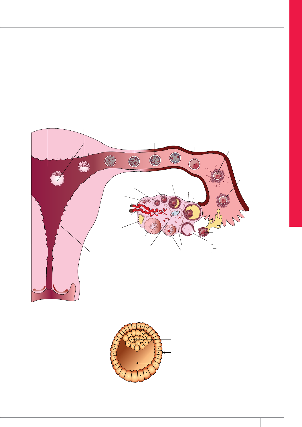 Embriologia animal 21Editora Bernoulli B iO LO g iA DESENVOLViMENTO EMBRiONÁRiO HuMANO A espécie humana pertence ao grupo dos mamíferos eutérios, animais que têm como uma de suas principais características a formação de uma placenta bem-desenvolvida durante o desenvolvimento embrionário, por isso são também conhecidos como mamíferos placentários. O desenvolvimento embrionário humano inicia-se na tuba uterina, após a ocorrência da fecundação, com a formação da célula-ovo (zigoto). Por meio dos movimentos peristálticos tubários e do movimento de varredura dos cílios das células epiteliais que revestem a cavidade tubária, o ovo é levado em direção ao útero. Durante essa trajetória, que dura cerca de 4 a 5 dias, o ovo humano, que é do tipo alécito, realiza uma segmentação holoblástica igual, formando uma mórula que, por sua vez, origina uma blástula, conhecida também por blastocisto. Parede posterior do útero Blastocistos Mórula Estágio de oito células Estágio de quatro células Estágio de duas células Zigoto Fertilização Ovócito na tuba Ovócito Folículo maduro Folículo próximo da maturidadeFolículo secundário Folículo em crescimento Folículo primário inicial Vasos sanguíneos Epitélio Corpo albicans Corpo lúteo maduro Folículo em atresia (em degeneração) Folículo roto Tecido conjuntivo Tecido coagulado Corpo lúteo em desenvolvimento Ovócito liberado Endométrio Segmentação na espécie humana – A segmentação (clivagem) do zigoto com a formação da mórula ocorre enquanto o zigoto em divisão passa pela tuba uterina. Normalmente, a formação do blastocisto (blástula) se dá no útero. 3 2 1 Blastocisto humano – O blastocisto possui uma cavidade denominada blastocele (1). As células distendidas que formam sua parede constituem o trofoblasto (2), que dará origem à parte embrionária da placenta. Apresenta ainda um aglomerado de blastômeros em um dos polos, o embrioblasto (3), também conhecido por massa celular interna ou, ainda, nó embrionário. Do embrioblasto virão todas as células que vão constituir o embrião propriamente dito. 22 Coleção Estudo Frente A Módulo 12 Zona pelúcida Massa celular interna Blastômeros MórulaBlástula jovem Blastocisto Trofoblasto Zigoto Membrana plasmática Espaço perivitelino Segmentação – Apesar de a clivagem aumentar o número de células (blastômeros), as células-filhas são menores do que as células-mães. O embrião só começa a aumentar de tamanho depois da degeneração da zona pelúcida. A zona pelúcida é uma camada de glicoproteínas que envolve o ovócito II, o óvulo e o ovo (zigoto), e persiste até as primeiras fases do desenvolvimento, degenerando-se no estágio mais avançado de blástula. Na cavidade uterina, cerca de 6 dias após a fecundação, a blástula (blastocisto) perde a zona pelúcida, permitindo, assim, que as células trofoblásticas entrem em contato com o endométrio, iniciando o processo de nidação, que consiste na fixação da blástula no endométrio, geralmente pelo lado adjacente à massa celular interna. Durante essa implantação, o trofoblasto diferencia-se em duas camadas: citotrofoblasto e sinciciotrofoblasto. O primeiro corresponde à região onde as células mantêm suas características celulares, enquanto o segundo corresponde à região onde as células formam um sincício. A figura a seguir ilustra o início do processo de nidação. Glândulas do endométrio Conjuntivo do endométrio Epitélio do endométrio Sinciciotrofoblasto Blastocele Embrioblasto Região da cavidade uterina Citotrofoblasto Capilar sanguíneo Nidação – Além de ajudar na fixação do blastocisto no endométrio, o sinciciotrofoblasto passa a produzir o hormônio HCG (gonadotrofina coriônica), que atuará no ovário impedindo, durante certo tempo, a degeneração do corpo lúteo, mantendo-o em atividade, produzindo progesterona, hormônio necessário durante todo o período de gestação. Juntamente com parte do endométrio, o trofoblasto formará a placenta, anexo embrionário que, entre outras funções, nutre o embrião até o final da gravidez. Embriologia animal 23Editora Bernoulli B iO LO g iA Dando continuidade ao desenvolvimento, células do trofoblasto liberam enzimas proteolíticas sobre o endométrio, abrindo espaço para a implantação da blástula. As células do embrioblasto se multiplicam e se organizam de modo a formar duas cavidades, a vesícula amniótica e a vesícula vitelínica, separadas pelo disco embrionário, conforme mostra a figura a seguir: Vesícula amniótica Disco embrionário Vesícula vitelínica Ectoderma extraembrionário Endoderma extraembrionário Epiblasto (ectoderma embrionário) Hipoblasto (endoderma embrionário) A vesícula amniótica dará origem, posteriormente, à bolsa amniótica ou âmnio, anexo embrionário que tem como função proteger o embrião contra choques mecânicos e também contra a desidratação. Em muitos animais vertebrados, a vesícula vitelínica ou saco vitelínico armazena o vitelo (substância nutritiva para o embrião). Mas, nos mamíferos eutérios, cuja nutrição do embrião é feita pela placenta, a vesícula vitelínica atrofia-se gradativamente. Convém ressaltar, entretanto, que, no início da embriogênese, a vesícula vitelínica constitui o primeiro órgão hematopoiético (formador do sangue). As células que formam o assoalho da vesícula amniótica constituem o epiblasto (ectoderma embrionário), e as que formam o teto da vesícula vitelínica formam o hipoblasto (endoderma embrionário). Essas duas camadas de células (epiblasto + hipoblasto) formam o disco embrionário (disco dérmico). Do disco embrionário, vão se originar todos os constituintes do embrião. As demais células que delimitam as vesículas amniótica e vitelínica formam, respectivamente, o ectoderma extraembrionário e o endoderma extraembrionário. Com a continuidade do desenvolvimento, c