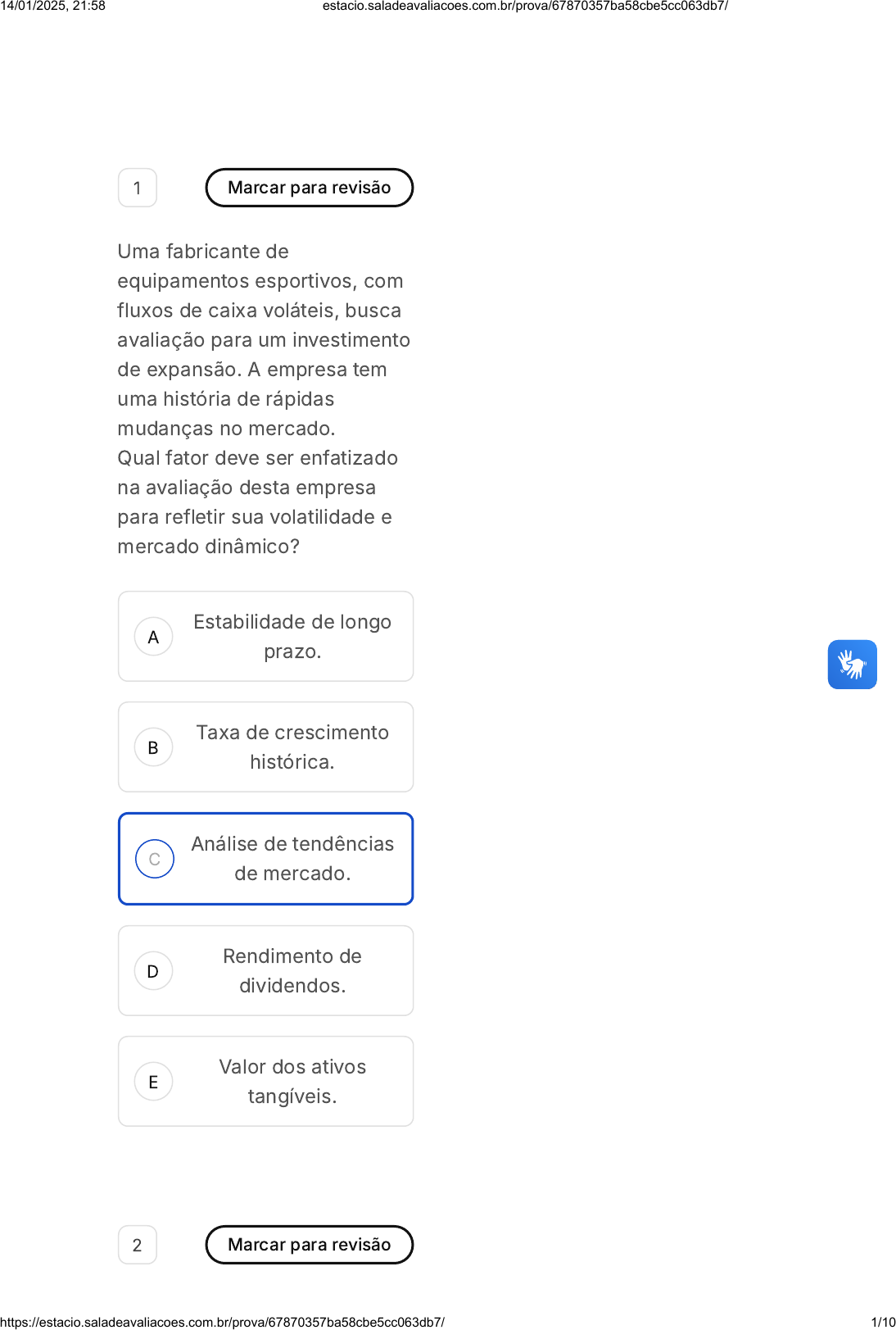 A B C D E 1 Marcar para revisão Uma fabricante de equipamentos esportivos, com fluxos de caixa voláteis, busca avaliação para um investimento de expansão. A empresa tem uma história de rápidas mudanças no mercado. Qual fator deve ser enfatizado na avaliação desta empresa para refletir sua volatilidade e mercado dinâmico? Estabilidade de longo prazo. Taxa de crescimento histórica. Análise de tendências de mercado. Rendimento de dividendos. Valor dos ativos tangíveis. 2 Marcar para revisão 14/01/2025, 21:58 estacio.saladeavaliacoes.com.br/prova/67870357ba58cbe5cc063db7/ https://estacio.saladeavaliacoes.com.br/prova/67870357ba58cbe5cc063db7/ 1/10 A B C D E Uma startup do setor de energia renovável está sendo avaliada para receber investimentos. Seu modelo de negócios é baseado em tecnologia disruptiva, mas ainda não é lucrativa. Qual critério de avaliação é mais crítico para esta startup, dada a sua fase atual de desenvolvimento? Lucratividade atual. Potencial de mercado. Ativos fixos. Relação dívida/capital. Histórico de lucros. 3 Marcar para revisão Fusões e aquisições são eventos relevantes na vida de todas as corporações que vivenciam esse tipo de operação, com o poder de afetar investidores e demais stakeholders das empresas. Nesse sentido, a opção que melhor define o conceito de fusões e aquisições seria: 14/01/2025, 21:58 estacio.saladeavaliacoes.com.br/prova/67870357ba58cbe5cc063db7/ https://estacio.saladeavaliacoes.com.br/prova/67870357ba58cbe5cc063db7/ 2/10 A B C D E Processos de reestruturação societária, que têm como pano de fundo a união de ativos, com a intenção de criação de valor Processos de compra de empresas, que têm como pano de fundo a intenção de criação de valor. Processos de reestruturação societária, que têm como pano de fundo a compra e venda de ativos, com a intenção de criação de valor. Processos de compra ou união de ativos, que têm como pano de fundo a criação de valor Processos de reestruturação societária, que têm como pano de fundo a fusão de ativos, com a intenção de criação de valor 14/01/2025, 21:58 estacio.saladeavaliacoes.com.br/prova/67870357ba58cbe5cc063db7/ https://estacio.saladeavaliacoes.com.br/prova/67870357ba58cbe5cc063db7/ 3/10 A B C D E 4 Marcar para revisão Uma empresa cíclica no setor de construção civil está passando por uma avaliação para uma possível fusão. A natureza cíclica do negócio implica em variações significativas nos seus fluxos de caixa. Qual aspecto é mais importante considerar na avaliação desta empresa para refletir adequadamente sua natureza cíclica? Estabilidade de longo prazo nos lucros. Histórico de dividendos. Variação sazonal dos fluxos de caixa. Projeção de crescimento de mercado. Análise do balanço patrimonial. 5 Marcar para revisão 14/01/2025, 21:58 estacio.saladeavaliacoes.com.br/prova/67870357ba58cbe5cc063db7/ https://estacio.saladeavaliacoes.com.br/prova/67870357ba58cbe5cc063db7/ 4/10 A B C D E Uma rede de restaurantes com vários estabelecimentos está sendo avaliada para uma possível venda. A empresa tem uma operação estável e um modelo de negócio consolidado. Qual é o método de avaliação mais indicado para esta rede de restaurantes, dada a sua estabilidade e modelo de negócio consolidado? Avaliação relativa. Fluxo de caixa descontado. Análise de risco de mercado. Avaliação de ativos intangíveis. Projeção de tendências futuras. 6 Marcar para revisão Uma empresa de tecnologia em fase de crescimento rápido está explorando a possibilidade de abrir capital. Sua avaliação é desafiadora devido à rápida expansão e inovação. 00 hora : 29 min : 17 seg Ocultar Questão 9 de 10 Respondidas �10� Em branco �0� Finalizar prova 1 2 3 4 5 6 7 8 9 10 SM2 Análise De Investimentos 14/01/2025, 21:58 estacio.saladeavaliacoes.com.br/prova/67870357ba58cbe5cc063db7/ https://estacio.saladeavaliacoes.com.br/prova/67870357ba58cbe5cc063db7/ 5/10 A B C D E Qual método de avaliação é mais relevante para esta empresa, considerando sua rápida expansão e inovação? Avaliação por múltiplos de mercado. Valor presente líquido. Fluxo de caixa descontado. Análise de ativos fixos. Custo médio ponderado de capital. 7 Marcar para revisão Uma empresa farmacêutica está sendo avaliada para uma aquisição. Ela tem um forte pipeline de produtos em desenvolvimento, mas poucos produtos no mercado. Qual abordagem de avaliação é mais adequada para esta empresa, considerando seu pipeline de produtos em desenvolvimento? 14/01/2025, 21:58 estacio.saladeavaliacoes.com.br/prova/67870357ba58cbe5cc063db7/ https://estacio.saladeavaliacoes.com.br/prova/67870357ba58cbe5cc063db7/ 6/10 A B C D E A B Análise de fluxo de caixa histórico. Projeção de vendas futuras. Valor dos ativos correntes. Avaliação de ativos intangíveis. Lucro por ação. 8 Marcar para revisão Uma empresa de biotecnologia, em fase inicial, está buscando investidores. Seu valor está altamente ligado à pesquisa inovadora, embora ainda não tenha produtos no mercado. Na avaliação desta empresa de biotecnologia, qual método fornece a melhor perspectiva sobre seu valor potencial? Análise de fluxo de caixa histórico. Valor presente líquido. 14/01/2025, 21:58 estacio.saladeavaliacoes.com.br/prova/67870357ba58cbe5cc063db7/ https://estacio.saladeavaliacoes.com.br/prova/67870357ba58cbe5cc063db7/ 7/10 C D E A B C Avaliação por múltiplos de mercado. Avaliação de ativos intangíveis. Custo médio ponderado de capital. 9 Marcar para revisão Em uma empresa de capital fechado, inovadora no setor de tecnologia, uma avaliação precisa é crucial para atrair investidores. A equipe financeira está considerando diferentes métodos de avaliação para apresentar o valor justo da empresa. Qual é o método mais adequado para avaliar esta empresa, considerando sua natureza inovadora e setor de atuação? Avaliação por múltiplos de mercado. 