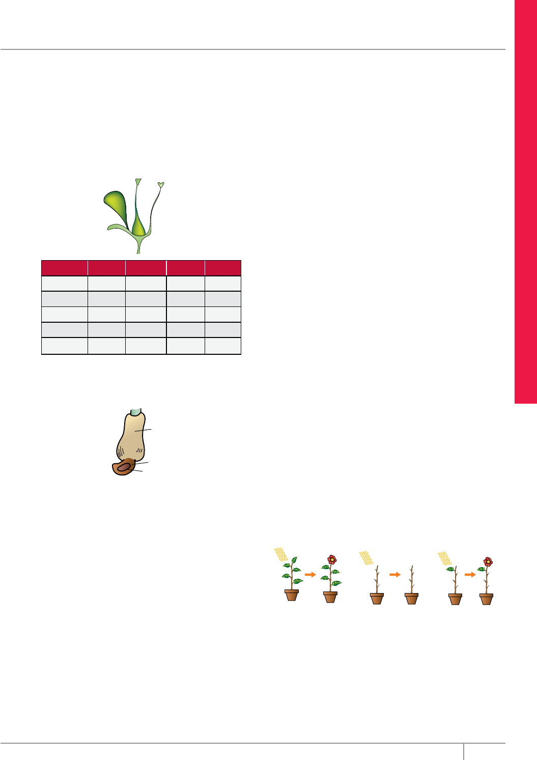 Organologia vegetal 121Editora Bernoulli B iO LO g iA Indique a alternativa em que todas as classificações estão CORRETAS. A) 1 – 2 – 6 – 8 D) 3 – 5 – 6 – 9 B) 1 – 2 – 4 – 6 E) 3 – 5 – 7 – 8 C) 2 – 4 – 7 – 9 02. (UFMG) Qual das alternativas apresenta a relação CORRETA entre as estruturas da flor e os números indicados na figura? IV III II I V I II III IV V A) Pedúnculo estame estigma sépala pétala B) Pedúnculo estame gineceu pétala sépala C) Pecíolo estilete estame pétala sépala D) Pedúnculo antera ovário sépala pétala E) Pecíolo estame estigma pétala sépala 03. (FCMMG) Considere as áreas apontadas como I, II e III em um caju. Assinale a opção que encerra uma afirmação CORRETA com relação à figura. I II III A) I provém do ovário da flor. B) II provém do pedúnculo floral. C) I é o falso fruto e é comestível. D) II é a semente comestível. E) III é o verdadeiro fruto. 04. (UFPI) A porção dilatada sobre a qual se inserem os verticilos florais é denominada A) verticilos de proteção. B) receptáculo. C) ovário. D) pedúnculo. E) verticilos de reprodução. 05. (UFMG) A parte comestível de uma planta é variável (raiz, folha, etc.), dependendo da espécie vegetal. Seria INCORRETO dizer que o que se come A) da couve-flor é a flor. D) da cebola é o bulbo. B) do nabo é a raiz. E) da noz é a semente. C) do amendoim é o fruto. 06. (PUC Minas) O processo reprodutivo envolvido na origem de frutos sem sementes é A) neotenia. D) poliembrionia. B) partenocarpia. E) cissiparidade. C) pedogênese. 07. (PUC Minas) Marília encomendou, num supermercado virtual, frutas, hortaliças e legumes. Ao receber a encomenda, relatou para o marido que, no pacote de legumes, comprou abobrinhas, batatinha, vagem, quiabo, cenoura, berinjela e ervilha em vagem. De legume mesmo, no conceito de botânica, ela conseguiu quantos exemplares dos citados? A ) 1 B) 2 C) 3 D) 4 E) 5 08. (UFJF-MG) Plantas cujo florescimento é influenciado pelo comprimento do dia e da noite apresentam o fenômeno de fotoperiodismo. Uma planta A, de dia curto, apresenta fotoperíodo crítico de 15 horas de iluminação. Outra planta B, de dia longo, apresenta fotoperíodo crítico de 13 horas de iluminação. Entre as opções a seguir, assinale aquela que corresponde ao fotoperíodo no qual essas duas plantas poderão florescer simultaneamente. A) 11 horas de iluminação C) 14 horas de iluminação B) 16 horas de iluminação D) 12 horas de iluminação 09. (UFJF-MG) Em certas espécies de vegetais, a floração é controlada não só pelo fotoperiodismo, mas também por um período de frio para que ela seja induzida. Na natureza, esse período corresponde ao inverno, porém, em laboratório, podemos substituí-lo por um período em que o vegetal é submetido a baixas temperaturas. A esse efeito indutor da floração chamamos A) termoterapia. D) vernalização. B) resfriamento. E) compensação. C) estratificação. 10. (UFMG) Este esquema refere-se a um experimento realizado para estudar a floração em três plantas da mesma espécie que foram submetidas ao mesmo tempo de exposição à luz (fotoperíodo). Luz Luz Luz ausência de floração floração floração Com base nos resultados observados, todas as conclusões são possíveis, ExCETO A) O tratamento fotoperiódico de uma única folha ou de toda a planta produz o mesmo efeito. B) A floração da planta depende da retirada de algumas folhas. C) A planta sem folhas não apresenta fotoperiodismo. D) A planta intacta floresce após um fotoperiodismo adequado. 122 Coleção Estudo Frente D Módulo 22 11. (UFRJ) A distribuição das folhas de uma planta ao longo dos nós presentes no caule segue padrões de organização conhecidos como filotaxia. Na “filotaxia oposta”, as folhas aparecem aos pares em cada nó e cada folha está diretamente oposta à outra. Além disso, o par de um nó forma ângulo de 90° com os pares imediatamente superior e inferior. Em geral, os nós são também distantes entre si. 90º ExPLIQUE a importância da filotaxia oposta para os processos metabólicos das plantas. SEçãO ENEM 01. Alguns vegetais apresentam órgãos que consumimos como alimento. Um aluno de uma escola de Ensino Médio recebeu de seu professor de Biologia uma lista de diversos vegetais considerados comestíveis. Com essa lista, o aluno elaborou o quadro a seguir, onde, com o sinal (x), indicou o órgão da planta utilizado como principal alimento. Vegetais comestíveis Raiz Caule Fruto Pseudofruto Batata-inglesa x Azeitona x Tomate x Manga x Pera x Mandioca x Maçã x Cenoura x Cebola x Morango x Pepino x Após analisar o quadro, o professor informou ao aluno que ele havia cometido alguns erros. Com base nos conhecimentos de organologia vegetal, o número de erros cometidos pelo aluno foi A) dois. D) cinco. B) três. E) seis. C) quatro. 02. Em uma feira-livre, os produtos hortifrutigranjeiros que estavam à venda foram distribuídos em diversas bancas cujas placas indicavam as partes dos vegetais que normalmente utilizamos em nossa alimentação. Nas bancas 1, 2 e 3 eram encontrados os seguintes produtos: 3 CEBOLA CENOURA REPOLHO COUVE ALFACE BETERRABA RABANETE ESPINAFRE TOMATE CHUCHU PEPINO BERINGELA 1 2 RAÍZES FOLHAS FRUTOS Considerando critérios exclusivamente botânicos, a distribuição desses produtos está correta na(s) banca(s) A) 1, 2 e 3. B) 1 e 2, apenas. C) 1 e 3, apenas. D) 2 e 3, apenas. E) 2, apenas. gABARiTO Fixação 01. E 02. D 03. C 04. C 05. D Propostos 01. C 02. B 03. C 04. B 05. C 06. B 07. B 08. C 09. D 10. B 11. A filotaxia oposta reduz o autossombreamento das folhas, permitindo maior captação da luz solar, necessária aos processos fotossintéticos. Seção Enem 01. C 02. D 123Editora Bernoulli MóDuLO Os conhecimentos das funções das plantas, adquiridos pelas observações e por meio de pesquisas experimentais, muito têm contribuído para o desenvolvimento de importantes técnic