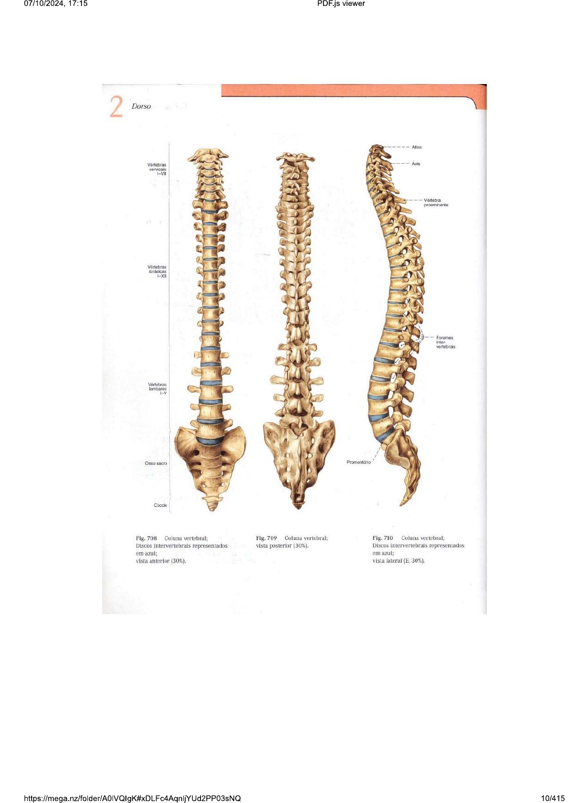 07/10/2024, 17:15 PDF.js viewer 2 Dorso Atlas Axis cervicais proeminente Vértebras torácicas I-XII Forames inter- vertebrais Vertebras lombares I-V Osso sacro Promontório Coluna vertebral; Fig. 709 Coluna vertebral; Coluna vertebral; Discos intervertebrais representados vista posterior Discos intervertebrais representados em azul; em azul; vista anterior (30%). vista lateral (E, 30%). 10/415Coluna Vertebral 3 Clavicula cervical VI cervical VII cervical VII torácica Canal vertebral Úmero Extremidade esternal Escápula Costela do Corpo do esterno Arco costal Costela XI Costela XII Costela XI lombar Costela XII lombar III Espinha Sacro Cóccix Face sinfisial Espinha Fémur Fig. 711 Coluna vertebral, cingulo peitoral Fig. 712 Coluna vertebral, cingulo peitoral e cíngulo pélvico; e pélvico; Coluna vertebral cortada no plano mediano; Coluna vertebral cortada no plano mediano; vista medial (E, 25%). vista lateral (E, 25%). 107/10/2024, 17:15 PDF.js viewer 4 Dorso Lâmina do vertebral Incisura vertebral superior Proc. articular Forame costotransversário Proc. espinhoso superior Fóvea costal superior Pedículo do arco vertebral Articulação Proc. articular Face costotransversária superior intervertebral Proc. transverso Costela Proc. transverso costal do processo anular* transverso Proc. costal do espinhoso processo transverso Corpo da costela Forame vertebral vertebral Proc. articular Colo da costela do inferior vertebral Face Cabeça da costela intervertebral costal superior Fóvea costal inferior Articulação da cabeça da costela Epilise Incisura vertebral inferior anular* Corpo Face intervertebral Fig. 713 Características estruturais tendo como modelo Características estruturais tendo como exemplo uma uma quinta vértebra torácica; quinta vértebra torácica; vista lateral (80%). vista superior (80%). *Também chamada: crista marginal crista marginal Características estruturais das vértebras típicas (Exceto Atlas e Áxis) 7 Vértebras cervicais 12 Vértebras torácicas 5 Vértebras lombares Sacro Vértebras cervicais torácicas lombares de 5 vértebras 1-VII I-XII I-V [Vértebras sacrais I-V] Face terminal do corpo Retangular, pequeno Forma básica triangu- Faseoliforme, grande vertebral (placa de com unco do corpo lar arredondada em tura, ou seja, placa basilar) na face terminal direção caudal Forame vertebral Grande, seção trans- Seção transversal Pequeno, seção Canal sacral, seção versal triangular arredondada transversal triangular transversal oval Proce. articulares escarpado Orientado frontal- Parte lateral: dirigida Fundido com a crista para trás mente, escarpado sagitalmente; Parte sacral medial para trás medial: dirigida frontalmente transversos Possui um Claviforme com Procc. mamilares Fundido com a crista anterior, um tubérculo fóveas costais e acessórios sacral lateral posterior e um sulco para 0 nervo espinal, bem como um forame transversário Procc. espinhosos Horizontal, curto, Diferentemente Horizontal, achatado Fundido com a crista dividido com duas escarpados, dirigi- lateralmente, sacral mediana pontas dos para baixo mente construído Integração do Parte anterior do Proc. Nenhum, porque Procc. costais Partes laterais rudimento costal transverso e tubérculo as costelas são (Unco parietal) dorsal desenvolvidas Sinais característicos Forame Fóveas costais Procc. mamilares Vértebras fundidas por transversário superior inferior e acessórios sinostose 12/4155 a d b e Fig. 715a-e Características regionais das vértebras. na região da coluna vertebral torácica material derivado dos arcos parietais (representados em tom mais escuro) tornou-se independente na forma de a vértebra cervical, Atlas vértebra, cervical vértebra torácica, costela correspondente e esterno d vértebra lombar e Sacro Epifise Proc. articular superior Corpo vertebral Proc. espinhoso Proc. costal Proc. acessório Fig. 716 Desenvolvimento vertebral. Desenvolvimento vertebral. Aparecimento dos centros ósseos primários Na do corpo vertebral aparecem, no oitavo mês de vida, 2° mês fetal; corpo, mês fetal) tendo como exemplo centros ósseos anulares (= "crista marginal"*) que se unem uma vértebra lombar. A sinostose dos centros dos arcos ao corpo vertebral até ano de vertebrais com os centros do corpo tem lugar entre 0 As partes centrais das epífises durante toda a 6° ano de vida, como placas de cartilagem hialina** Nos processos formam-se centros ósseos secundários (Apófises). 13/41507/10/2024, 17:15 PDF.js viewer 6 Dorso Tubérculo anterior Arco anterior do atlas Forame vertebral Face articular superior Massa lateral Parte do atlas basilar occipital Proc. Forame transverso magno Fossa condilar Forame Sulco da artéria (Crista Plano vertebral occipital occipital externa) Arco posterior do atlas posterior Fig. 719 Primeira vértebra cervical, Pormenor com forame magno e 0 côndilo para a vista superior (85%). articulação atlanto-occipital; A face articular superior do atlas está, vista inferior (80%). dividida; *Variação: canal da artéria vertebral. anterior Arco anterior do atlas Dente do áxis Face articular inferior Face articular superior Fóvea do dente Face Massa lateral articular Face articular inferior do atlas anterior Fóvea posterior do atlas do dente Proc. articular Proc. superior transverso Proc. Forame Corpo vertebral espinhoso vertebral Forame Arco vertebral Forame Arco posterior do atlas transversário Proc. articular inferior Tubérculo posterior Fig. 720 Primeira vértebra cervical, Atlas; Fig. 721 Primeira e segunda vértebras vista inferior (85%). Atlas Corte vista medial (90%). Ápice do dente Face articular posterior do dente Face articular articular anterior superior Dente do Forame Proc. articular transverso superior transverso anterior Forame transversário Forame vertebral Proc. articular posterior articular Arco vertebral inferior Arco vertebral Corpo vertebral Proc. espinhoso espinhoso Fig. 722 Segunda vértebra cervical,