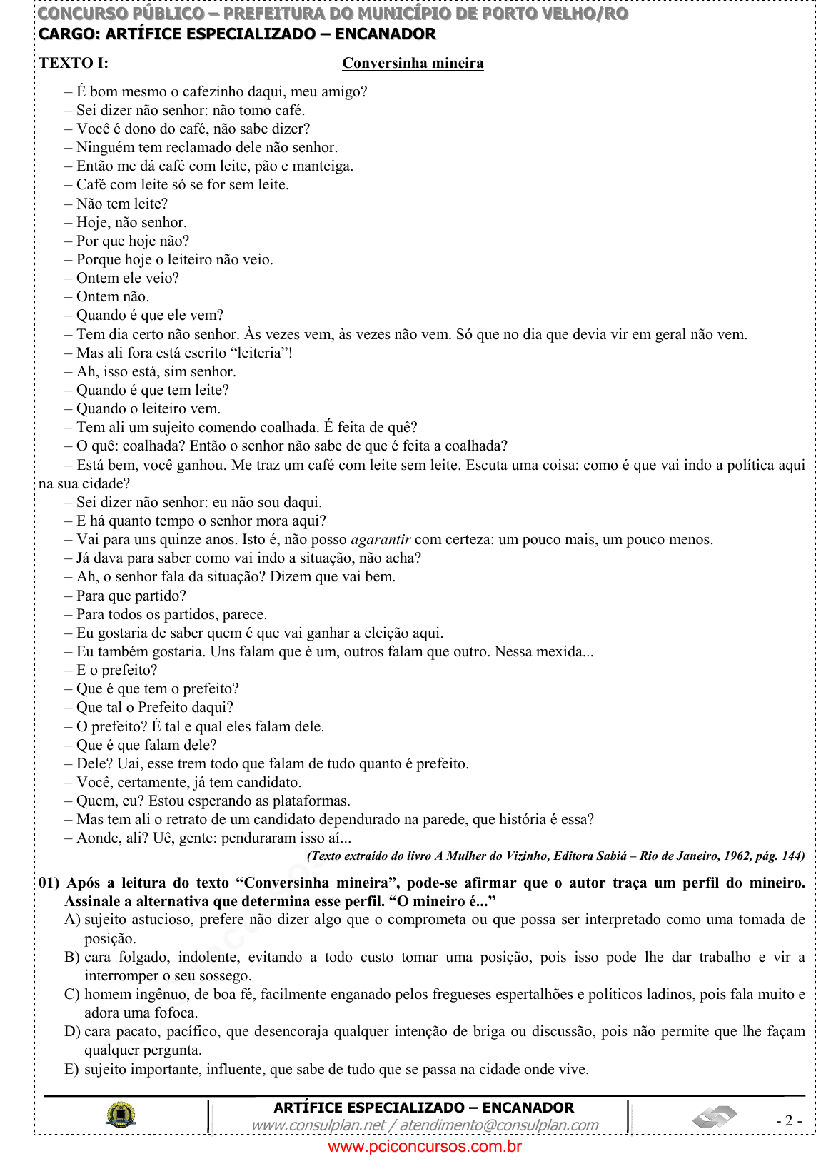 pcimarkpci MjgwNDowN2Y3OmRmMDE6OTdiNzo3MGE4OmU5YmQ6M2M0ODowY2Rm:TW9uLCAyNyBKYW4gMjAyNSAxNDoyNzo0MiAtMDMwMA== www.pciconcursos.com.br CCCOOONNNCCCUUURRRSSSOOO PPPÚÚÚBBBLLLIIICCCOOO ––– PPPRRREEEFFFEEEIIITTTUUURRRAAA DDDOOO MMMUUUNNNIIICCCÍÍÍPPPIIIOOO DDDEEE PPPOOORRRTTTOOO VVVEEELLLHHHOOO///RRROOO ARTÍFICE ESPECIALIZADO – ENCANADOR www.consulplan.net / atendimento@consulplan.com - 2 - CCAARRGGOO:: AARRTTÍÍFFIICCEE EESSPPEECCIIAALLIIZZAADDOO –– EENNCCAANNAADDOORR TEXTO I: Conversinha mineira – É bom mesmo o cafezinho daqui, meu amigo? – Sei dizer não senhor: não tomo café. – Você é dono do café, não sabe dizer? – Ninguém tem reclamado dele não senhor. – Então me dá café com leite, pão e manteiga. – Café com leite só se for sem leite. – Não tem leite? – Hoje, não senhor. – Por que hoje não? – Porque hoje o leiteiro não veio. – Ontem ele veio? – Ontem não. – Quando é que ele vem? – Tem dia certo não senhor. Às vezes vem, às vezes não vem. Só que no dia que devia vir em geral não vem. – Mas ali fora está escrito “leiteria”! – Ah, isso está, sim senhor. – Quando é que tem leite? – Quando o leiteiro vem. – Tem ali um sujeito comendo coalhada. É feita de quê? – O quê: coalhada? Então o senhor não sabe de que é feita a coalhada? – Está bem, você ganhou. Me traz um café com leite sem leite. Escuta uma coisa: como é que vai indo a política aqui na sua cidade? – Sei dizer não senhor: eu não sou daqui. – E há quanto tempo o senhor mora aqui? – Vai para uns quinze anos. Isto é, não posso agarantir com certeza: um pouco mais, um pouco menos. – Já dava para saber como vai indo a situação, não acha? – Ah, o senhor fala da situação? Dizem que vai bem. – Para que partido? – Para todos os partidos, parece. – Eu gostaria de saber quem é que vai ganhar a eleição aqui. – Eu também gostaria. Uns falam que é um, outros falam que outro. Nessa mexida... – E o prefeito? – Que é que tem o prefeito? – Que tal o Prefeito daqui? – O prefeito? É tal e qual eles falam dele. – Que é que falam dele? – Dele? Uai, esse trem todo que falam de tudo quanto é prefeito. – Você, certamente, já tem candidato. – Quem, eu? Estou esperando as plataformas. – Mas tem ali o retrato de um candidato dependurado na parede, que história é essa? – Aonde, ali? Uê, gente: penduraram isso aí... (Texto extraído do livro A Mulher do Vizinho, Editora Sabiá – Rio de Janeiro, 1962, pág. 144) 01) Após a leitura do texto “Conversinha mineira”, pode-se afirmar que o autor traça um perfil do mineiro. Assinale a alternativa que determina esse perfil. “O mineiro é...” A) sujeito astucioso, prefere não dizer algo que o comprometa ou que possa ser interpretado como uma tomada de posição. B) cara folgado, indolente, evitando a todo custo tomar uma posição, pois isso pode lhe dar trabalho e vir a interromper o seu sossego. C) homem ingênuo, de boa fé, facilmente enganado pelos fregueses espertalhões e políticos ladinos, pois fala muito e adora uma fofoca. D) cara pacato, pacífico, que desencoraja qualquer intenção de briga ou discussão, pois não permite que lhe façam qualquer pergunta. E) sujeito importante, influente, que sabe de tudo que se passa na cidade onde vive. www.pciconcursos.com.br pcimarkpci MjgwNDowN2Y3OmRmMDE6OTdiNzo3MGE4OmU5YmQ6M2M0ODowY2Rm:TW9uLCAyNyBKYW4gMjAyNSAxNDoyNzo0MiAtMDMwMA== www.pciconcursos.com.br CCCOOONNNCCCUUURRRSSSOOO PPPÚÚÚBBBLLLIIICCCOOO ––– PPPRRREEEFFFEEEIIITTTUUURRRAAA DDDOOO MMMUUUNNNIIICCCÍÍÍPPPIIIOOO DDDEEE PPPOOORRRTTTOOO VVVEEELLLHHHOOO///RRROOO ARTÍFICE ESPECIALIZADO – ENCANADOR www.consulplan.net / atendimento@consulplan.com - 3 - 02) Pode-se afirmar que o dono da leiteria se encaixa perfeitamente na expressão “como bom mineiro que é...”, pois respondeu a quase todas as perguntas de modo A) provocante. B) desonesto. C) objetivo. D) evasivo. E) cruel. 03) Em relação à linguagem do texto, pode-se afirmar que a A) diferença de linguagem entre os interlocutores se dá por serem de diferentes países. B) linguagem do dono da leiteria denuncia sua ignorância e sua falta de estudo. C) diferença de linguagem entre os interlocutores não os impede de estabelecer um diálogo. D) linguagem de ambos é inadequada para a situação em que se encontram. E) linguagem de ambos é sempre polida e obedece aos padrões estabelecidos pela norma. TEXTO II: Nós, os brasileiros Uma editora europeia me pede que traduza poemas de autores estrangeiros sobre o Brasil. Como sempre, eles falam da floresta Amazônica, uma floresta muito pouco real, aliás. Um bosque poético, com “mulheres de corpos alvíssimos espreitando entre os troncos das árvores, [...]”. Não faltam flores azuis, rios cristalinos e tigres mágicos. Traduzo os poemas por dever de ofício, mas com uma secreta – e nunca realizada – vontade de inserir ali um grãozinho de realidade. Nas minhas idas (nem tantas) ao exterior, onde convivi, sobretudo, com escritores ou professores e estudantes universitários – portanto, gente razoavelmente culta – eu fui invariavelmente surpreendida com a profunda ignorância a respeito de quem, como e o que somos. – A senhora é brasileira? Comentaram espantados alunos de uma universidade americana famosa. – Mas a senhora é loira! Depois de ler, num congresso de escritores em Amsterdã, um trecho de um dos meus romances traduzido em inglês, ouvi de um senhor elegante, dono de um antiquário famoso, que segurou comovido minhas duas mãos: – Que maravilha! Nunca imaginei que no Brasil houvesse pessoas cultas! Pior ainda, no Canadá alguém exclamou incrédulo: – Escritora brasileira? Ué, mas no Brasil existem editoras? A culminância foi a observação de uma crítica berlinense, num artigo sobre um romance meu editado por lá, acrescentando, a alguns elogios, a grave restrição: “porém não pa