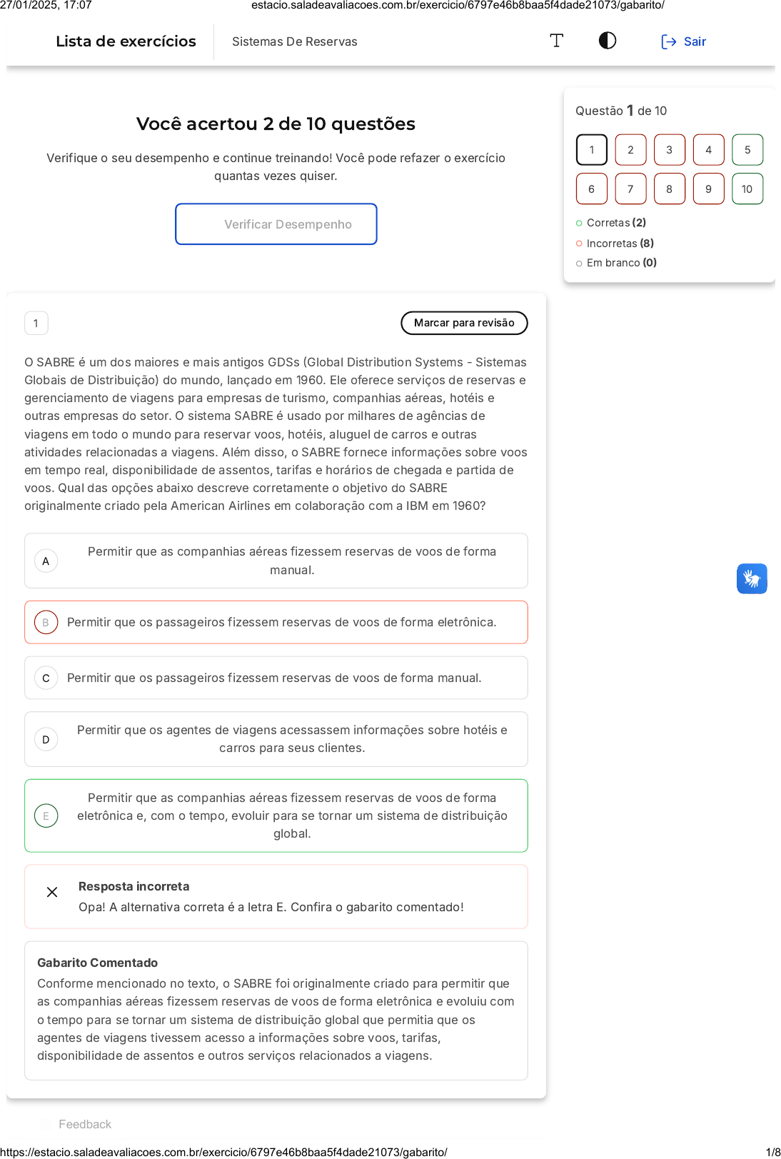 Você acertou 2 de 10 questões Verifique o seu desempenho e continue treinando! Você pode refazer o exercício quantas vezes quiser. Verificar Desempenho A B C D E 1 Marcar para revisão O SABRE é um dos maiores e mais antigos GDSs (Global Distribution Systems - Sistemas Globais de Distribuição) do mundo, lançado em 1960. Ele oferece serviços de reservas e gerenciamento de viagens para empresas de turismo, companhias aéreas, hotéis e outras empresas do setor. O sistema SABRE é usado por milhares de agências de viagens em todo o mundo para reservar voos, hotéis, aluguel de carros e outras atividades relacionadas a viagens. Além disso, o SABRE fornece informações sobre voos em tempo real, disponibilidade de assentos, tarifas e horários de chegada e partida de voos. Qual das opções abaixo descreve corretamente o objetivo do SABRE originalmente criado pela American Airlines em colaboração com a IBM em 1960? Permitir que as companhias aéreas fizessem reservas de voos de forma manual. Permitir que os passageiros fizessem reservas de voos de forma eletrônica. Permitir que os passageiros fizessem reservas de voos de forma manual. Permitir que os agentes de viagens acessassem informações sobre hotéis e carros para seus clientes. Permitir que as companhias aéreas fizessem reservas de voos de forma eletrônica e, com o tempo, evoluir para se tornar um sistema de distribuição global. Resposta incorreta Opa! A alternativa correta é a letra E. Confira o gabarito comentado! Gabarito Comentado Conforme mencionado no texto, o SABRE foi originalmente criado para permitir que as companhias aéreas fizessem reservas de voos de forma eletrônica e evoluiu com o tempo para se tornar um sistema de distribuição global que permitia que os agentes de viagens tivessem acesso a informações sobre voos, tarifas, disponibilidade de assentos e outros serviços relacionados a viagens. Questão 1 de 10 Corretas (2) Incorretas (8) Em branco (0) 1 2 3 4 5 6 7 8 9 10 Lista de exercícios Sistemas De Reservas Sair Feedback 27/01/2025, 17:07 estacio.saladeavaliacoes.com.br/exercicio/6797e46b8baa5f4dade21073/gabarito/ https://estacio.saladeavaliacoes.com.br/exercicio/6797e46b8baa5f4dade21073/gabarito/ 1/8 A B C D E A B 2 Marcar para revisão A consulta de disponibilidade aérea no GDS Amadeus pode ser feita por meio de vários comandos, dependendo do tipo de pesquisa que se deseja realizar. Qual é o comando utilizado para realizar a pesquisa de voos na tela inicial do GDS Amadeus? SU. FQ. SS. SD. SP. Resposta incorreta Opa! A alternativa correta é a letra D. Confira o gabarito comentado! Gabarito Comentado O comando utilizado para realizar a pesquisa de voos na tela inicial do GDS Amadeus é o "SD", seguido da data, cidade de origem e cidade de destino, separados por espaços. Este comando exibe uma lista de voos disponíveis na data escolhida, com informações como horários, companhias aéreas, conexões, número de voo, duração do voo e classe tarifária. Os outros comandos mencionados (SU, FQ e SS) são utilizados para refinar a pesquisa adicionando mais informações, como horários específicos, companhias aéreas ou classes tarifárias. 3 Marcar para revisão A venda online, também conhecida como e-commerce, é uma forma de comércio eletrônico que permite a compra e venda de produtos ou serviços através da internet. Os clientes podem acessar as lojas virtuais e fazer seus pedidos a qualquer momento, de qualquer lugar, usando dispositivos eletrônicos como computadores, tablets ou smartphones. As lojas virtuais oferecem diversas formas de pagamento, desde cartão de crédito até boleto bancário, além de garantias e políticas de troca e devolução para assegurar a satisfação do cliente. A venda online tornou-se uma alternativa conveniente e segura para muitos consumidores e tem crescido significativamente nos últimos anos. Qual é o principal objetivo da versão Selling Platform do GDS Amadeus? Permitir o acesso ao GDS Amadeus por meio de APIs. Oferecer soluções de gerenciamento de vendas, marketing e finanças para agências de viagens. 27/01/2025, 17:07 estacio.saladeavaliacoes.com.br/exercicio/6797e46b8baa5f4dade21073/gabarito/ https://estacio.saladeavaliacoes.com.br/exercicio/6797e46b8baa5f4dade21073/gabarito/ 2/8 C D E A B C D E Permitir que as companhias aéreas vendam bilhetes de avião diretamente aos consumidores finais. Oferecer um aplicativo para dispositivos móveis que permite que os agentes de viagens acessem o conteúdo do GDS Amadeus em qualquer lugar. Permitir que as companhias aéreas planejam as rotas dos voos. Resposta incorreta Opa! A alternativa correta é a letra B. Confira o gabarito comentado! Gabarito Comentado A versão Selling Platform é um software instalado nos computadores dos agentes de viagens que permite acesso ao GDS Amadeus e oferece ferramentas para pesquisa, reserva e gerenciamento de voos, hotéis, carros e outros serviços de viagem. Além disso, a versão também oferece soluções de gerenciamento de vendas, marketing e finanças para agências de viagens. 4 Marcar para revisão Existem várias vantagens do uso de um GDS (Global Distribution System - Sistema Global de Distribuição) por um agente de viagens. Algumas das principais vantagens incluem: Comodidade é uma dessas vantagens: os agentes de viagens podem acessar o GDS de qualquer lugar, a qualquer hora, desde que tenham uma conexão com a internet. Isso significa que eles podem trabalhar remotamente e ainda ter acesso a todas as informações e recursos necessários para planejar e reservar viagens para seus clientes. Qual das seguintes afirmações é verdadeira em relação ao uso de um GDS por um agente de viagens? Um GDS não oferece acesso remoto aos agentes de viagens. Um GDS só permite que os agentes de viagens acessem informações sobre voos. O acesso a um GDS é limitado apenas a agentes de viagens de grandes empresas. Um GDS oferece comodidade aos agentes d